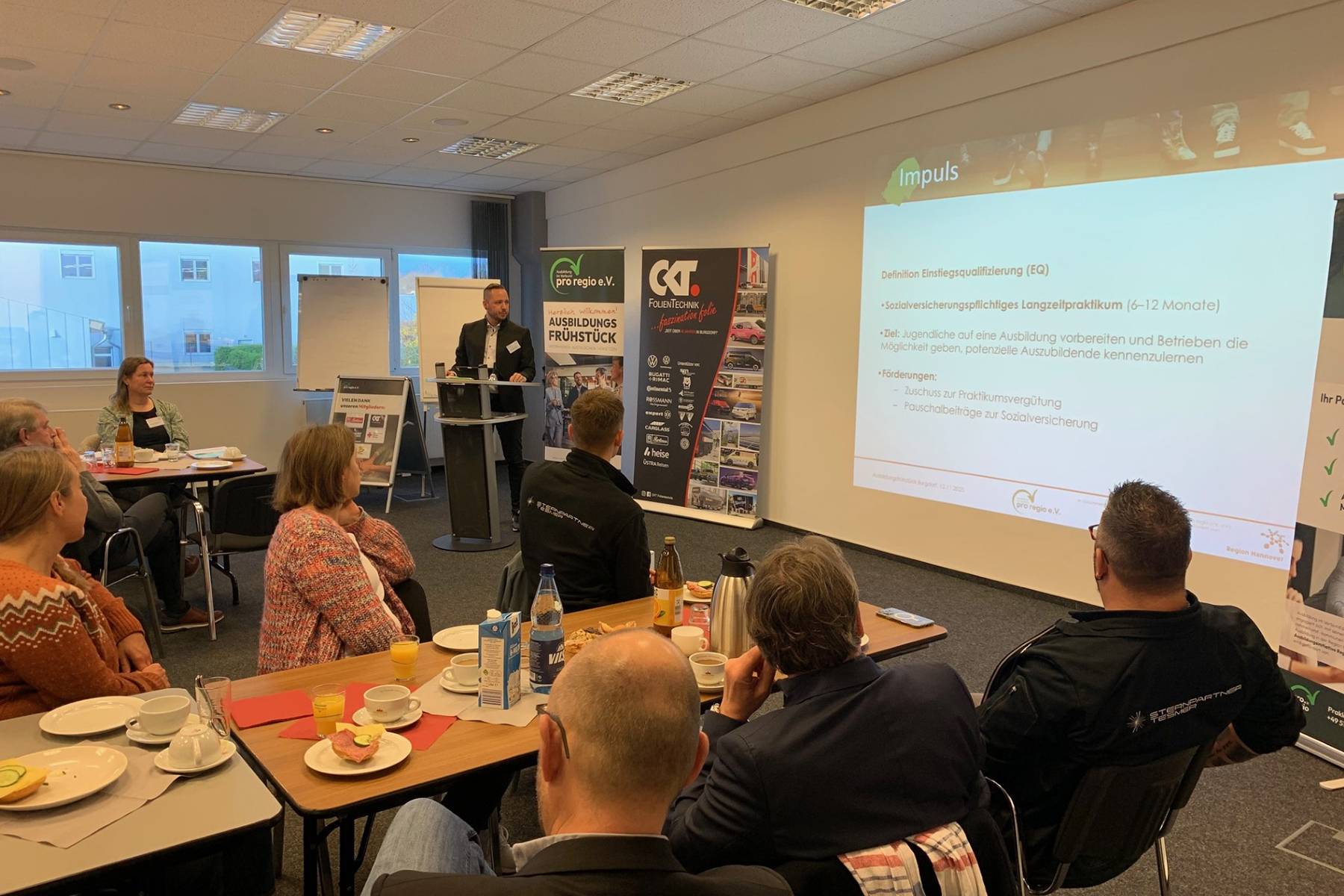 Im Zentrum der Veranstaltung standen zwei Impulsvorträge, die auf großes Interesse stießen und lebhafte Diskussionen anregten. Thomas Lattner, Geschäftsführer der CKT. FolienTechnik GmbH, präsentierte praxisnahe Einblicke in die erfolgreiche Nutzung von Einstiegsqualifizierungen (EQ) vor Ausbildungsbeginn im eigenen Unternehmen. Einige Teilnehmer kannten die EQ nicht, und so konnten direkt vor Ort Fragen zur EQ von der Agentur für Arbeit geklärt werden. Dina de Haas von pro regio / KAUSA-Landesstelle Niedersachsen gab wertvolle Empfehlungen für die Ausbildung von Jugendlichen mit Migrations- und Fluchthintergrund und zeigte Unterstützungsangebote auf. Vor allem die Unterstützungsangebote für Sprachkurse, speziell für die Ausbildung, stießen auf reges Interesse.