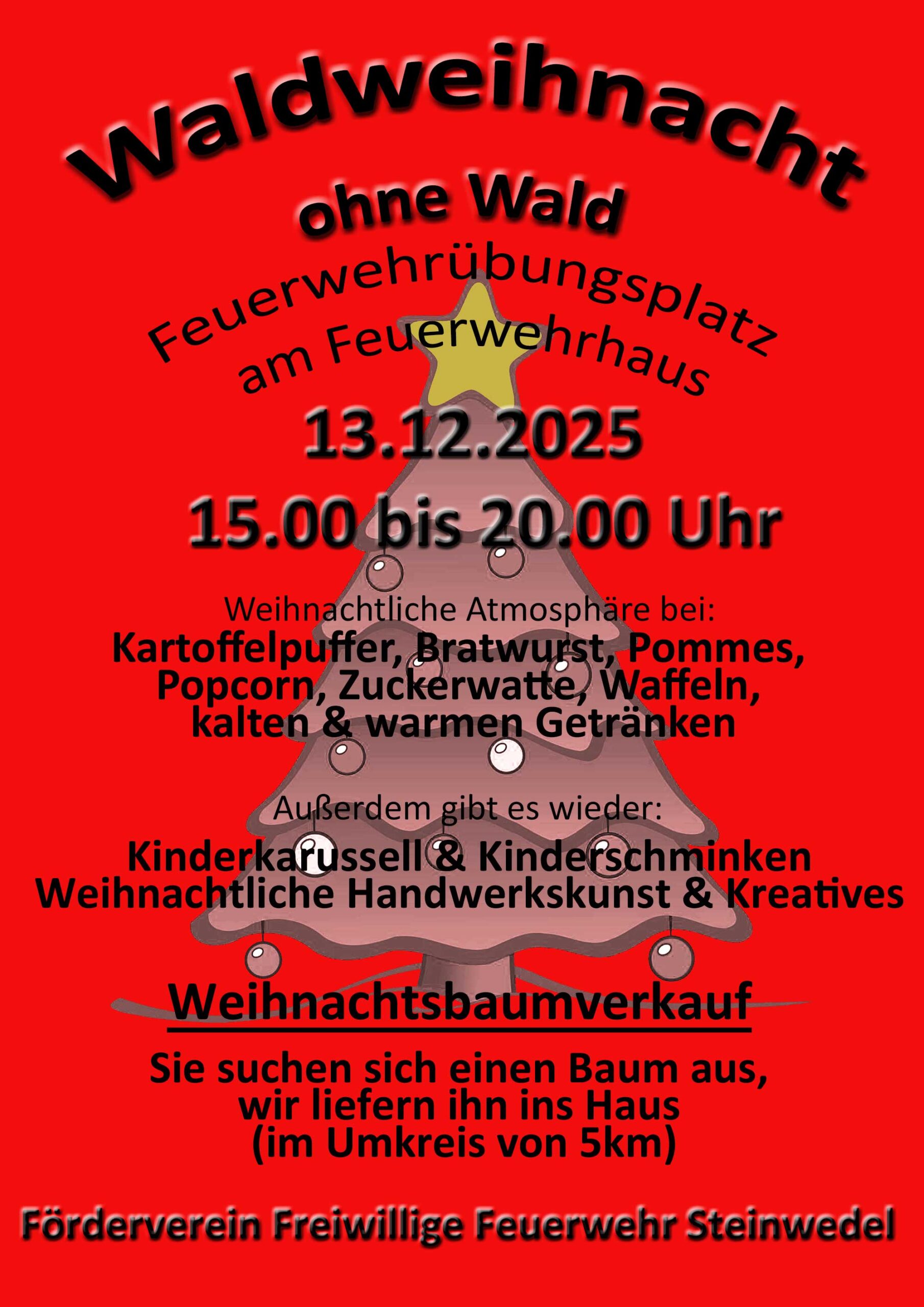 Auch der Weihnachtsbaumverkauf ist wieder Teil der Veranstaltung. Besucher können ihren Baum direkt auswählen, auf Wunsch wird dieser im Umkreis von fünf Kilometern nach Hause geliefert. Die Feuerwehr Steinwedel und der Förderverein freuen sich auf viele Gäste.