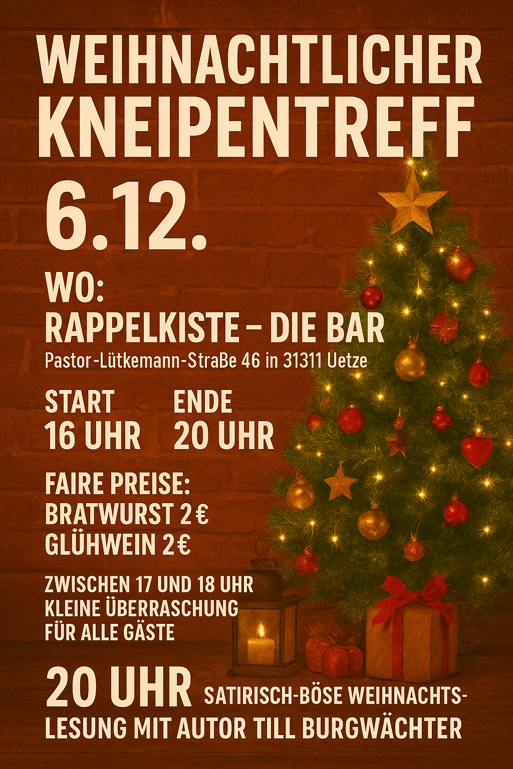 In der Uetzer Kultkneipe „Rappelkiste – Die Bar“ steht am kommenden Sonnabend, 6. Dezember 2025, ein besonderer Nikolaustag bevor. Am Nachmittag findet vor der Traditionsgaststätte an der Pastor-Lütkemann-Straße 46 ein kleiner „Adventszauber“ mit Bratwurst und Glühwein statt, am Abend folgt ab 20 Uhr eine satirisch-böse Weihnachtslesung mit dem Braunschweiger Autor Till Burgwächter. Der Eintritt ist frei, für die Abendveranstaltung ist jedoch eine Platzreservierung erforderlich.