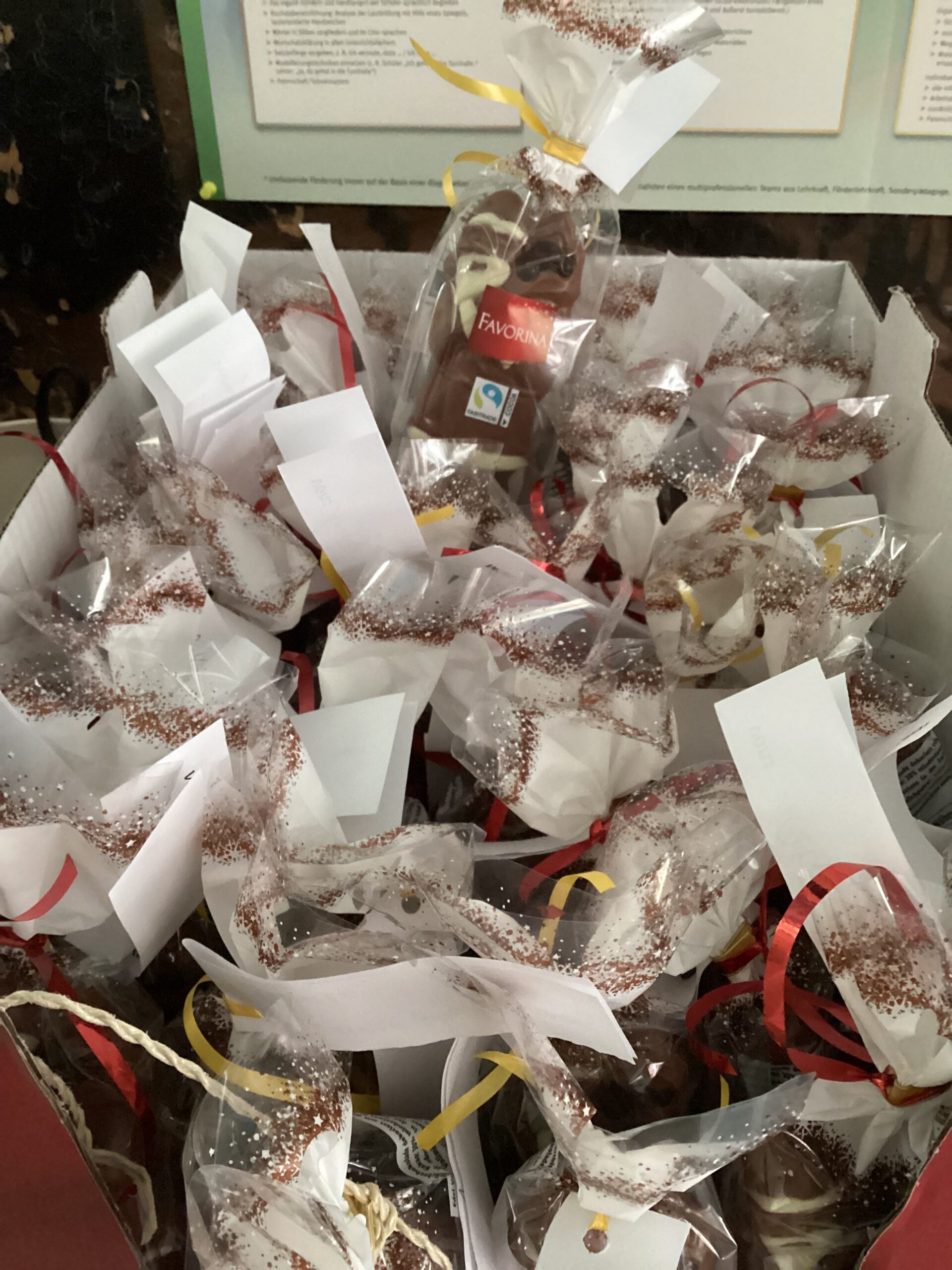 Besonders groß war die Freude in der Klasse 5b: Gleich vier Nikoläuse wurden an Jolyana Abdo überreicht. Spontan entschied sie sich, einen davon direkt auszupacken und die Schokolade mit der gesamten Klasse zu teilen – ein kleiner Moment, der für strahlende Gesichter sorgte.