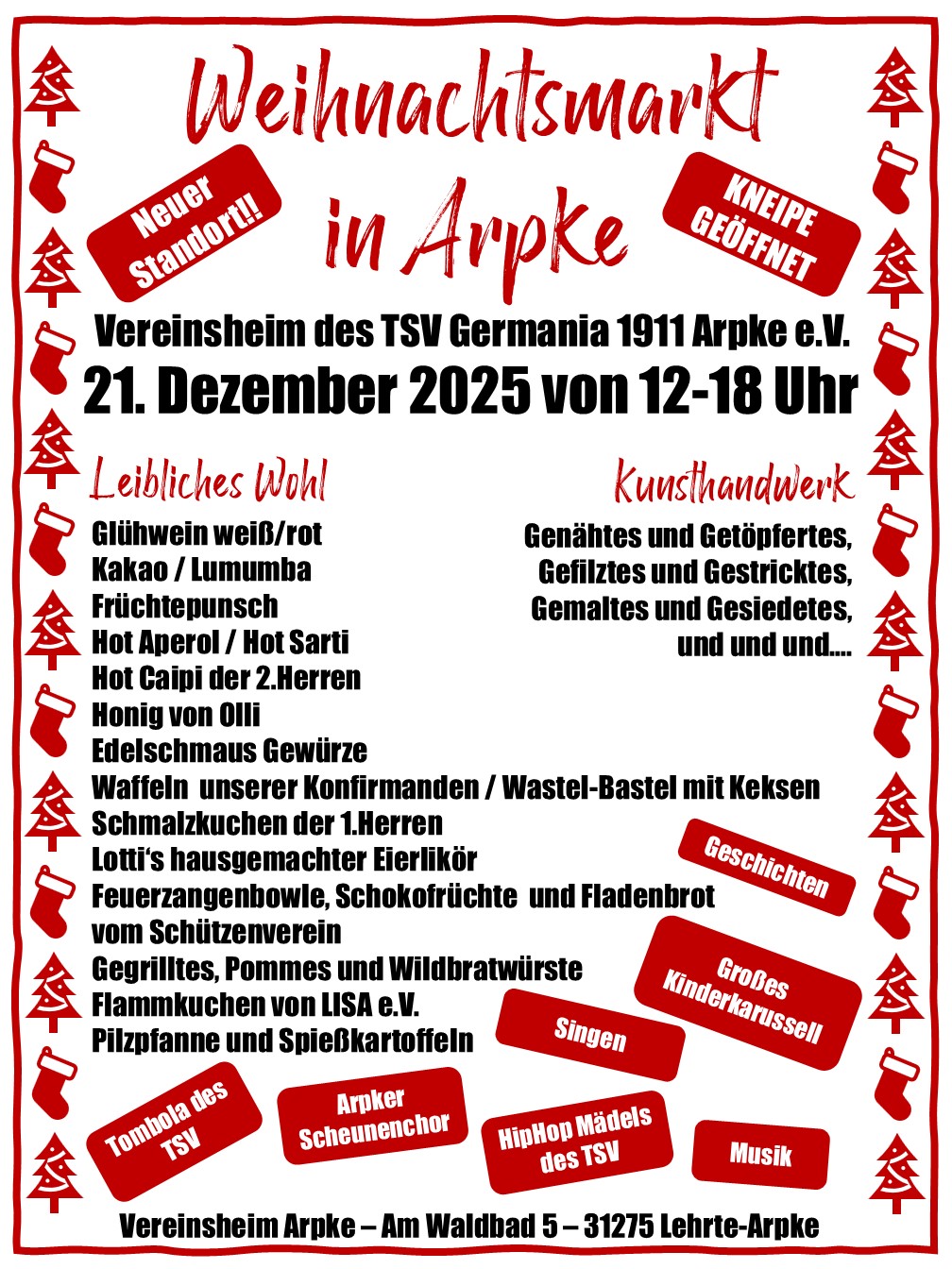 Am 4. Adventssonntag, 21. Dezember 2025, findet auch in diesem Jahr wieder der auch schon in den vergangenen Jahren beliebte Weihnachtsmarkt in Arpke statt. Dieses Jahr am neuen Standort rund um das Vereinsheim des TSV Germania Arpke, Am Waldbad 5.