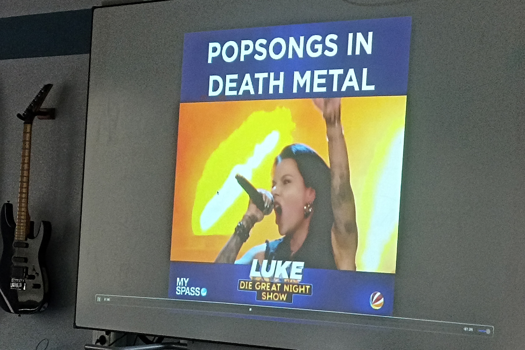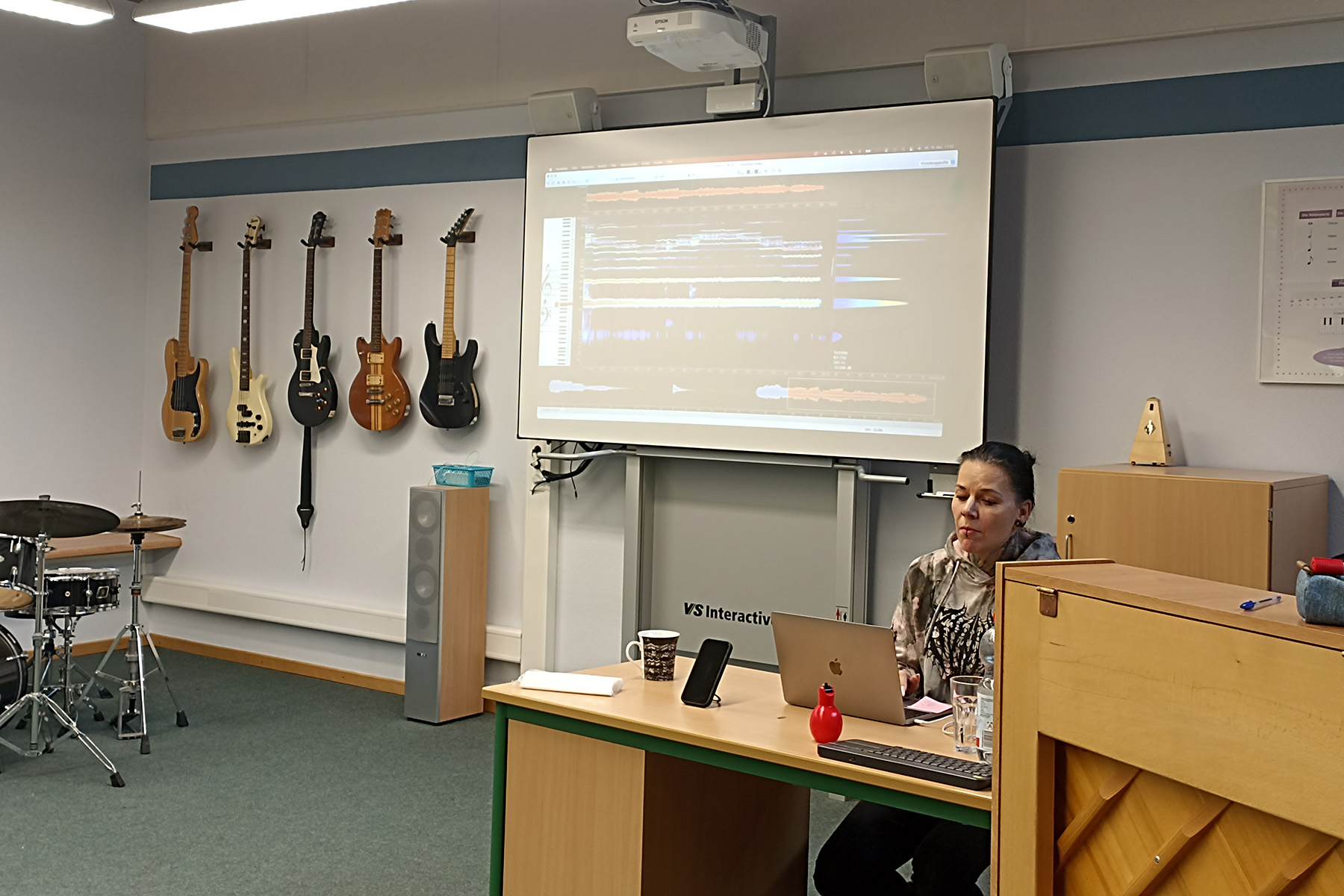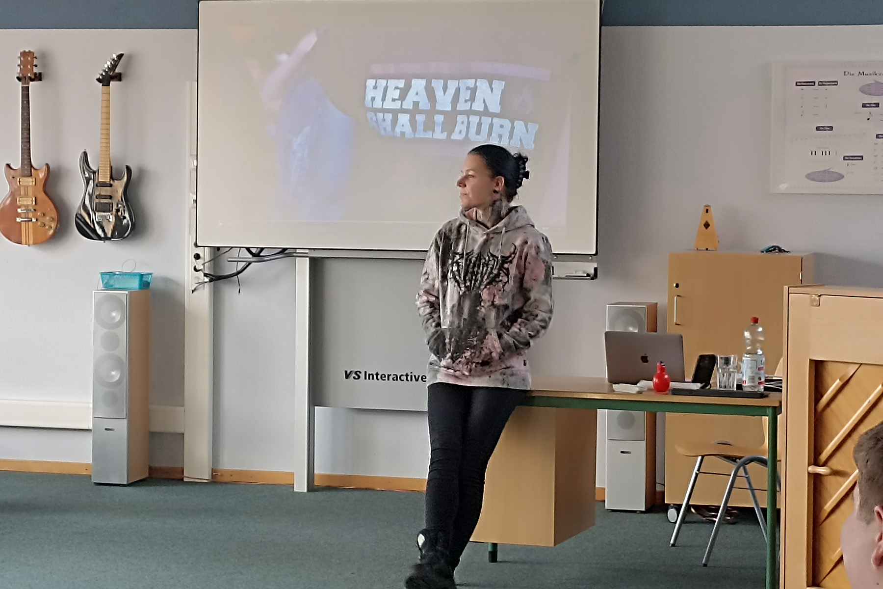 Zum Auftakt stellte sich Britta Görtz per Videobotschaft vor und berichtete über ihre musikalische Laufbahn sowie ihre Arbeit mit verschiedenen Bands. Untermalt wurde die Einführung von eindrucksvollen Ausschnitten aus Live-Auftritten, unter anderem mit der Band Heaven Shall Burn. Die Schülerinnen und Schüler erhielten so einen authentischen Einblick in die energiegeladene Welt des Extreme Metal und die stimmliche Arbeit, die diesen Musikstil prägt. Auf Nachfrage präsentierte die Sängerin ihre stimmliche Bandbreite auch live und sorgte damit für großes Staunen im Klassenraum.