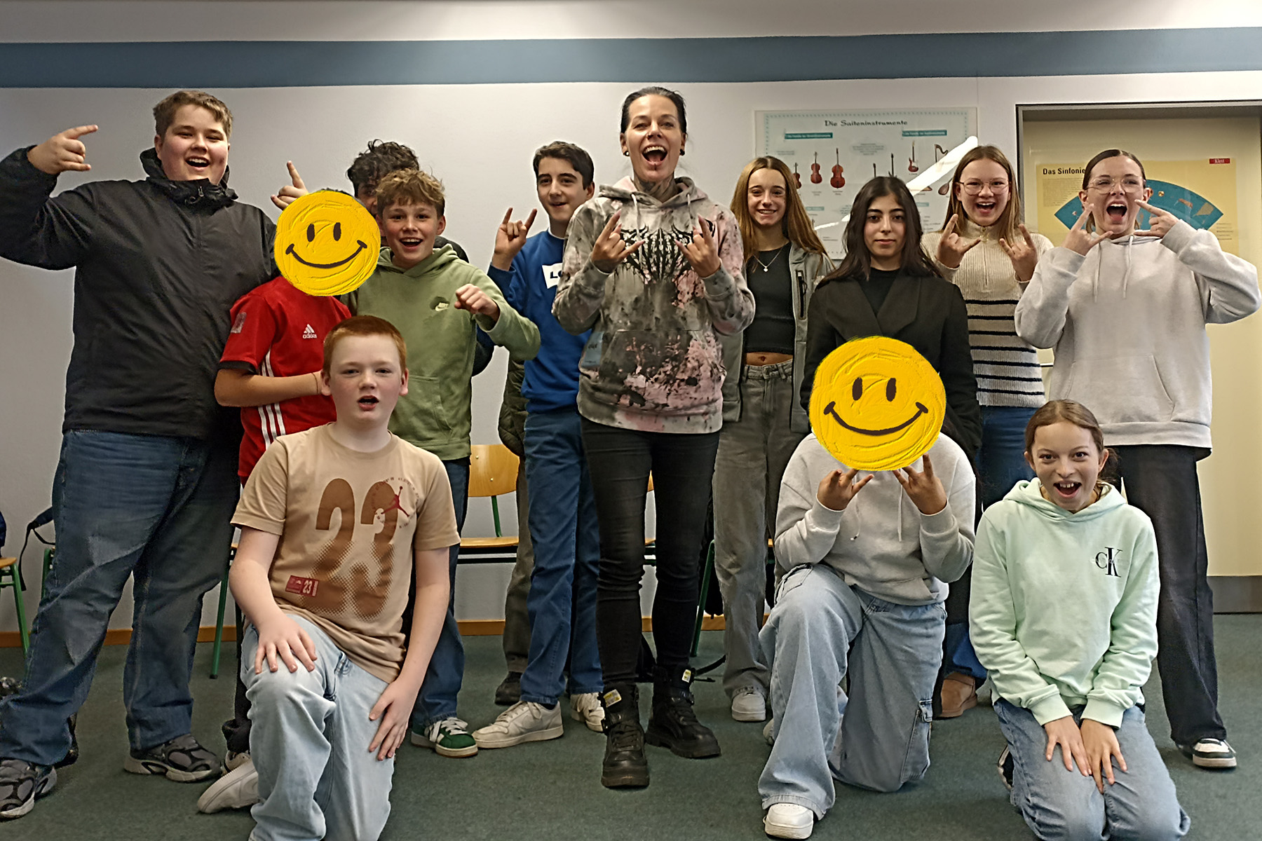 Im weiteren Verlauf wagten sich einige Schülerinnen und Schüler an erste Übungen des Ober- und Untertongesangs. Besonders motivierte Teilnehmende stellten sich schließlich einem „Schrei-Wettbewerb“, der mit viel Enthusiasmus und hörbarer Begeisterung angenommen wurde. Abgerundet wurde die besondere Unterrichtsstunde mit einem gemeinsamen Abschlussfoto.