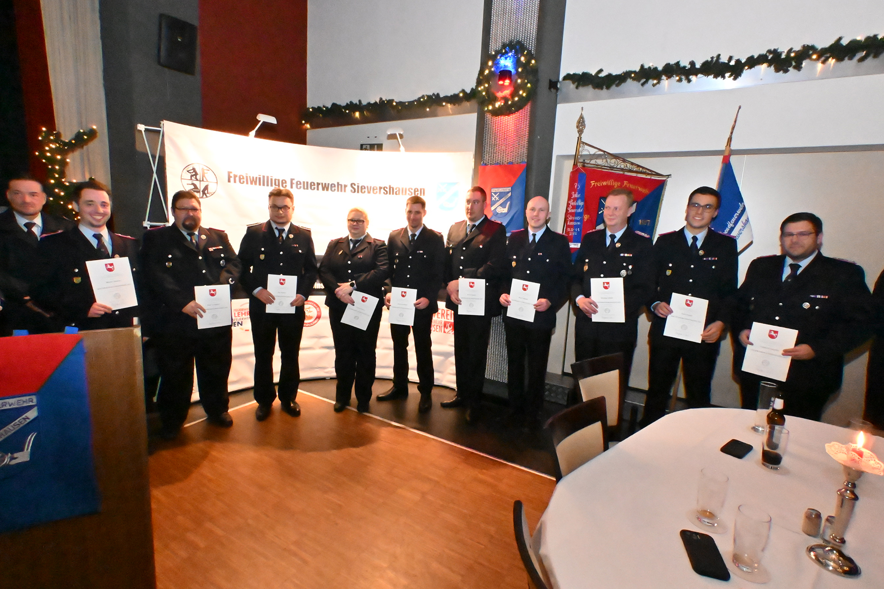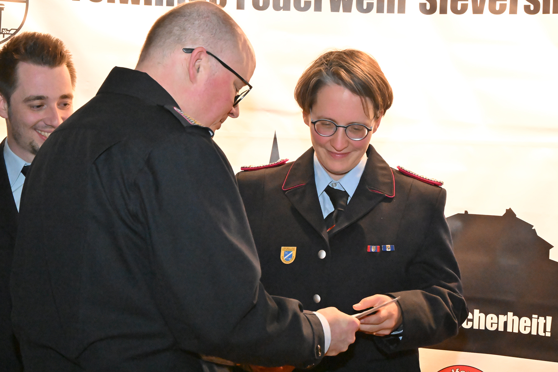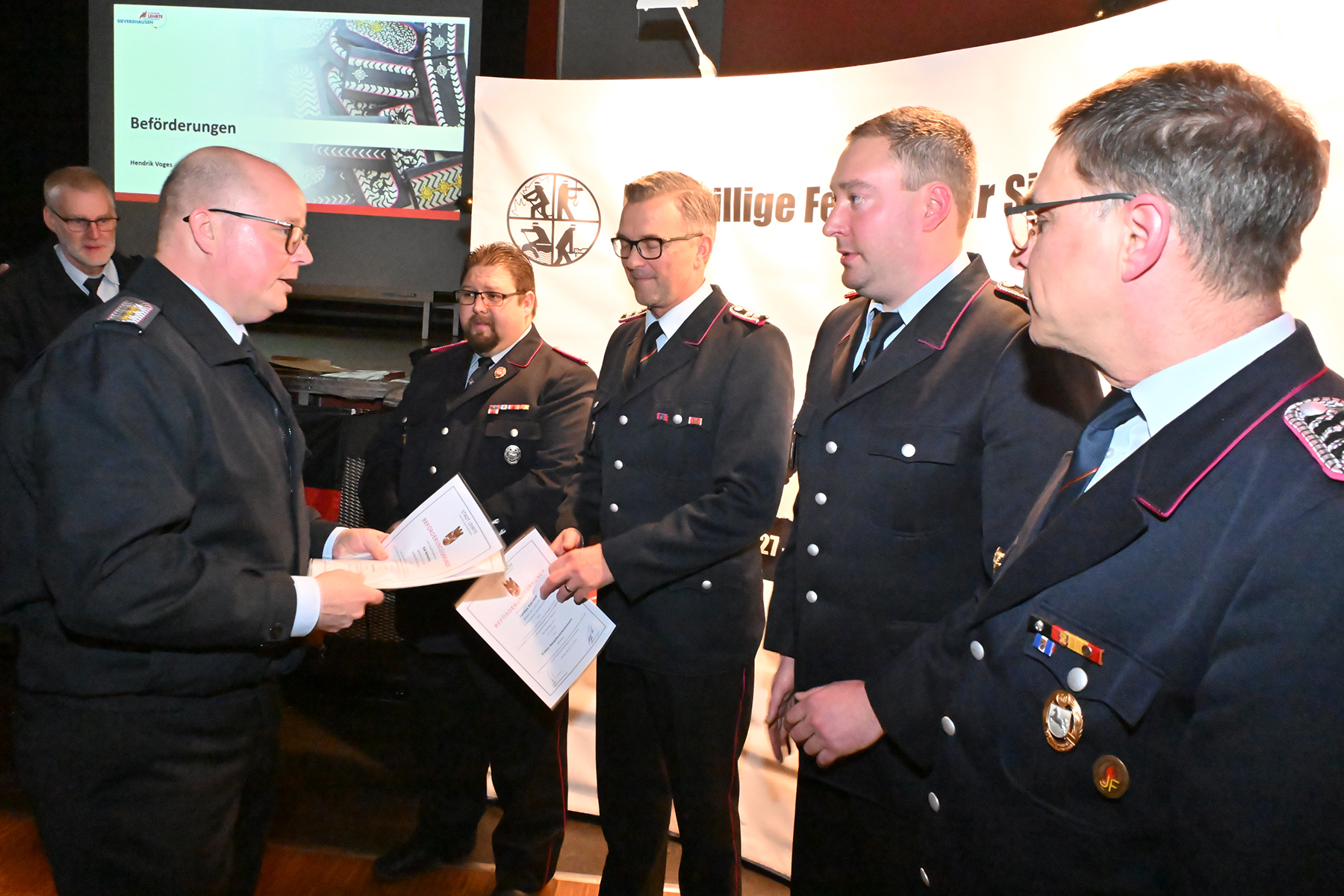 Neue Dienstgrade erhielten Melanie Passek, Tom Huthmann, Stephan Drescher, Tjark Buggel, René Süßkind, Paul Fiedler, Nils Kittelmann, Martin Ludwig, Justin Klamt, Andy König und Fabian van Lancker, die zur Oberfeuerwehrfrau beziehungsweise zum Oberfeuerwehrmann ernannt wurden.