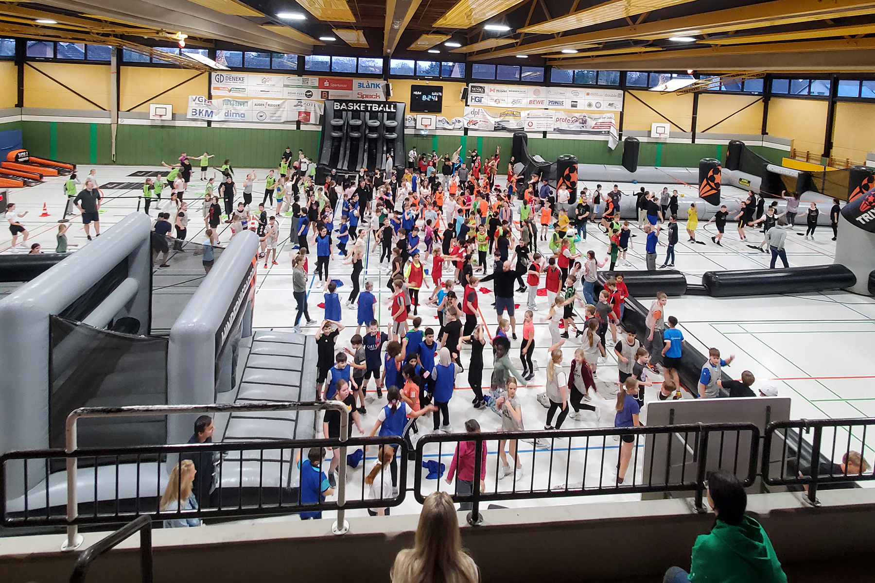 Einen Tag lang verwandelte sich die Sporthalle der Aurelia-Wald-Gesamtschule (AWG) in eine actionreiche Erlebnislandschaft: Die Firma Trixxit war zu Gast und brachte ein vielfältiges Bewegungsprogramm mit, das den Schülerinnen und Schülern sichtbar Freude bereitete. Bereits früh am Morgen rollte das Trixxit-Team an, um die beeindruckenden Stationen aufzubauen – von Riesenhindernisparcour, Basketball-Challenge über Sprintstrecke bis zum Lebendkicker war alles dabei.