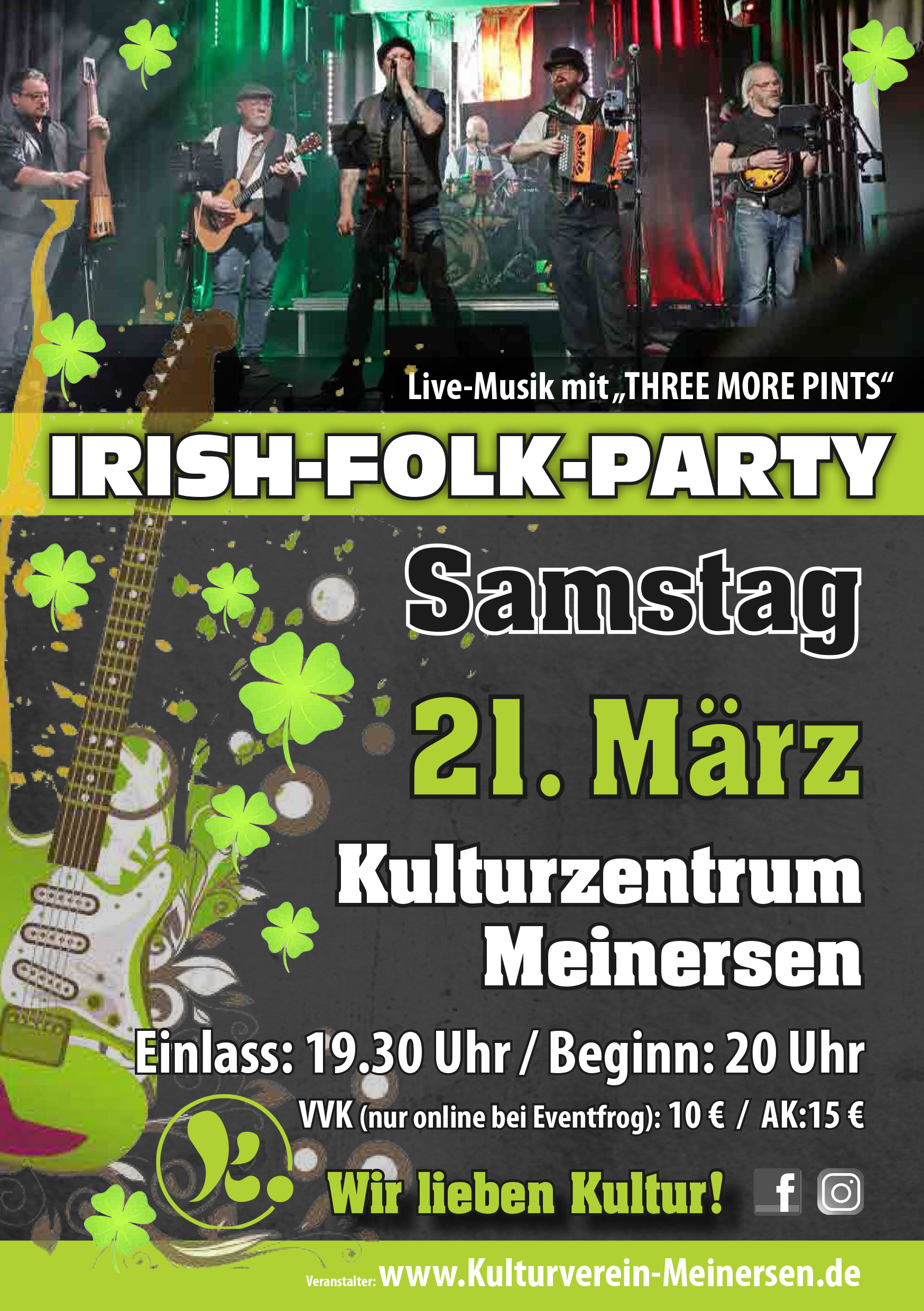 Zum St. Patrick’s Day hält irische Musik und Lebensfreude Einzug in Meinersen. Am Sonnabend, 21. März 2026, wird im Kulturzentrum Meinersen ein irischer Abend mit der Band „Three More Pints“ gefeiert. Die sechsköpfige Formation sorgt mit ihrem Programm für authentischen Sound, begleitet von irischem Bier und einer passenden Dekoration, die das Ambiente abrundet.