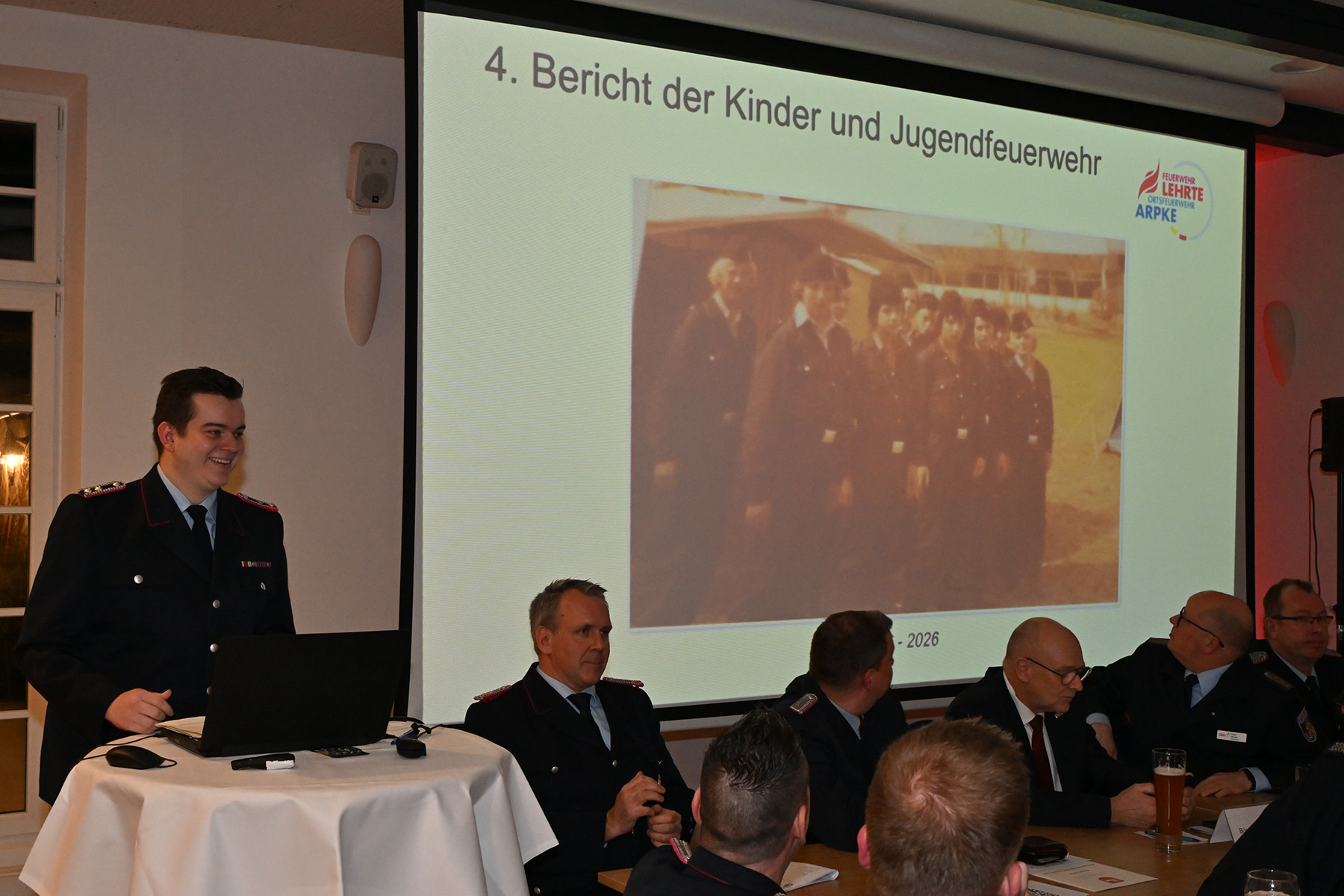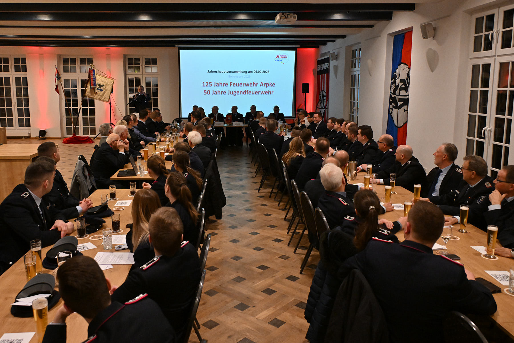 Der Ausblick auf das Jahr 2026 verspricht gleich drei Jubiläumsfeiern bei der Freiwilligen Feuerwehr Arpke: 125 Jahre Ortsfeuerwehr, 50 Jahre Jugendfeuerwehr und 15 Jahre Kinderfeuerwehr werden gefeiert. Doch auch der Rückblick auf 2025 bot bei der Jahreshauptversammlung am gestrigen Freitag, 6. Februar 2026, vor rund 80 Gästen im Baltheuers Hoff „viele Lichtblicke und ein vielseitiges Dienstjahr“, wie Ortsbrandmeister Carsten Rex betonte. Eine besondere Personalie sorgte für stehenden Applaus: Zugführer Fabian Meyer wurde aus seinem Amt verabschiedet – der Arpker ist nun stellvertretender Stadtbrandmeister und damit der erste Vertreter aus der Ortsfeuerwehr Arpke in dieser Position.
