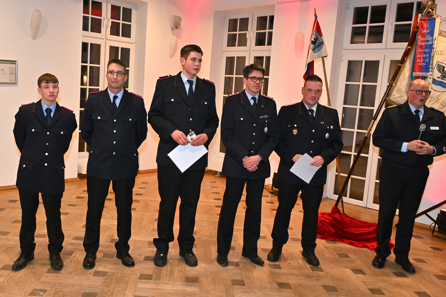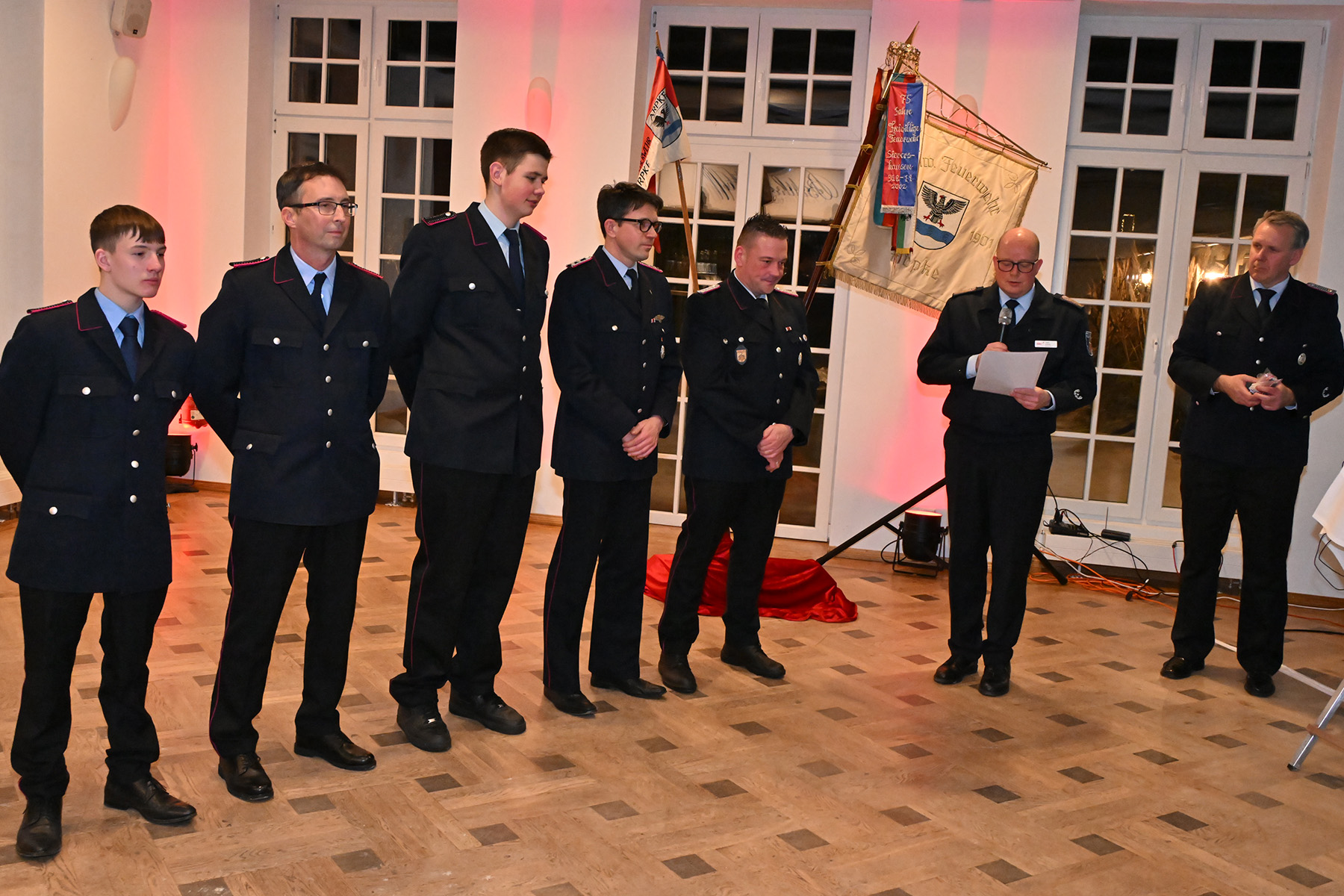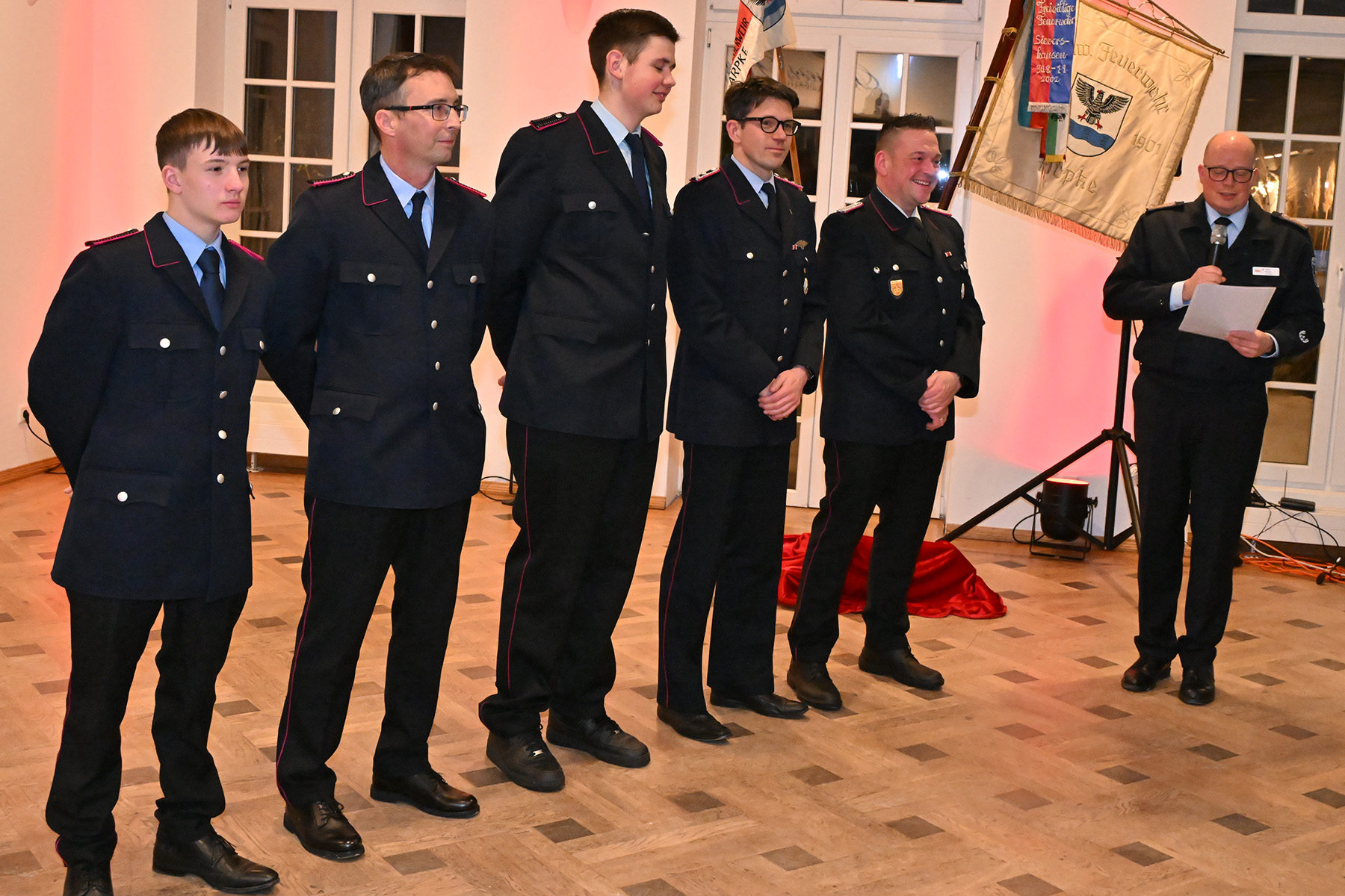 Drei Jugendliche wurden von der Jugendfeuerwehr in die Einsatzabteilung übernommen: Andreas Loßin, Fynn Mohlek und Johannes Zimbelmann. Zudem verstärken zwei Quereinsteiger, Ulrich von Bramann und Michael Freitag, die Einsatzabteilung.