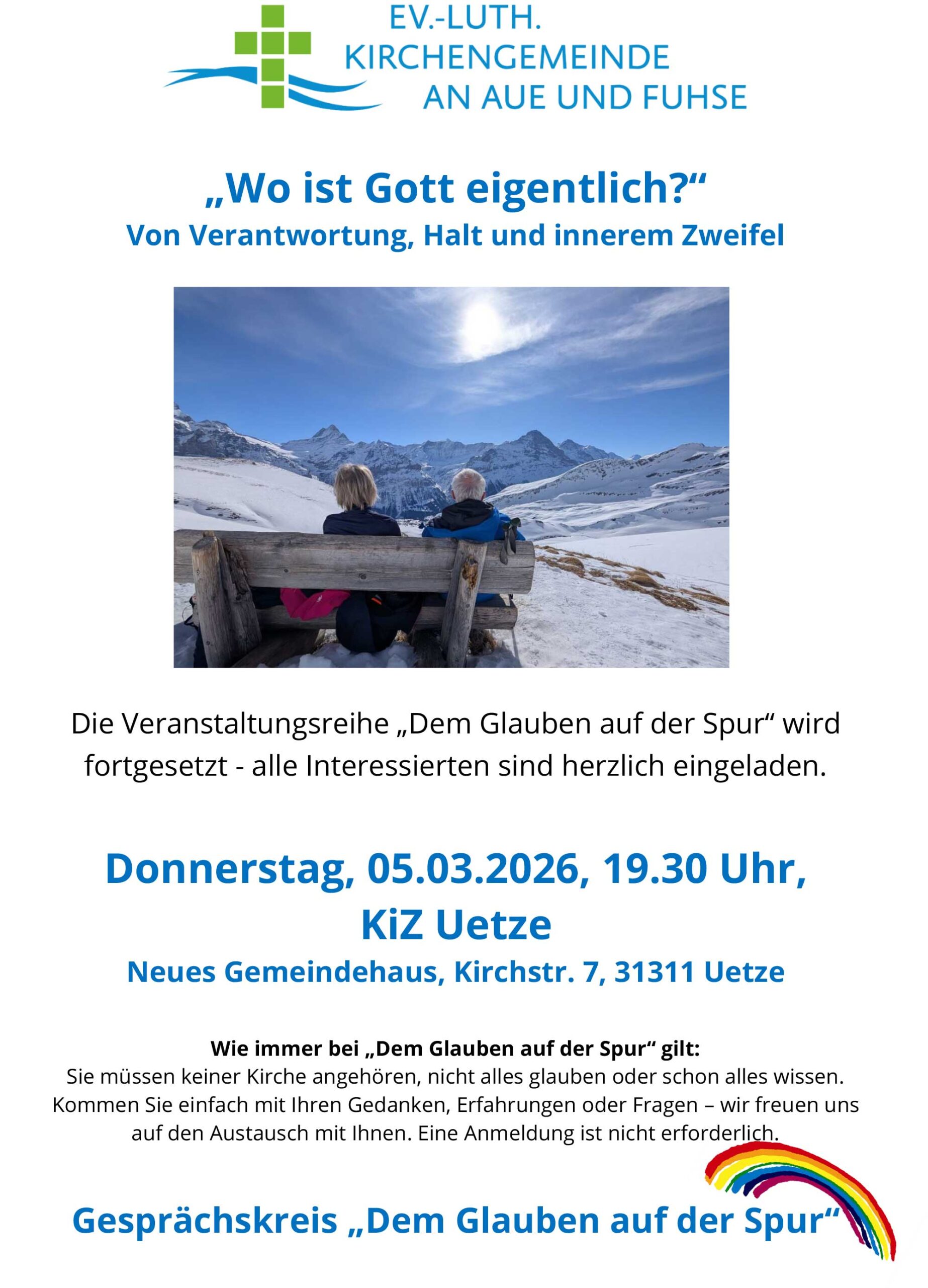 Unter dem Titel „Wo ist Gott eigentlich?“ lädt der Gesprächskreis „Dem Glauben auf der Spur“ am Donnerstag, 5. März 2026, zu einem offenen Gesprächsabend nach Uetze ein. Beginn ist um 19.30 Uhr im Neuen Gemeindehaus (KiZ) an der Kirchstraße 7.