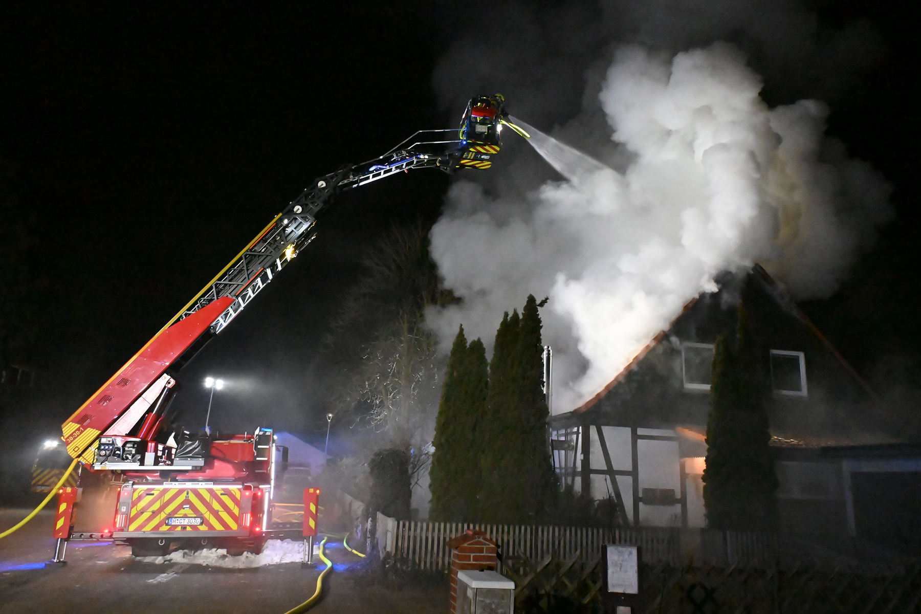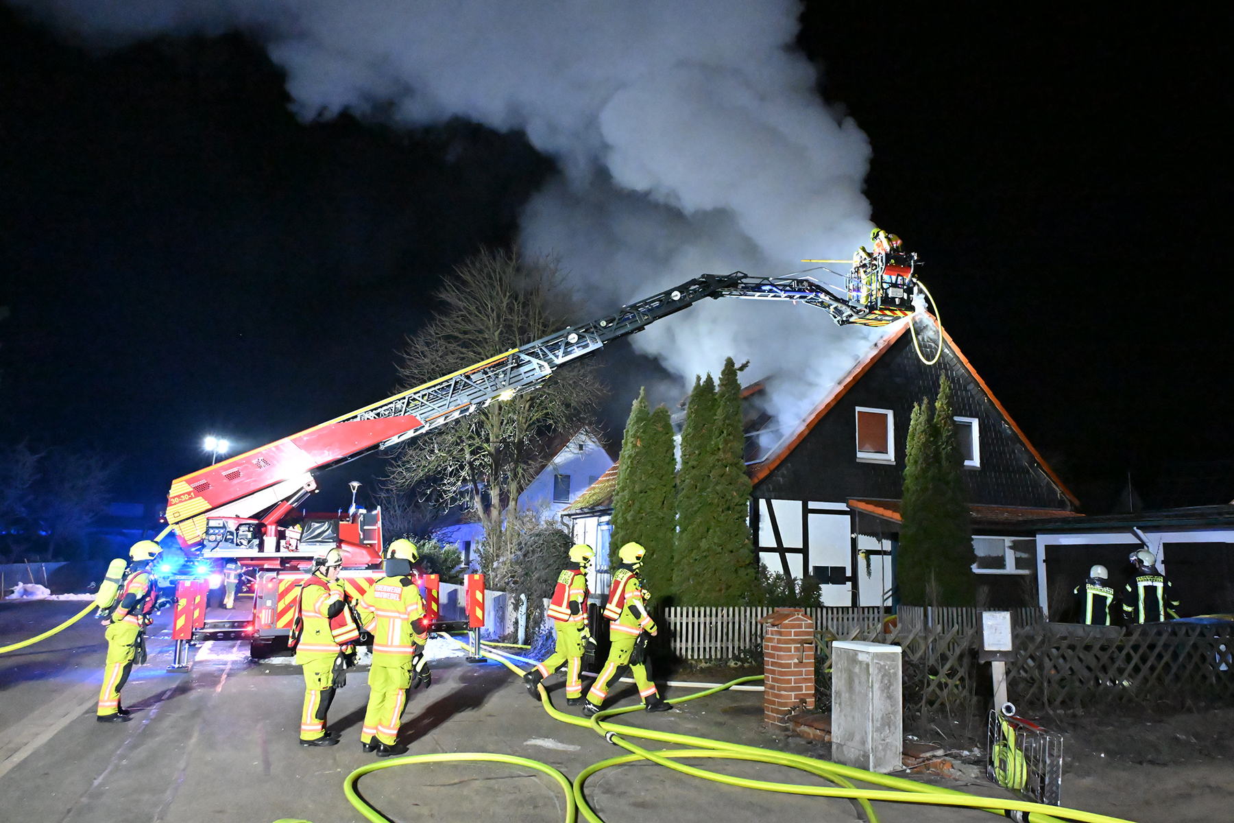 Das Feuer hatte sich schnall in dem Gebäude ausgebreitet. Nunmehr war nicht nur das Zimmer im Erdgeschoss betroffen, sondern die Flammen hatten sich in den Dachbereich ausgebreitet, sodass auch bereits Flammen durch das Dach schlugen.