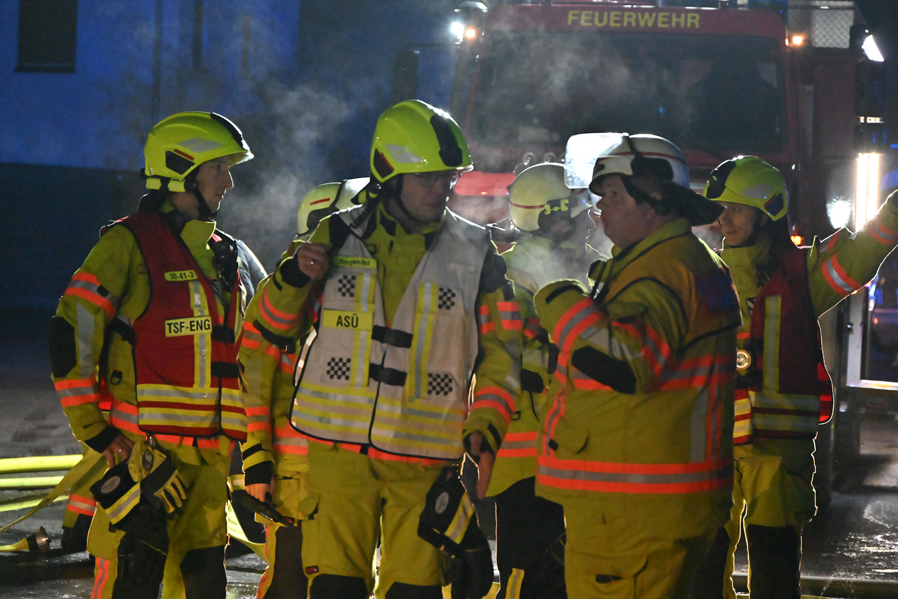 Hinzu kamen die Außentemperaturen bei minus sechs Grad Celsius. Soweit Wasser auf den Boden traf, war dieser spiegelglatt, sodass Stadtbrandmeister Carsten Rüdiger auch den Bauhof alarmierte, der mehrfach Salz gestreut hatte, damit die Einsatzkräfte nicht stürzen – wie es jüngst bei einem Einsatz auf der Autobahn passiert ist, als ein Feuerwehrmann bereits beim Aussteigen aus dem Fahrzeug ausrutschte und sich das Sprunggelenk brach.