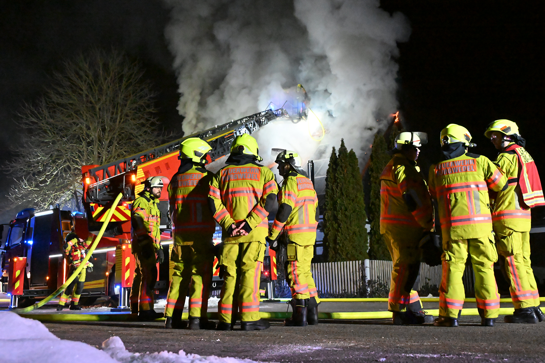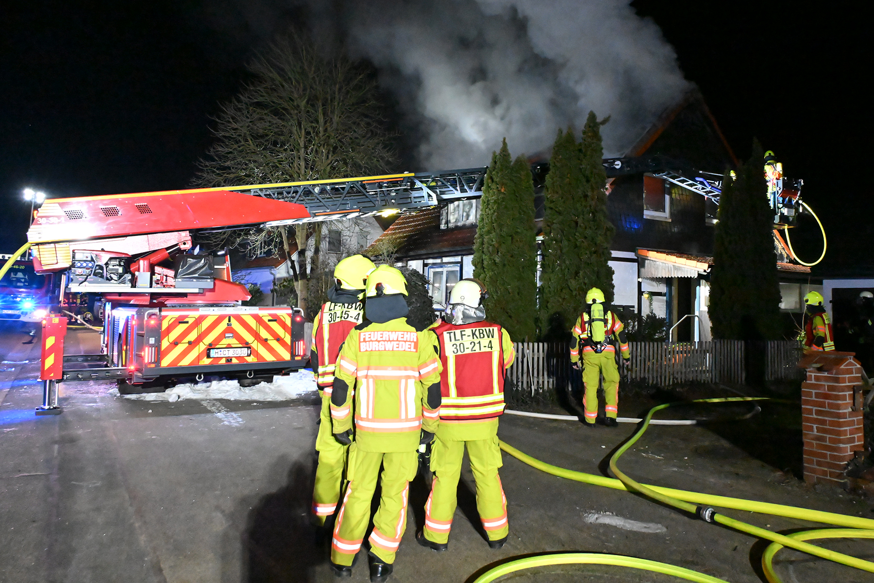 Bei Ankunft der ehrenamtlichen Brandbekämpfer der Freiwilligen Feuerwehr Wettmar unter der Leitung von Lea-Sophie Iser wurde ein Vollbrand eines Zimmers im Erdgeschoss des Hauses entdeckt, woraufhin sofort die Alarmstufe erhöht wurde. Daraufhin wurden auch die Ortsfeuerwehr Großburgwedel mit der Drehleiter sowie die Ortsfeuerwehr Kleinburgwedel nachalarmiert. Auch Stadtbrandmeister Carsten Rüdiger wurde ian die Einsatzstelle alarmiert, der im weiteren Verlauf die Einsatzleitung übernahm und den Einsatz koordinierte.