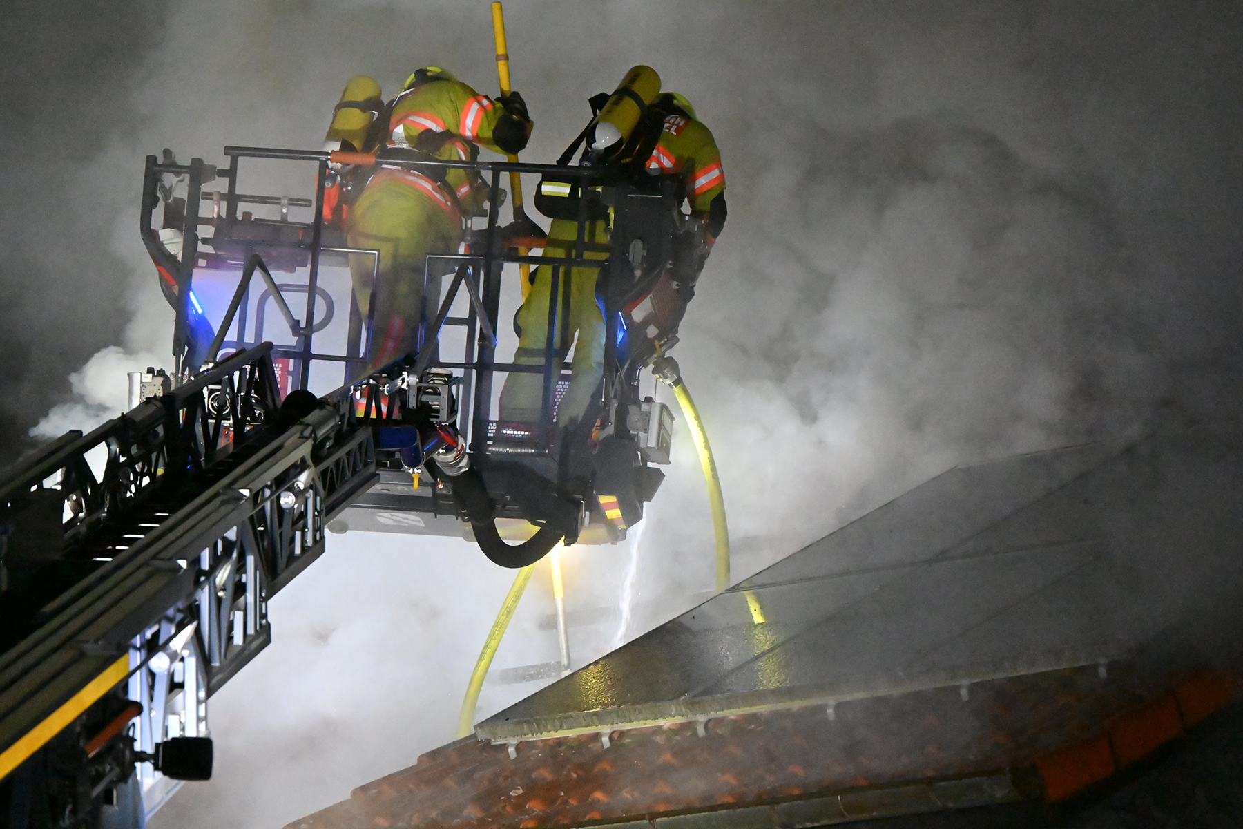 Von außen wurde das Feuer mit zwei C-Rohren sowie dem Korb der Drehleiter gelöscht. Um besser an die Glutnester heranzukommen, wurde das Dach in großen Teilen abgenommen. Erschwert wurde dies durch eine PV-Anlage auf dem Dach – eine weitere Gefahr.