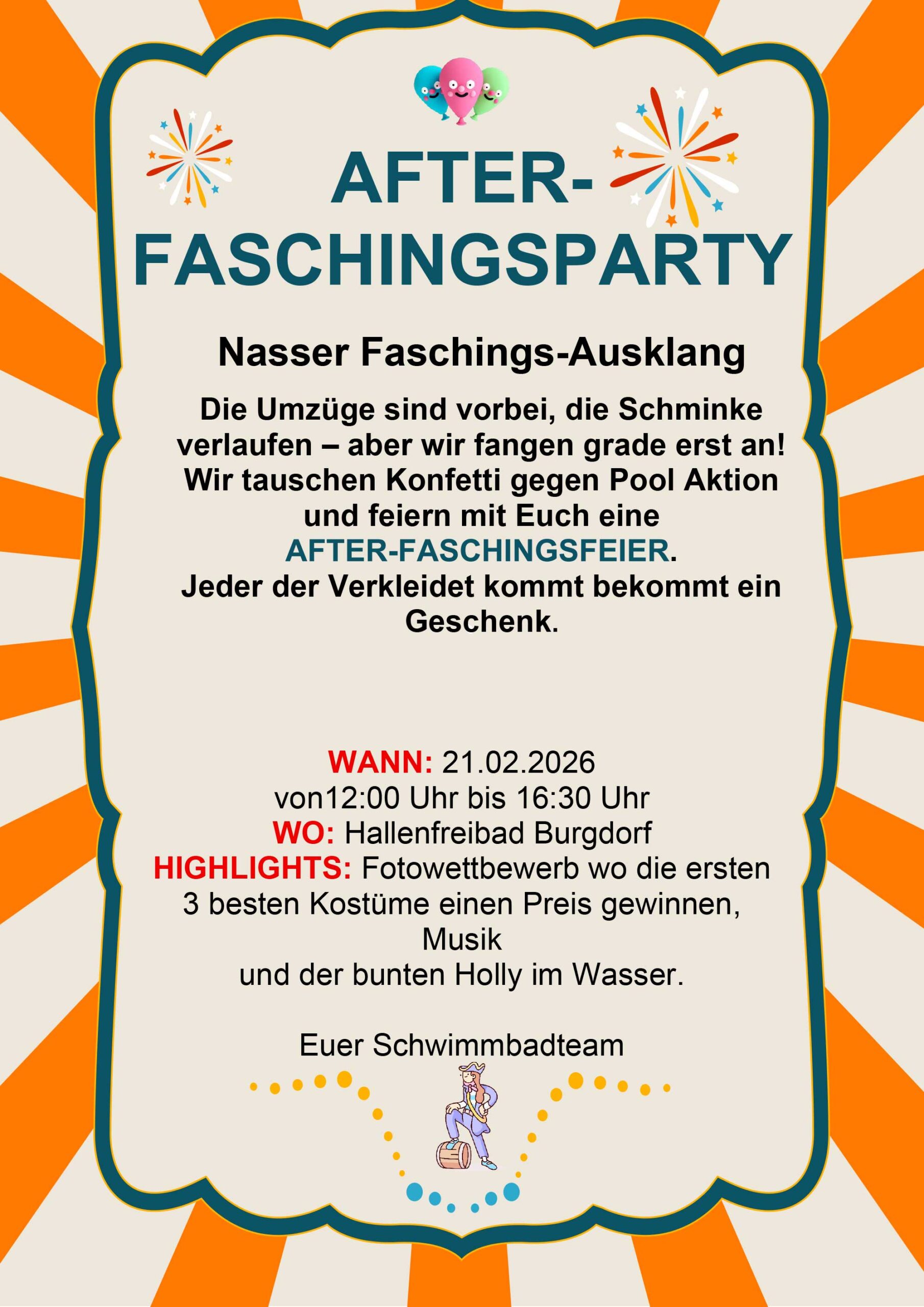 Die närrische Zeit endet zwar heute offiziell, doch im Hallenfreibad Burgdorf wird am Sonnabend, 21. Februar 2026, noch einmal weitergefeiert. Von 12.00 bis 16.30 Uhr lädt das Schwimmbadteam zur After-Faschingsparty ein und verspricht einen bunten Faschings-Ausklang im Wasser.