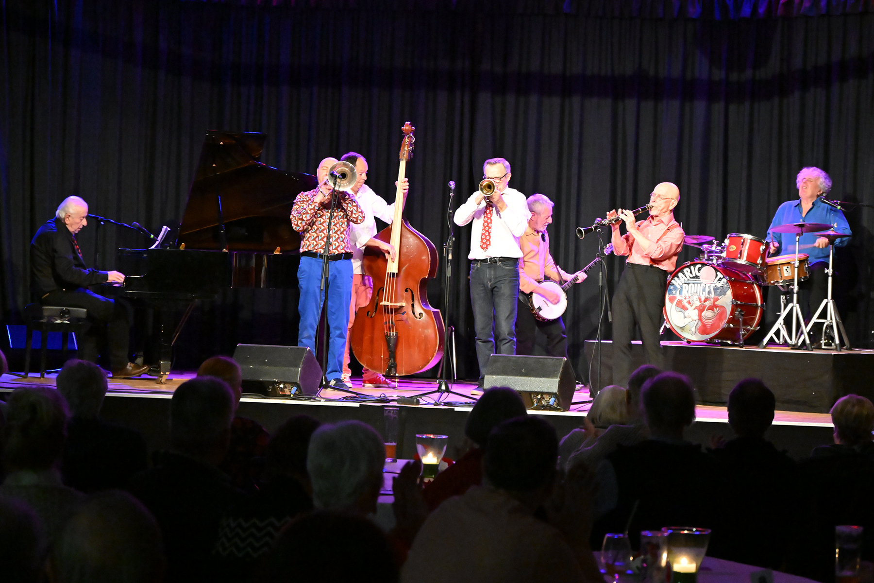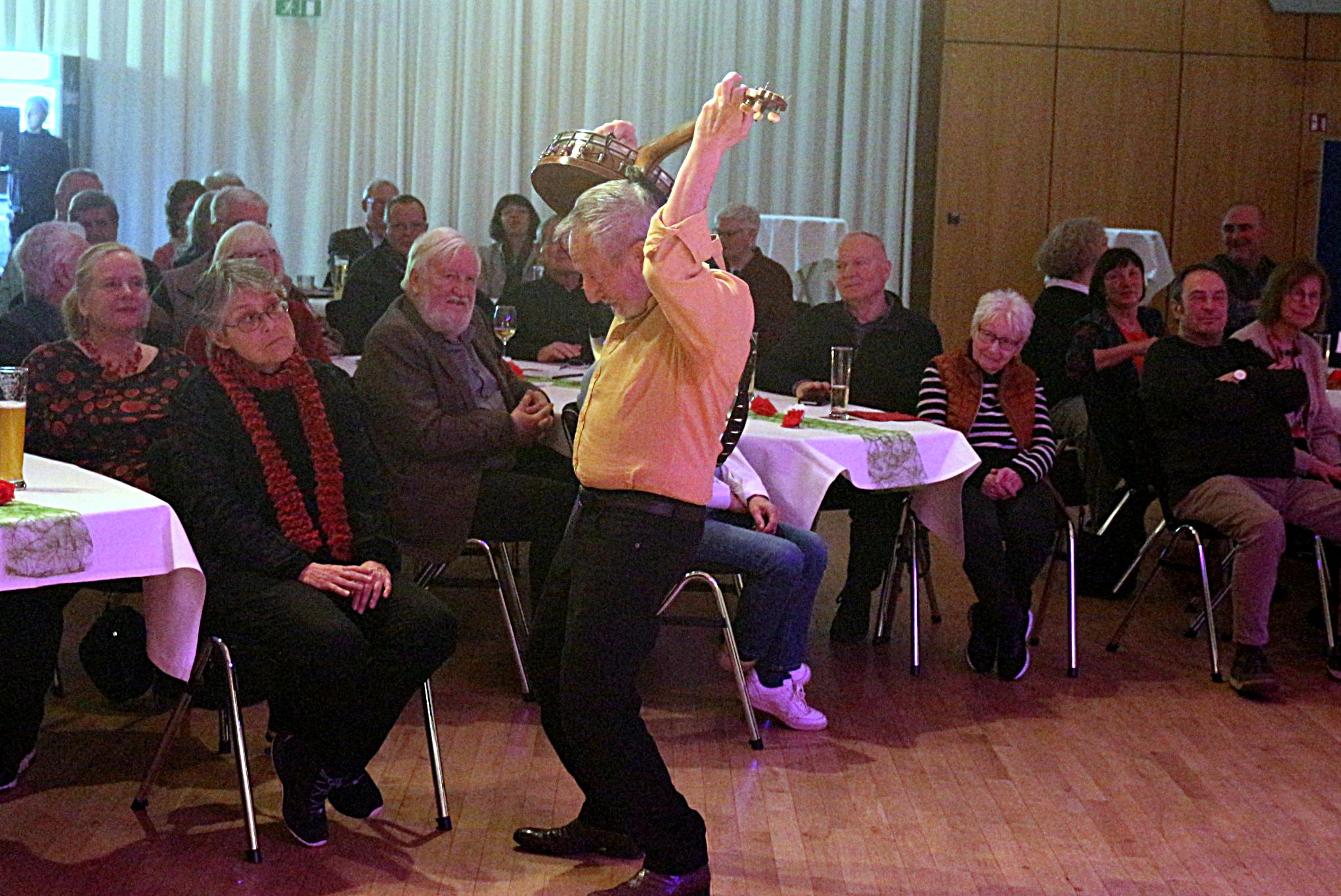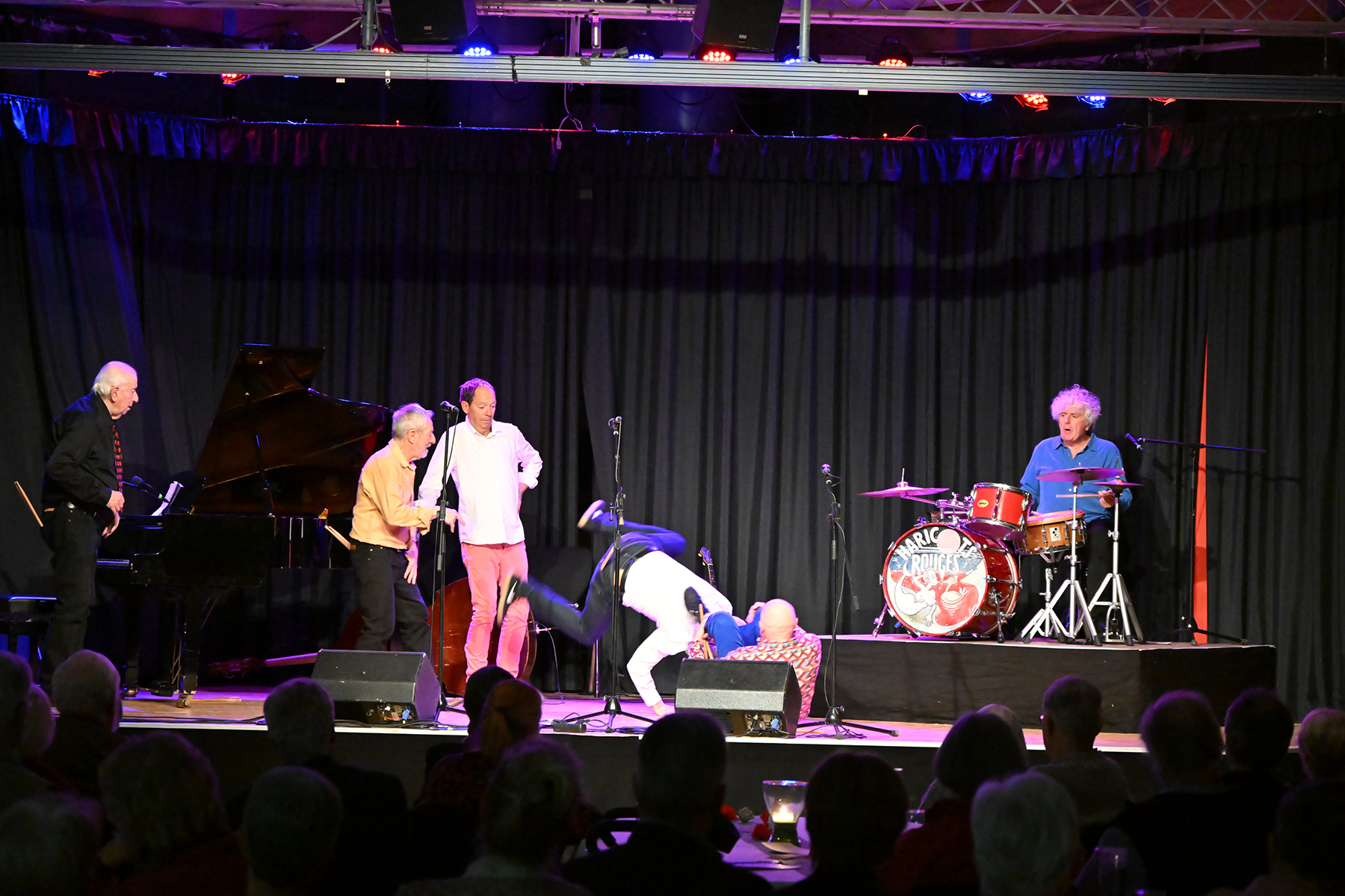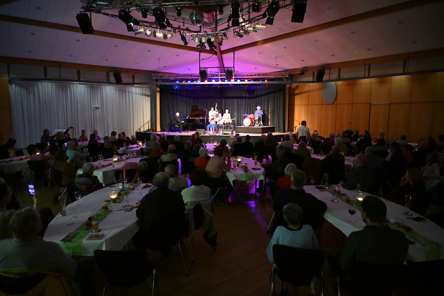 An den gut besetzten 16 Tischen im Bühnensaal des Veranstaltungszentrums ließ sich das interessierte Publikum nicht nur Speis`und Trank schmecken, sondern genoss auch das „akustische Feuerwerk“, so Moderator Sven Fiete Rensing, der siebenköpfigen französischen Formation.