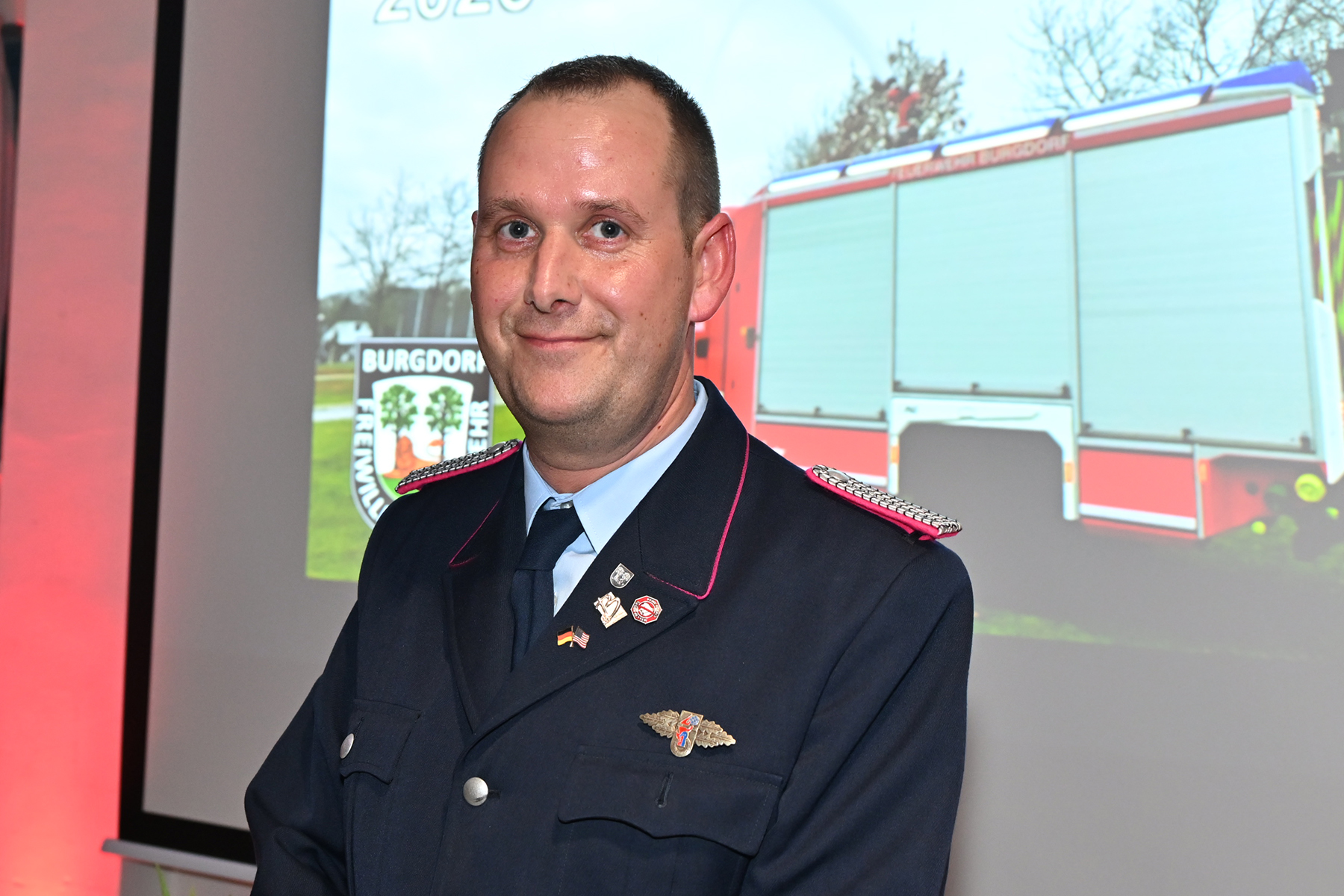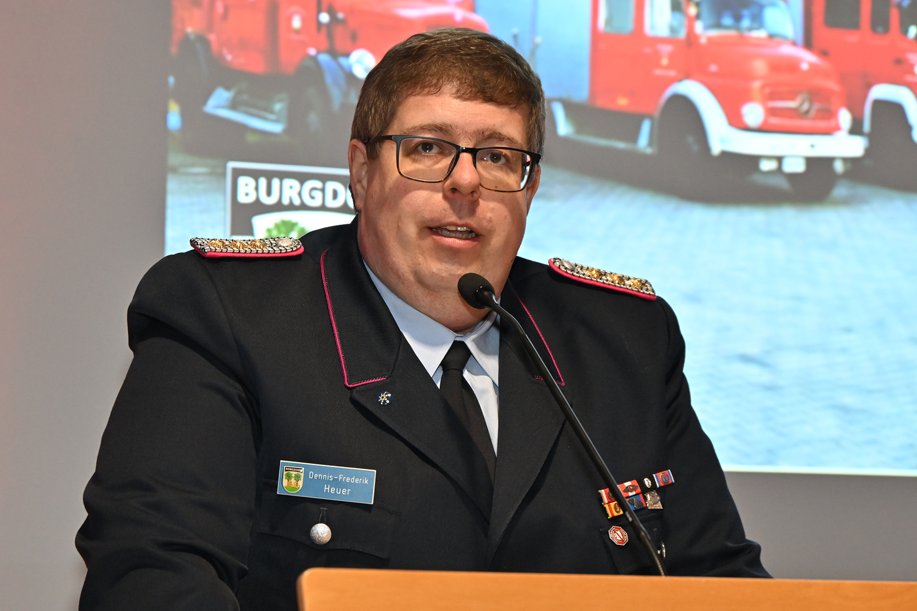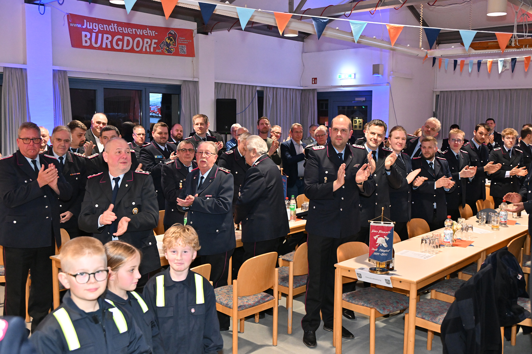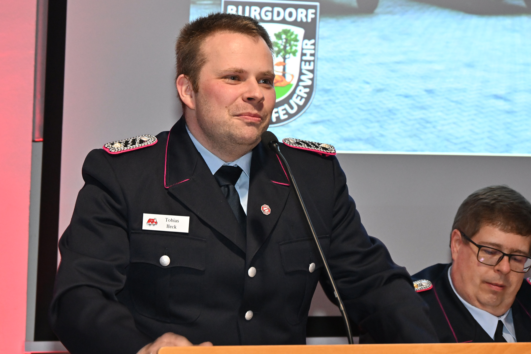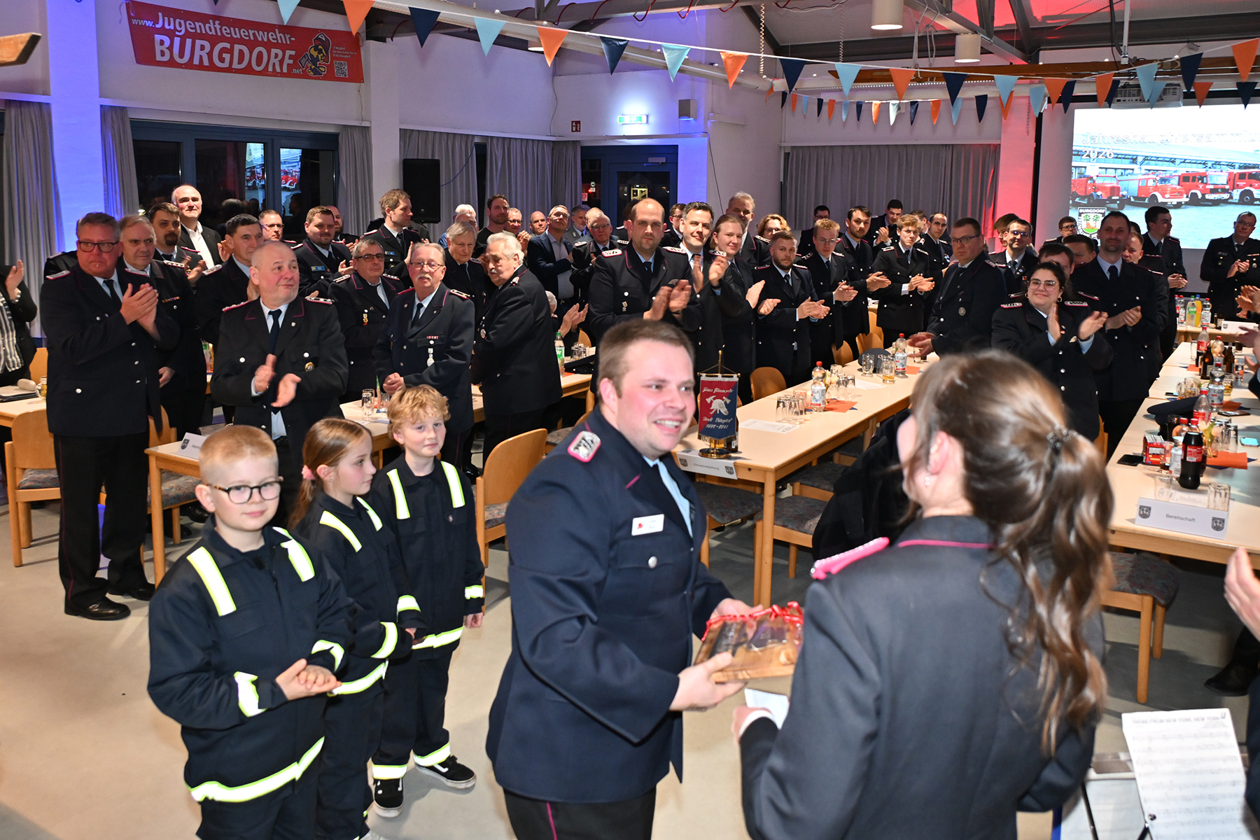 Stadtbrandmeister Dennis-Frederik Heuer fasste die stadtweiten Zahlen zusammen: In den fünf Kinderfeuerwehren sind 134 Kinder aktiv, in den vier Jugendfeuerwehren 74 Jugendliche, die beiden Musikzüge zählen 95 Mitglieder, die Einsatzabteilung 385 Kräfte. Von den 271 stadtweiten Einsätzen war die Ortsfeuerwehr Burgdorf bei allen bis auf rund 50 beteiligt.