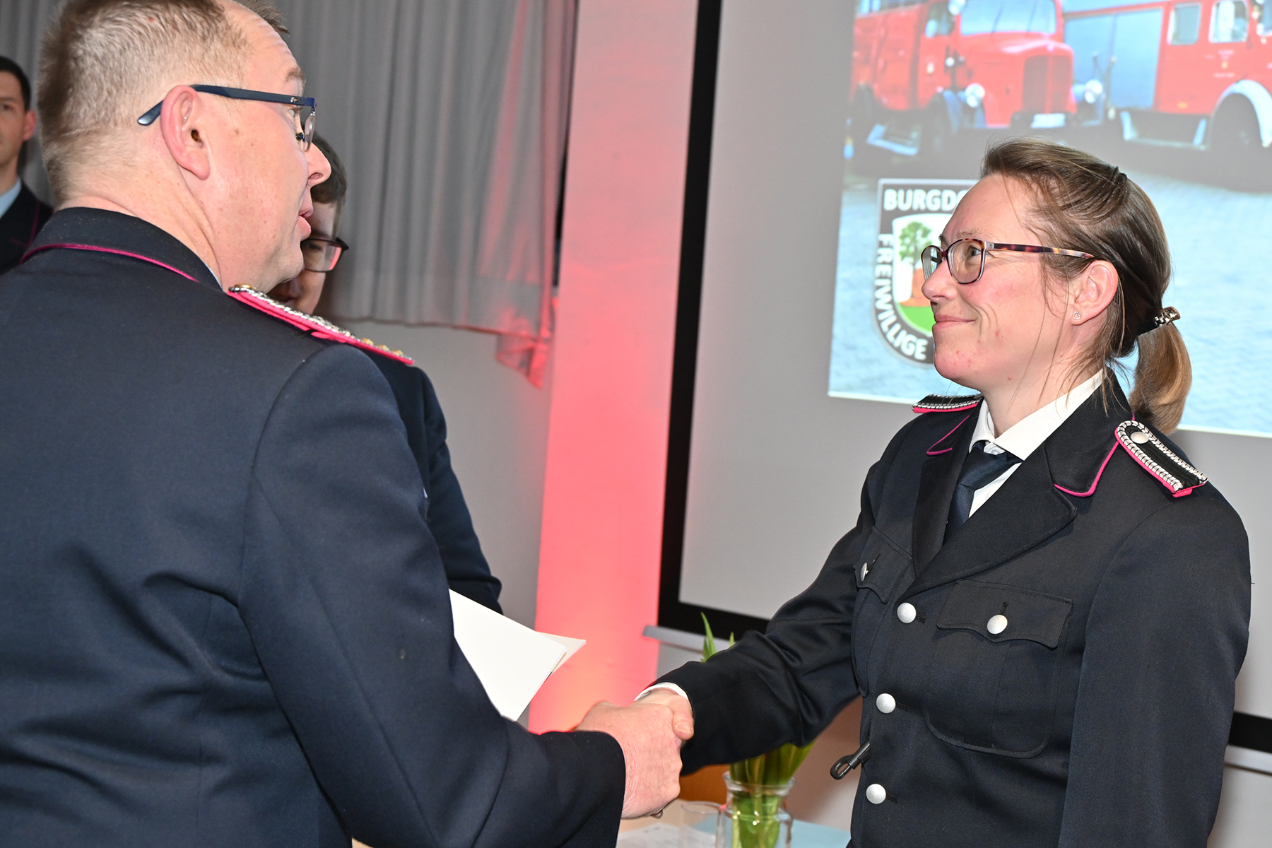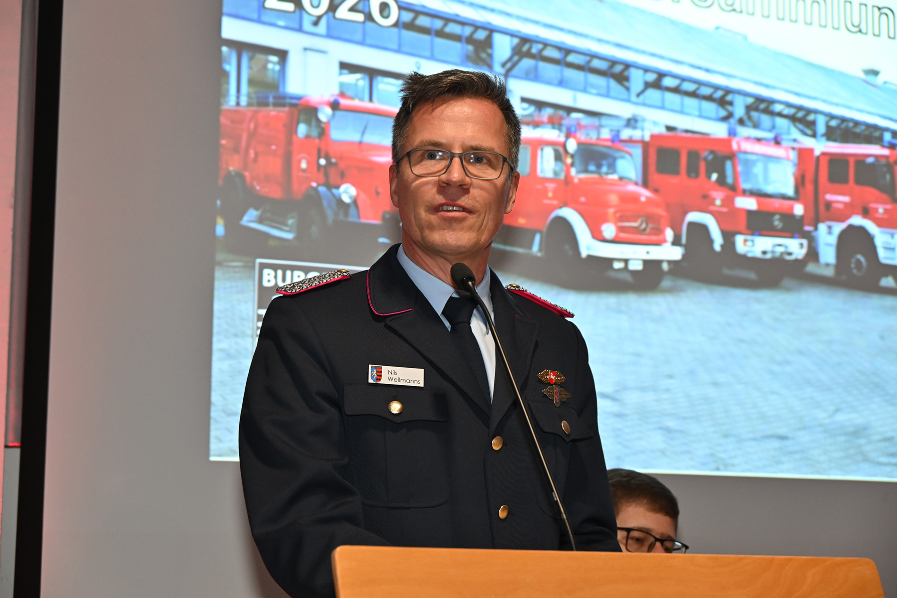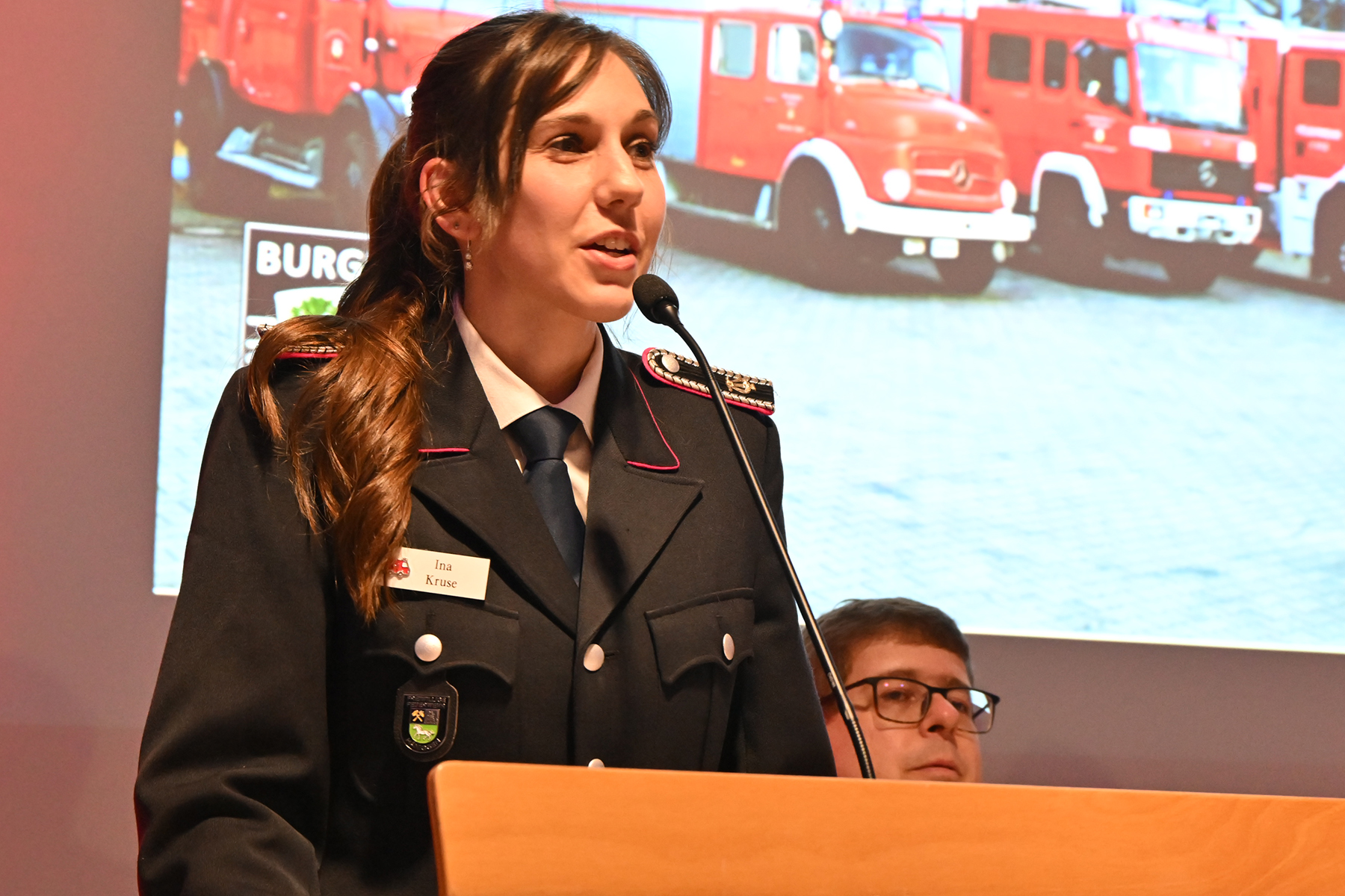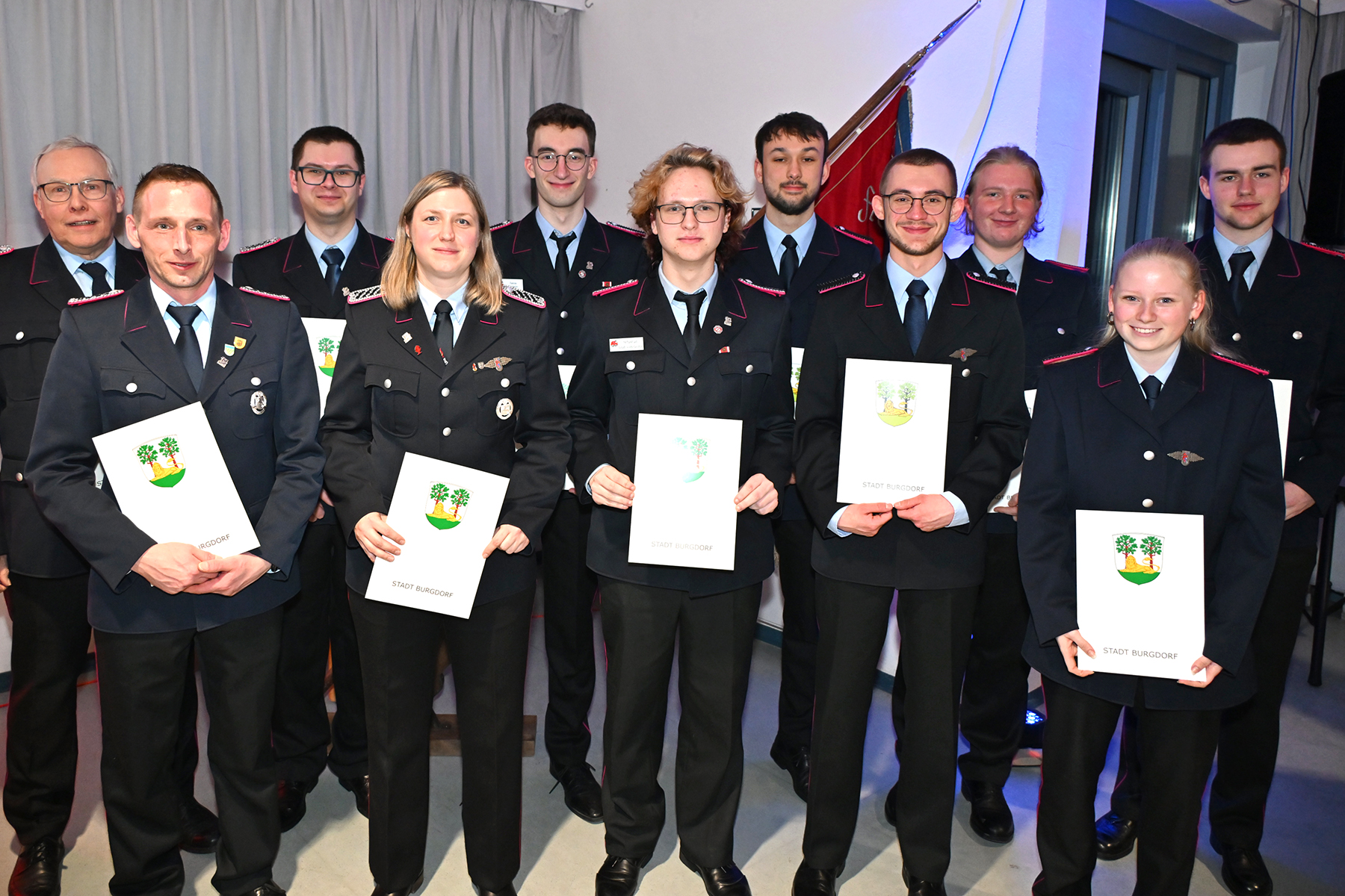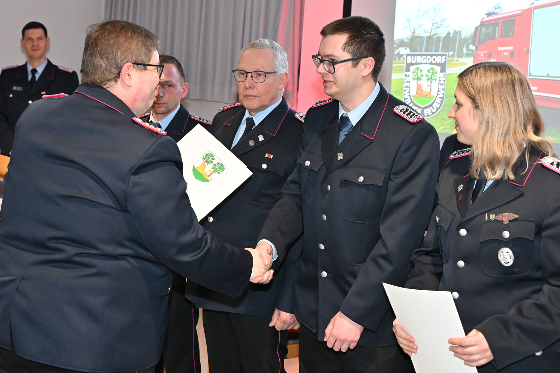 Stadtbrandmeister Dennis-Frederik Heuer fasste die stadtweiten Zahlen zusammen: In den fünf Kinderfeuerwehren sind 134 Kinder aktiv, in den vier Jugendfeuerwehren 74 Jugendliche, die beiden Musikzüge zählen 95 Mitglieder, die Einsatzabteilung 385 Kräfte. Von den 271 stadtweiten Einsätzen war die Ortsfeuerwehr Burgdorf bei allen bis auf rund 50 beteiligt.