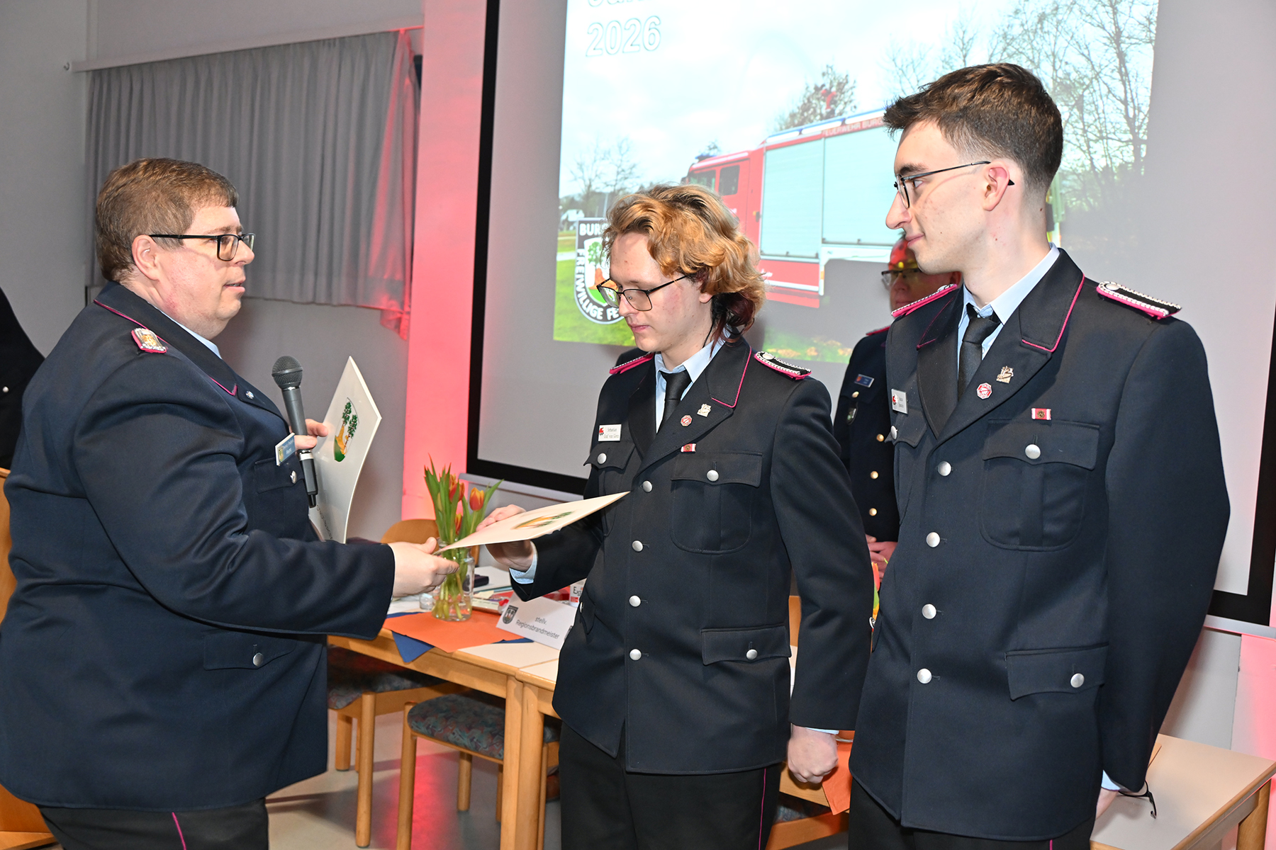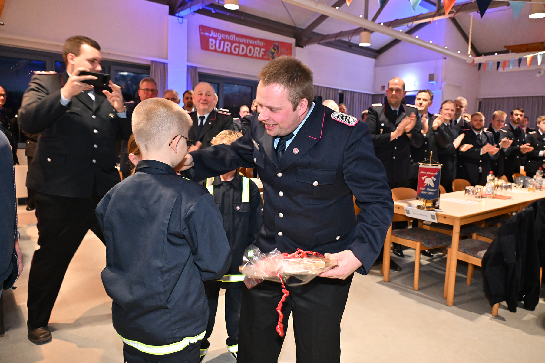 Erfreuliches gab es aus den Nachwuchsabteilungen zu berichten. Die Kinderfeuerwehr – die „Feuerwehrflitzer 41“ – wuchs unter Kinderfeuerwehrwart Tobias Heck von 39 auf 43 Kinder, bei 35 Treffen und 3.616 Dienststunden. Neun Kinder wurden in die Jugendfeuerwehr übergeben, 15 neue Mitglieder kamen hinzu. Für 2026 sollen bereits 12 weitere Flitzer in die Jugendfeuerwehr wechseln. Die stellvertretende Kinderfeuerwehrwartin Ina Kruse würdigte Tobias Heck, der seit 2012 mit kleiner Unterbrechung die Kinderfeuerwehr leitet: Er habe durch intensive Öffentlichkeitsarbeit dafür gesorgt, dass die Kinder kamen – und blieben. Einige von ihnen sind heute bereits in den Reihen der Aktiven. Tobias Heck wurde für sein besonderes Engagement in der Nachwuchsarbeit mit dem Ehrenzeichen der Niedersächsischen Jugendfeuerwehren ausgezeichnet.