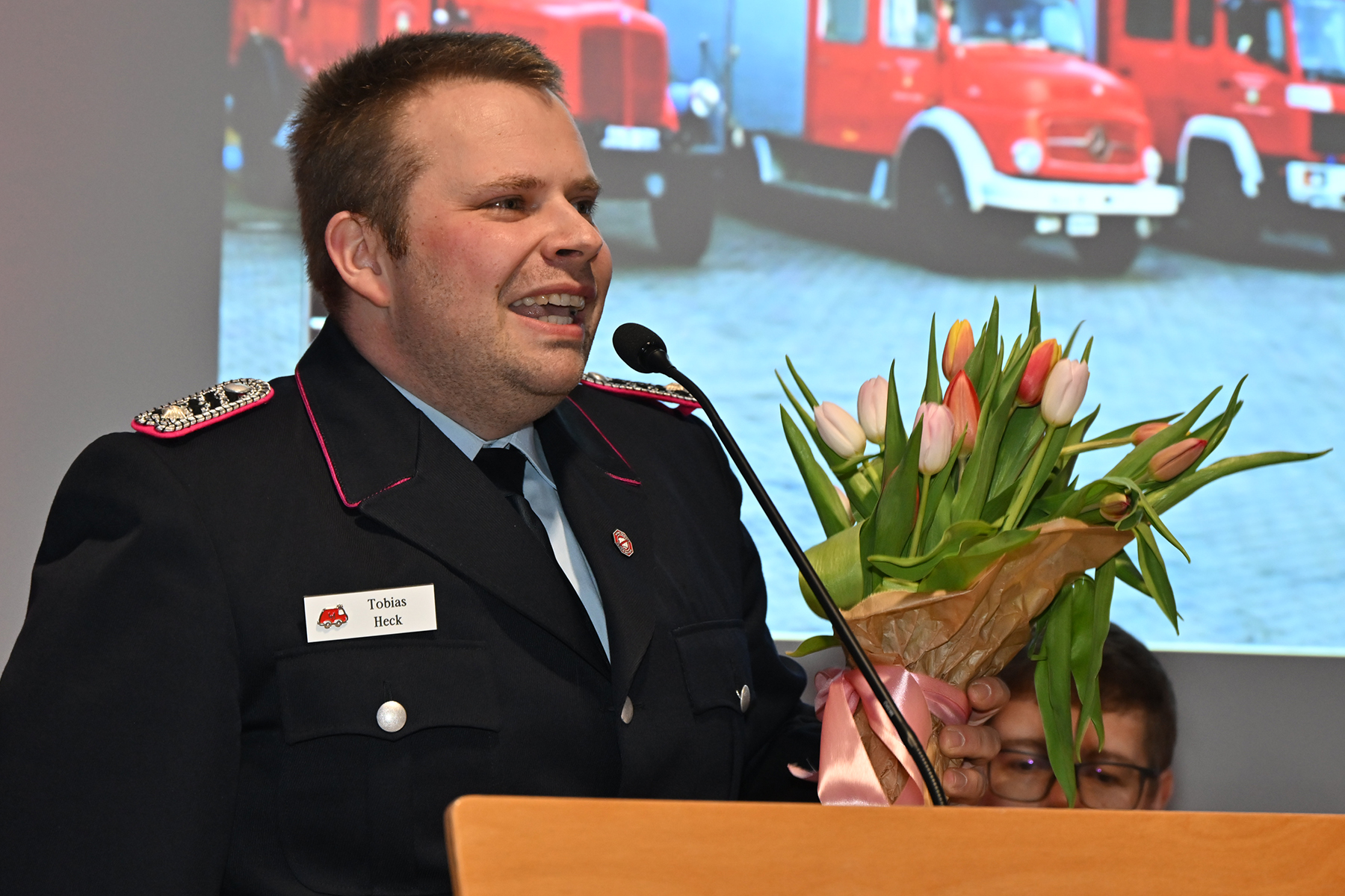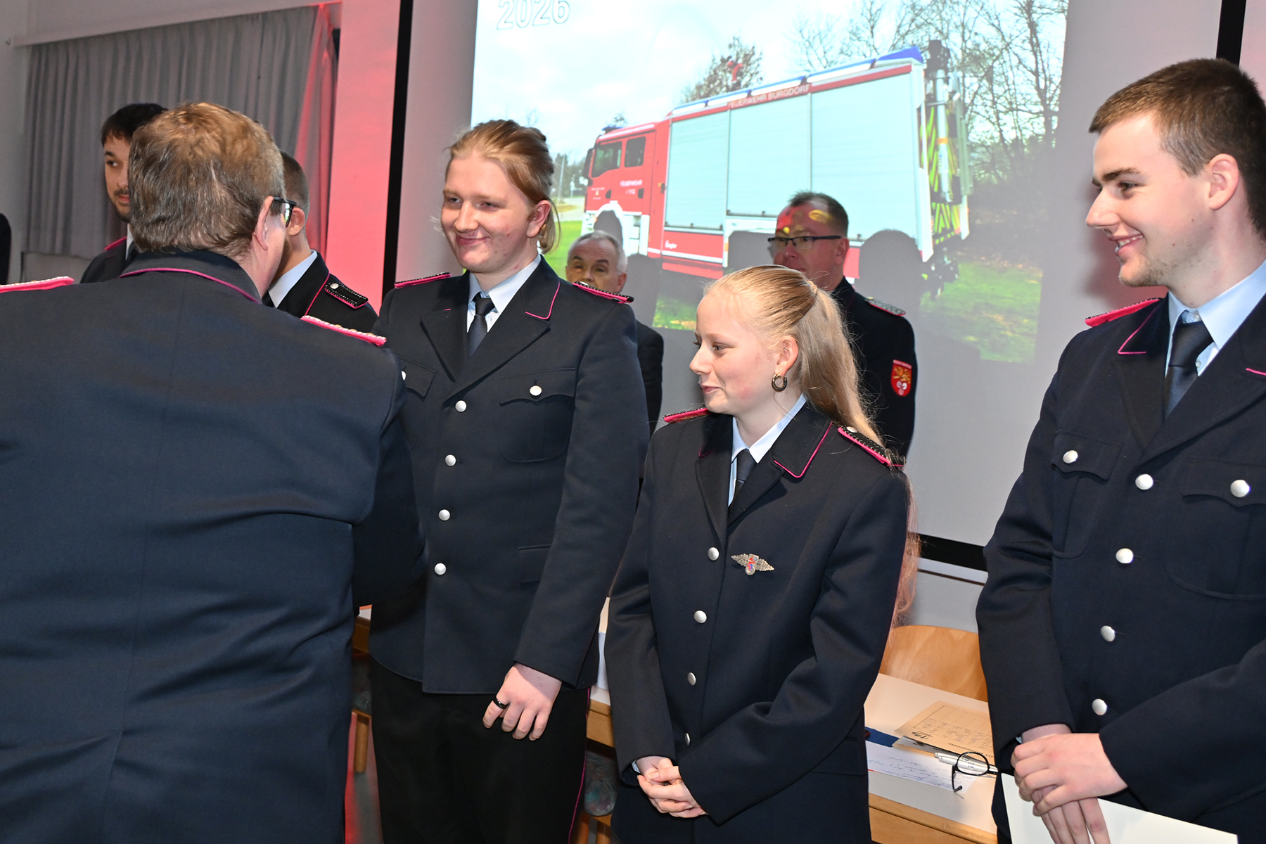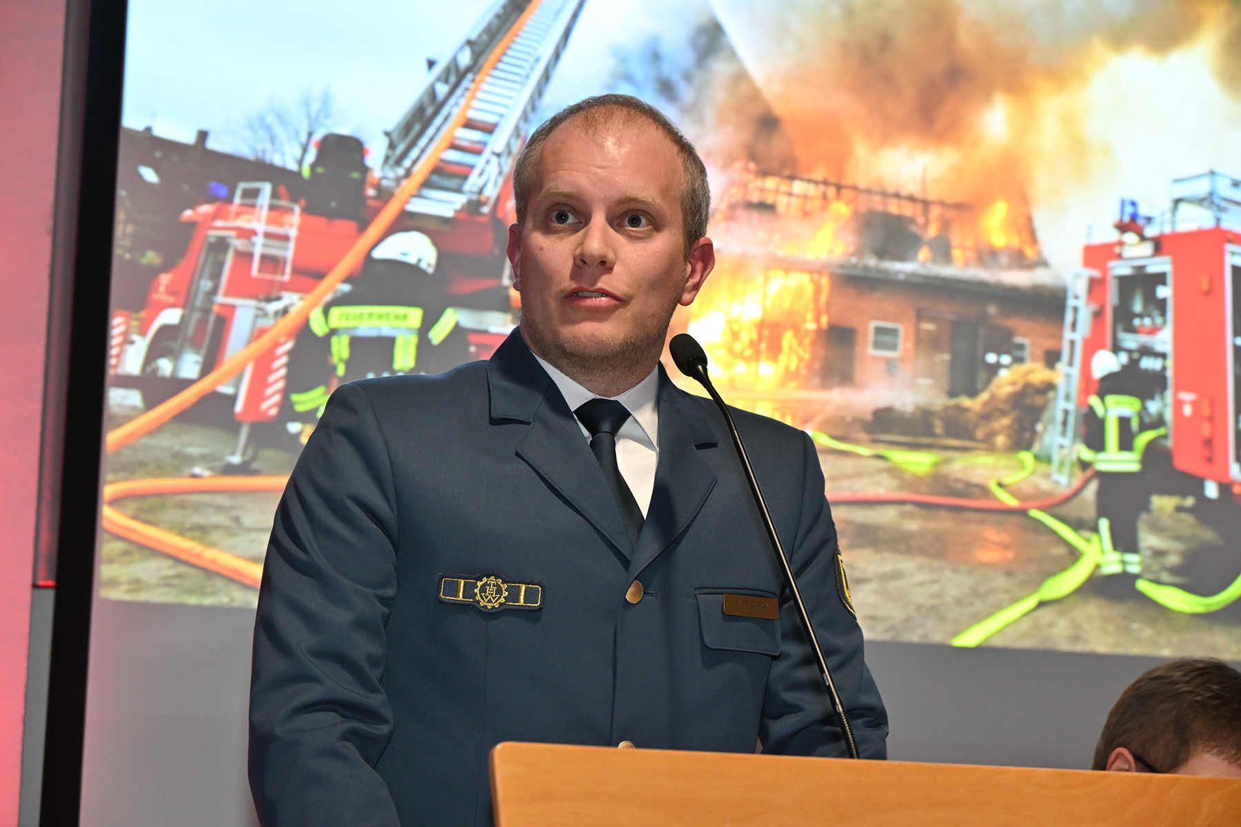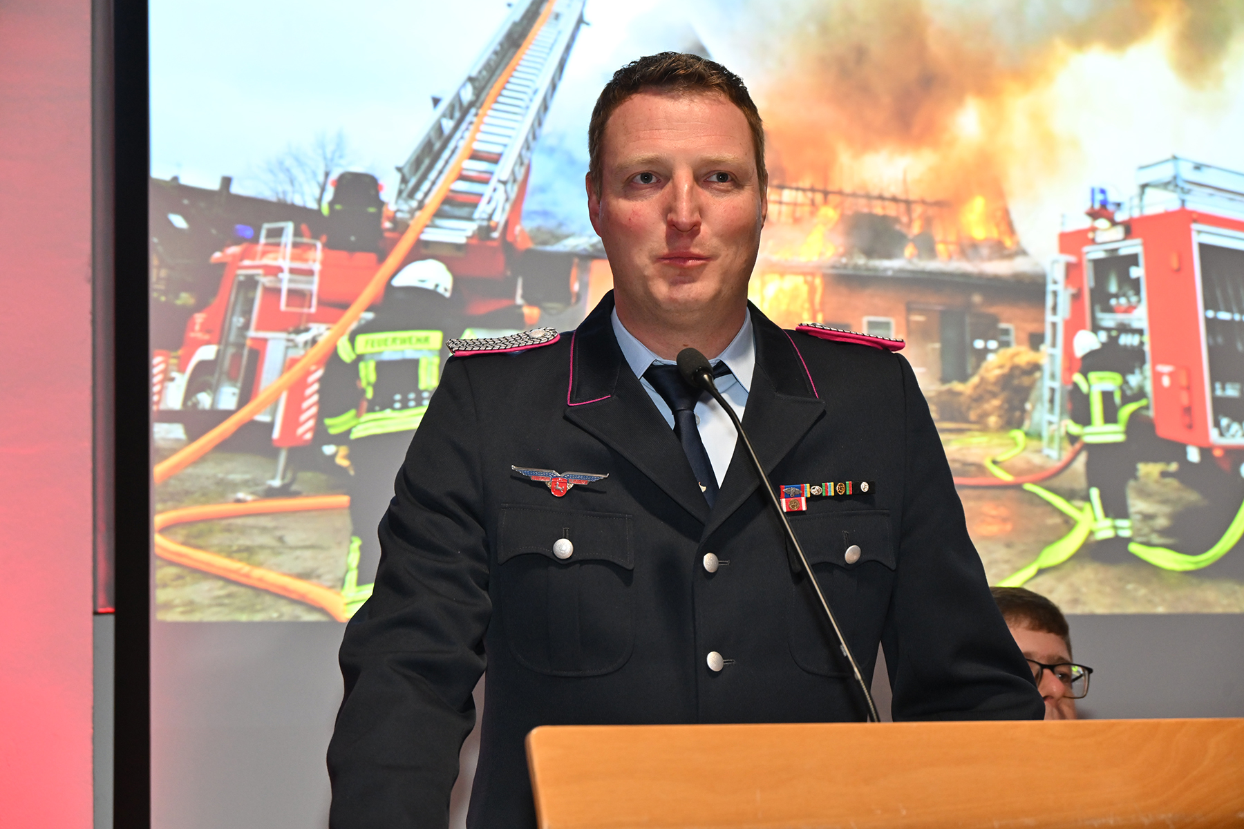 Ortsbrandmeister Florian Bethmann zog eine beeindruckende Bilanz. 2025 sei von den Einsätzen her vergleichsweise ruhig gewesen – und dennoch werde das Jahr in die Geschichte eingehen: als ein Jahr voller großer Investitionen und strategischer Weichenstellungen. 227 Einsätze bewältigte die Wehr, darunter 16 Verkehrsunfälle, 10 Taucheinsätze und 44 Personenrettungen, meist Türöffnungen bei alleinstehenden Senioren. Letzteres nehme seit Jahren zu und bereite ihm zunehmend Sorgen: „Der Nachbar hat keinen Schlüssel mehr, alles wird anonymer.“ Jede Öffnung sei dabei ein Einzelschicksal.