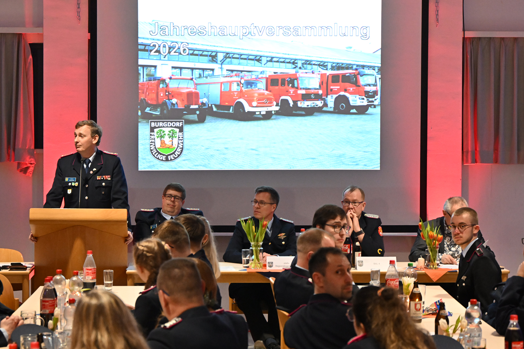 Rund 120 Gäste kamen am gestrigen Sonnabend, 28. Februar 2026, zur Jahreshauptversammlung der Freiwilligen Feuerwehr Burgdorf ins Feuerwehrhaus an der Straße Vor dem Celler Tor. Musikalisch begleitet wurde der Abend vom Musikzug der Freiwilligen Feuerwehren Burgdorf und Hänigsen.