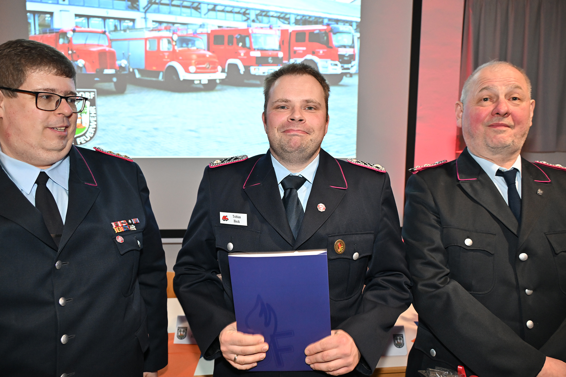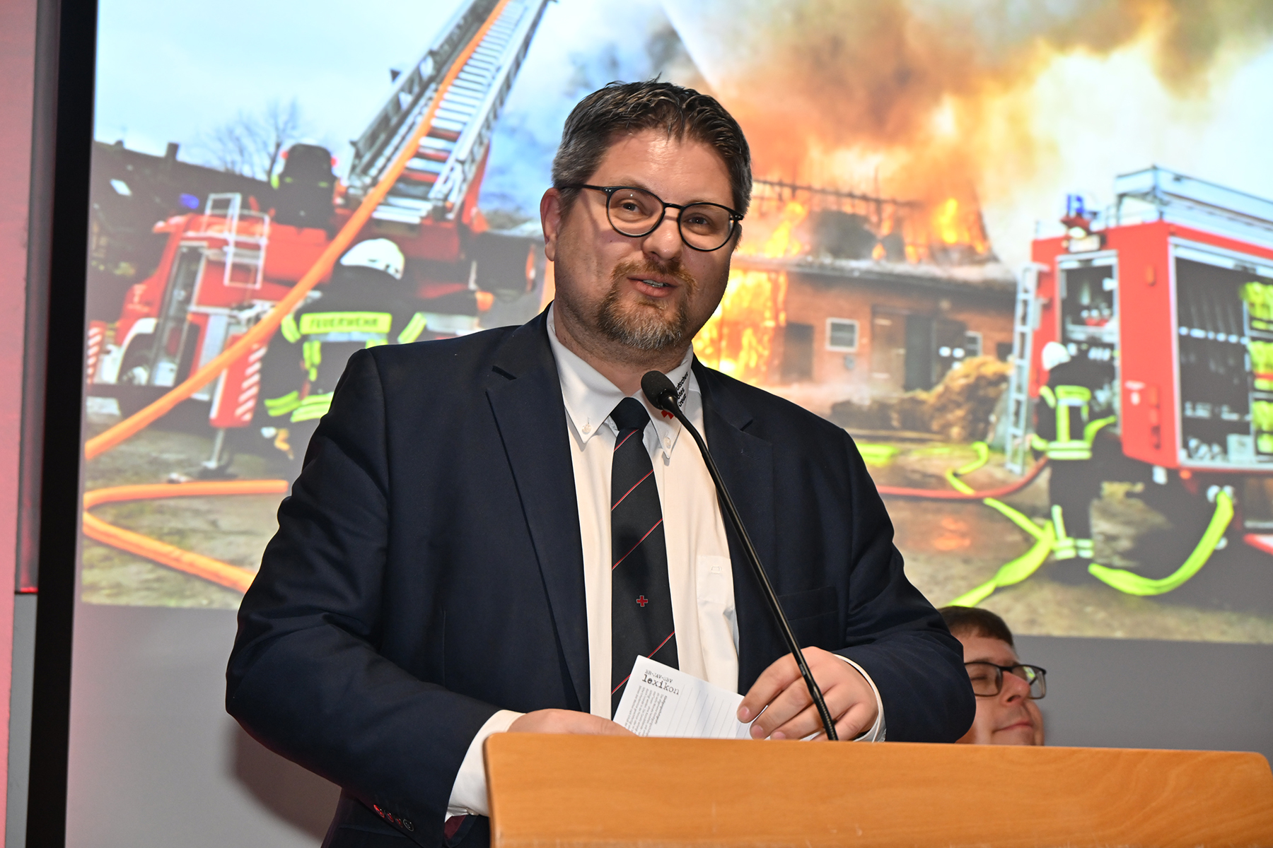 Der emotionale Höhepunkt des Abends war ein Thema, das Bethmann nur vorsichtig ansprach, das aber mehrere Redner aufgriffen: die Verwerfungen rund um seine Ernennung als Ortsbrandmeister im Herbst. Die Verwaltung hatte Zweifel an der Ernennung geäußert – woraufhin sich die Blaulichtfamilie geschlossen hinter Bethmann stellte – nicht nur symbolisch. Dutzende Unterstützer verfolgten die Ausschusssitzung im Ratssaal, die ohne Ergebnis endete. Erst in der darauffolgenden Ratssitzung wurde der Beschluss öffentlich gemacht und Bethmann offiziell für weitere sechs Jahre ernannt. „Was im Herbst passiert ist, kann ich bis heute nicht in Worte fassen“, sagte Bethmann bewegt. Er sei tief geprägt von dem, was er an Solidarität erfahren habe. Mit der Stadt habe man inzwischen einen Neuanfang vereinbart, Raum für Kritik und offene Worte gefunden. „Ich bin zuversichtlich, dass wir eine gute zukünftige Zusammenarbeit pflegen werden.“