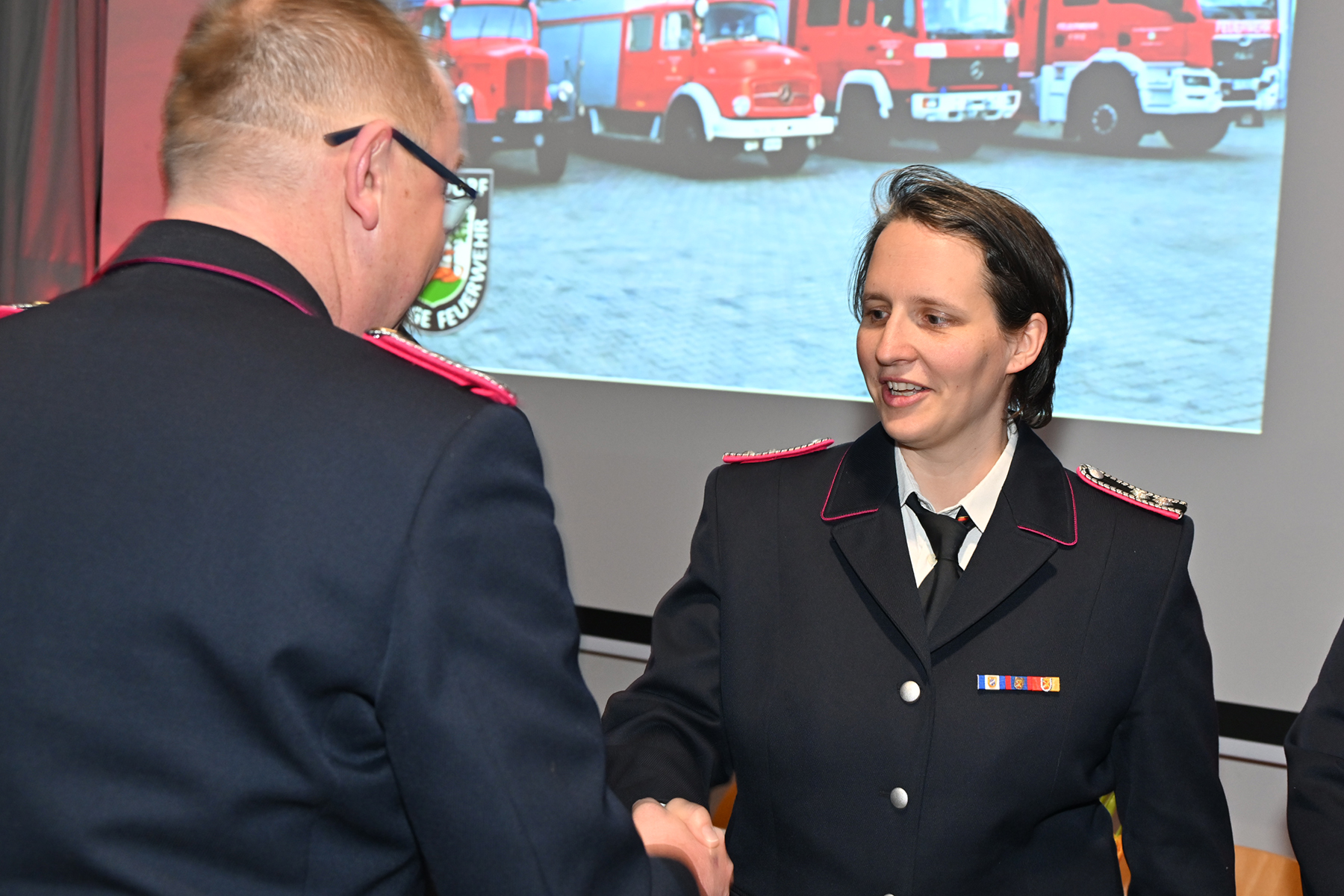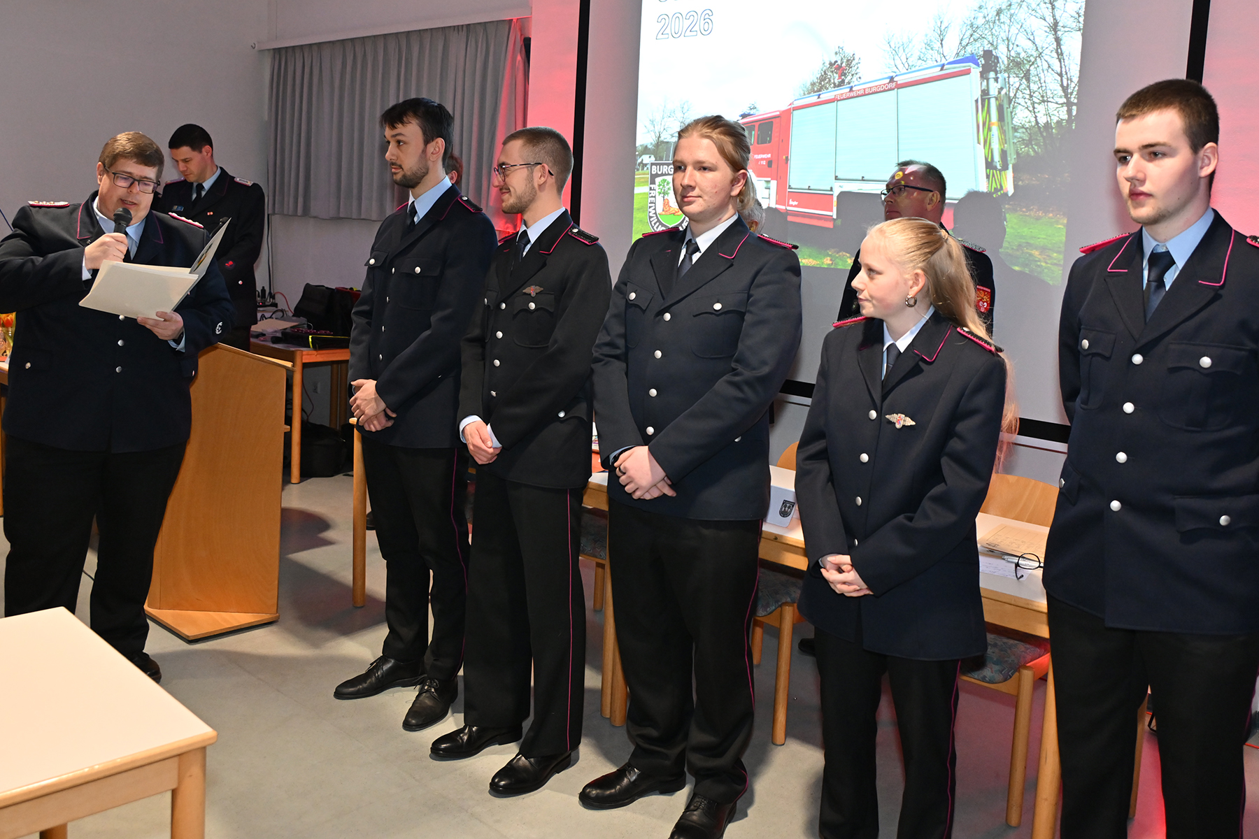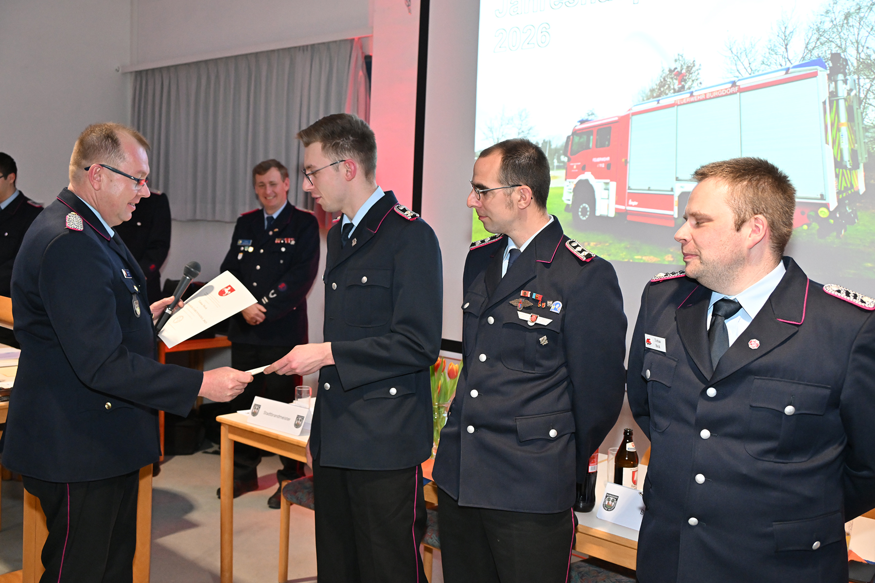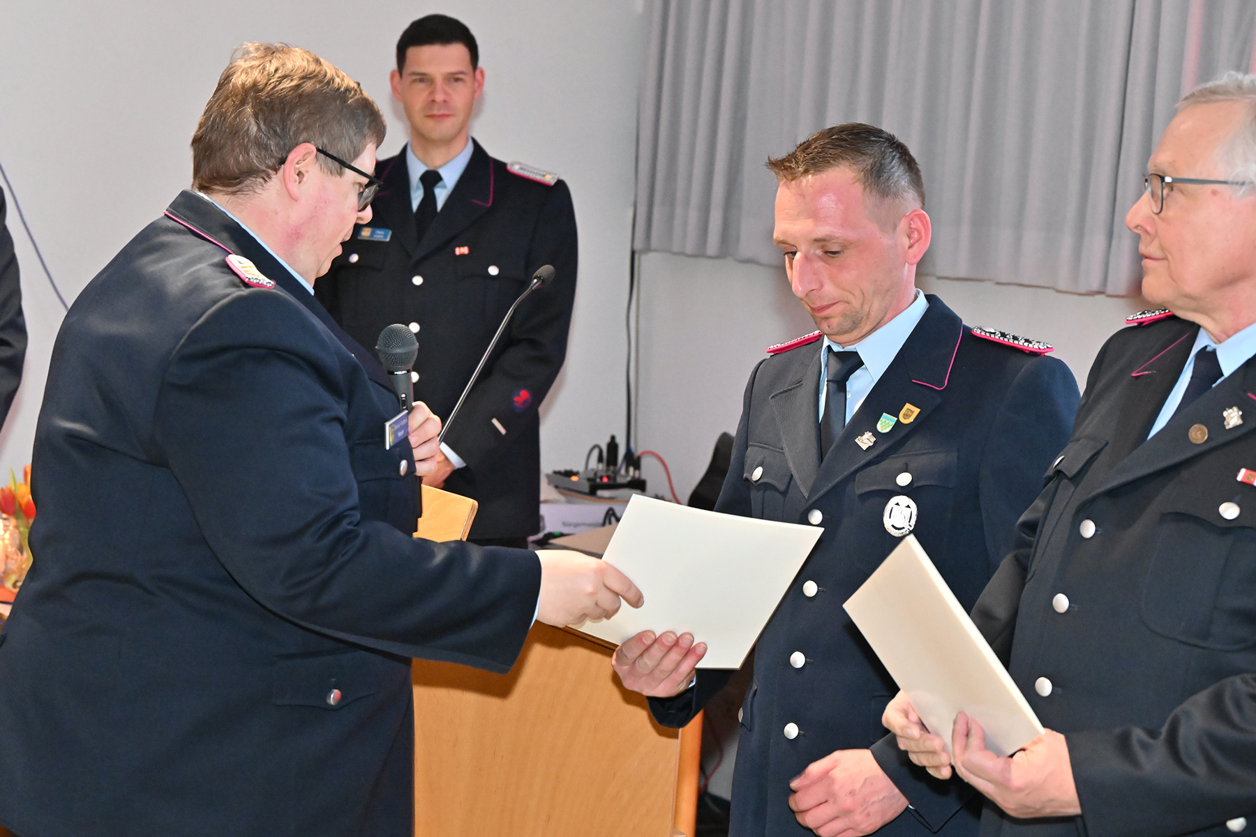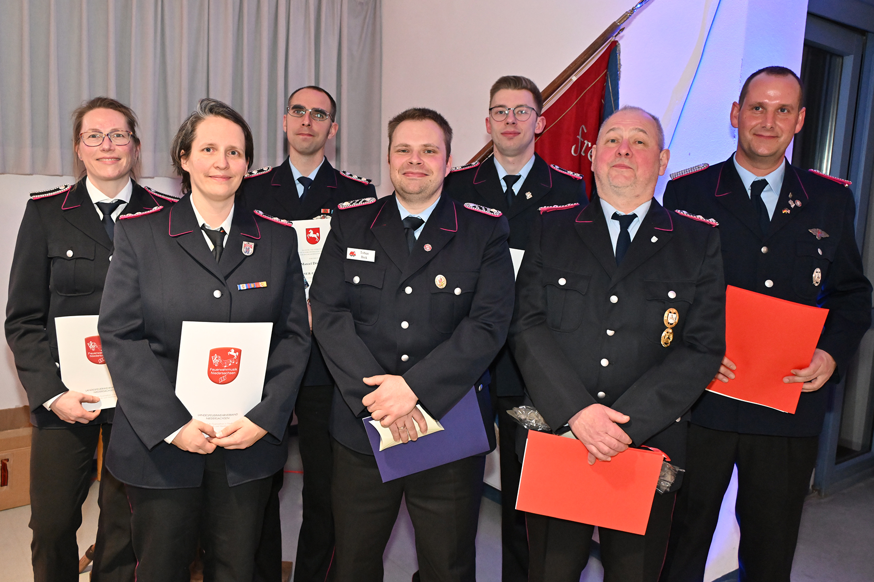 Den Abschluss bildeten Ehrungen und Ernennungen. Lucas Simon, Leah-Sophie Bähre, Henry Schmiedner, Tom Helms und Simon Kirmse wurden vor der Versammlung auf die Fahne der Ortsfeuerwehr zu Feuerwehrmännern und -frauen vereidigt. Sebastian Graf von Görtz und Justus Sparacio wurden zum Oberfeuerwehrmann ernannt, den Dienstgrad Oberlöschmeister erhielten Florian Schäfer, Dennis Fischer, Niklas Gottschalk und Ann-Christin Neef. Tobias Heck, Andre Stockmeyer und Marcel Drietchen wurde nachträglich die Hochwasserehrennadel 2023/2024 verliehen. Kai Katzberg erhielt für 25-jährige aktive Mitgliedschaft das Feuerwehrehrenzeichen des Landes Niedersachsen, Peter Rückriem für 50-jährige Mitgliedschaft. Janine Czurgelies und Melissa Belde wurden für ihre 25-jährige Zugehörigkeit im Feuerwehrmusikzug geehrt.