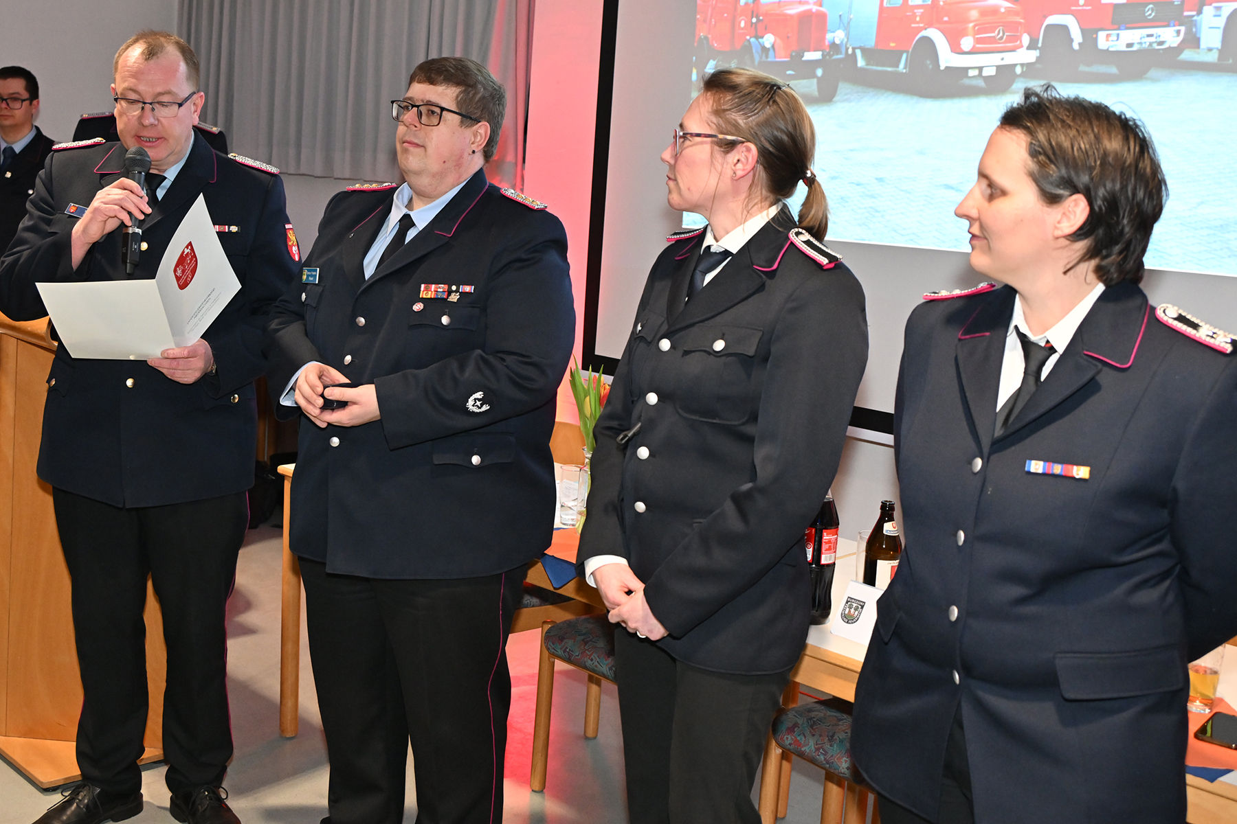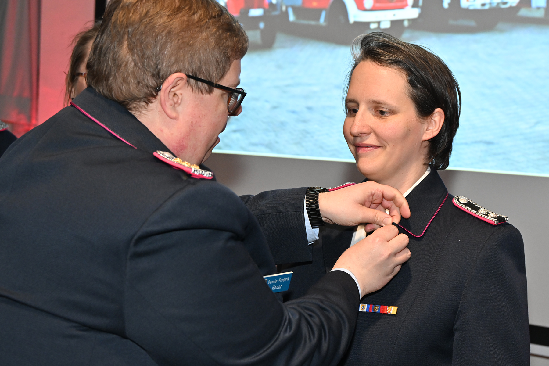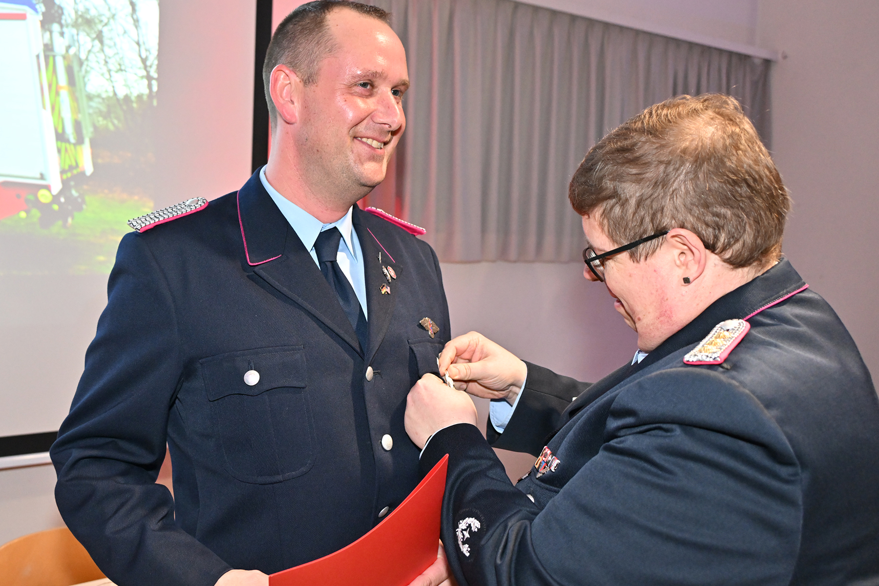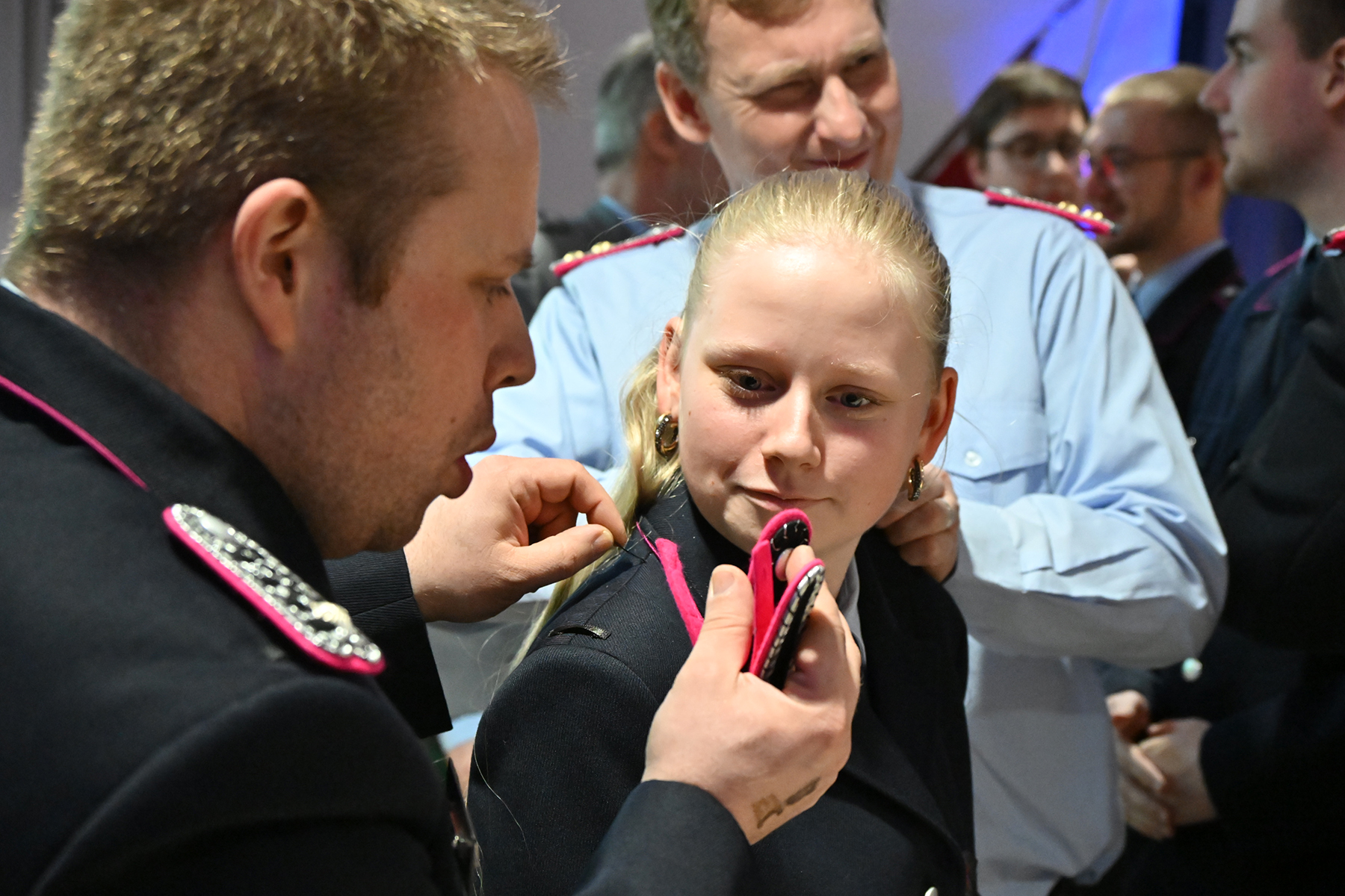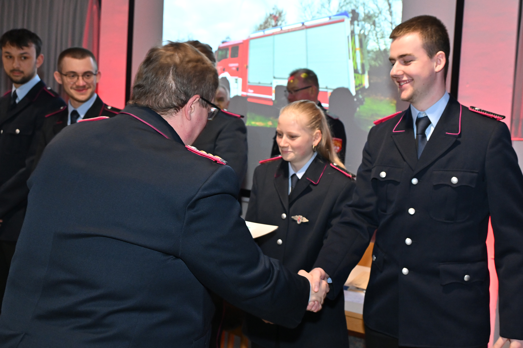 Den Abschluss bildeten Ehrungen und Ernennungen. Lucas Simon, Leah-Sophie Bähre, Henry Schmiedner, Tom Helms und Simon Kirmse wurden vor der Versammlung auf die Fahne der Ortsfeuerwehr zu Feuerwehrmännern und -frauen vereidigt. Sebastian Graf von Görtz und Justus Sparacio wurden zum Oberfeuerwehrmann ernannt, den Dienstgrad Oberlöschmeister erhielten Florian Schäfer, Dennis Fischer, Niklas Gottschalk und Ann-Christin Neef. Tobias Heck, Andre Stockmeyer und Marcel Drietchen wurde nachträglich die Hochwasserehrennadel 2023/2024 verliehen. Kai Katzberg erhielt für 25-jährige aktive Mitgliedschaft das Feuerwehrehrenzeichen des Landes Niedersachsen, Peter Rückriem für 50-jährige Mitgliedschaft. Janine Czurgelies und Melissa Belde wurden für ihre 25-jährige Zugehörigkeit im Feuerwehrmusikzug geehrt.