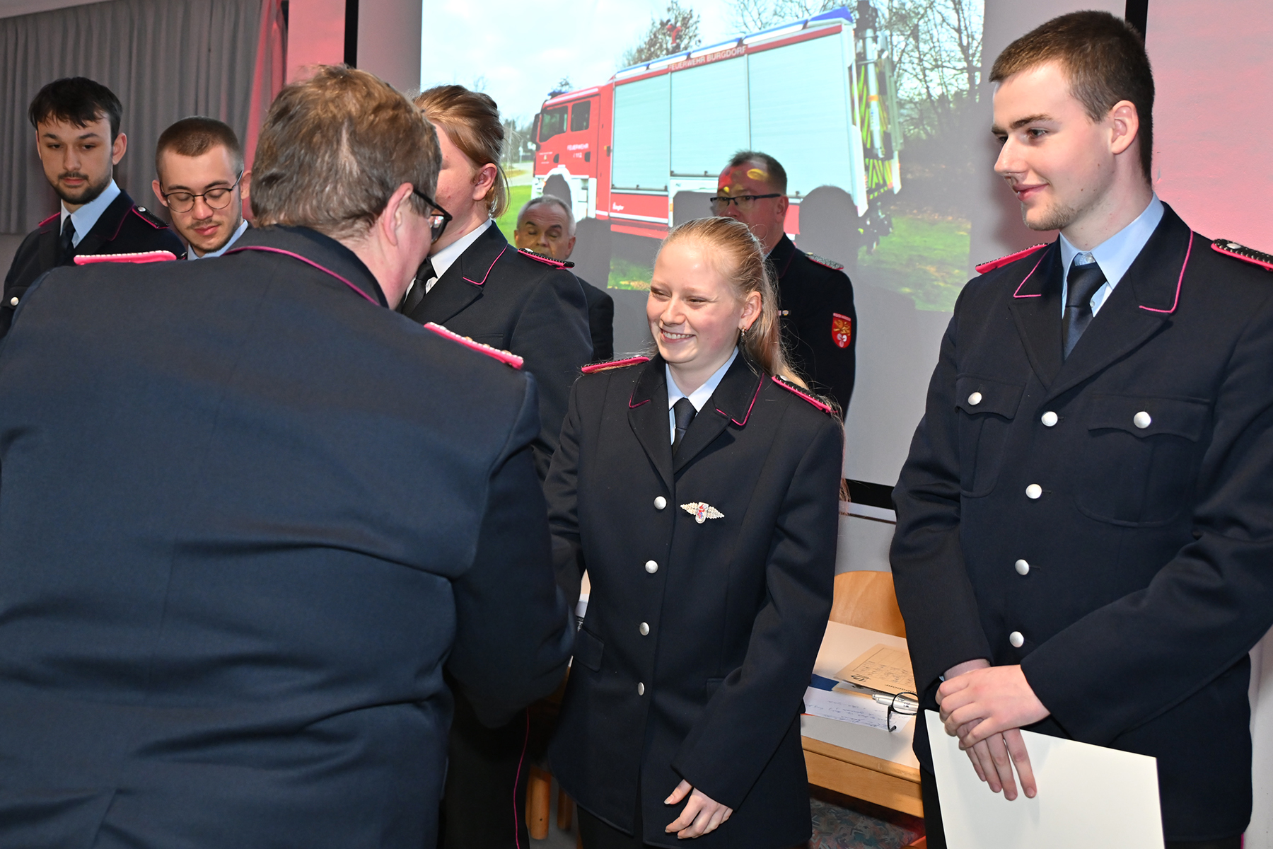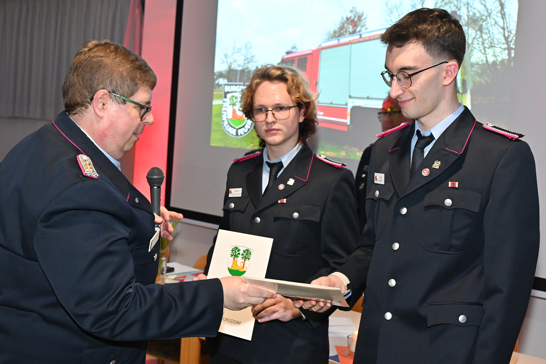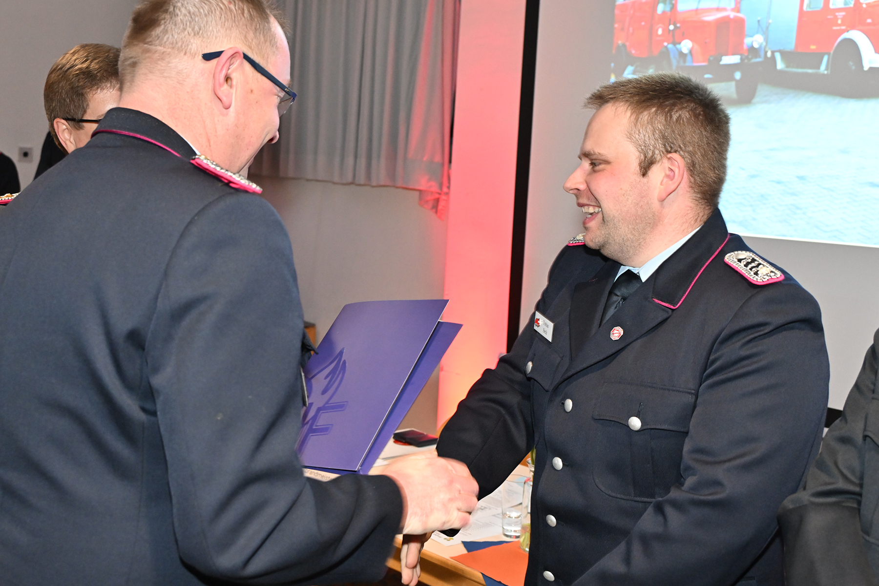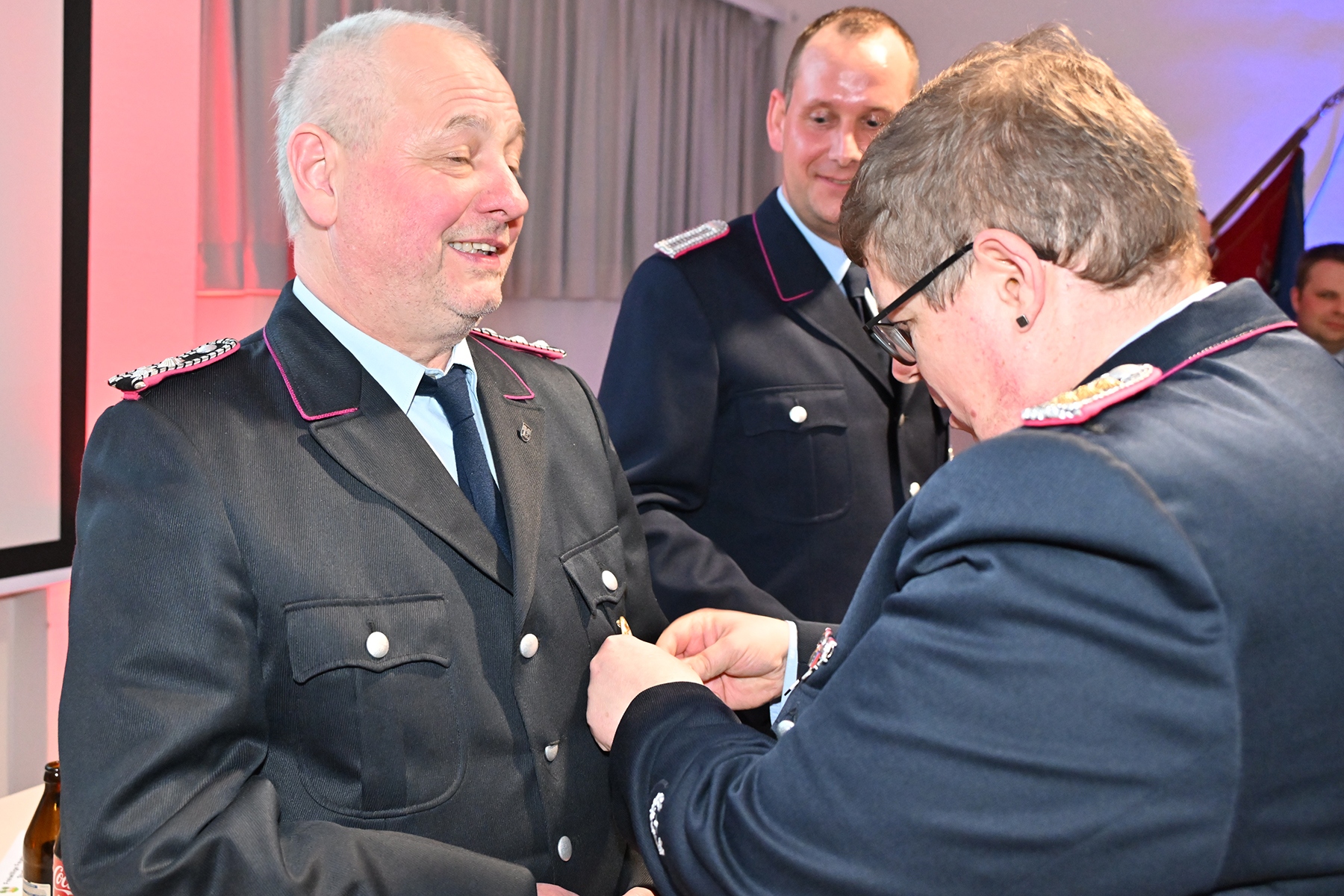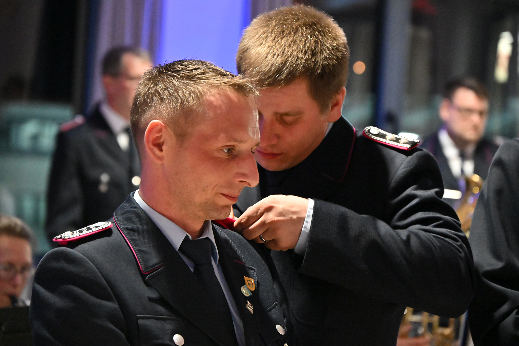 Den Abschluss bildeten Ehrungen und Ernennungen. Lucas Simon, Leah-Sophie Bähre, Henry Schmiedner, Tom Helms und Simon Kirmse wurden vor der Versammlung auf die Fahne der Ortsfeuerwehr zu Feuerwehrmännern und -frauen vereidigt. Sebastian Graf von Görtz und Justus Sparacio wurden zum Oberfeuerwehrmann ernannt, den Dienstgrad Oberlöschmeister erhielten Florian Schäfer, Dennis Fischer, Niklas Gottschalk und Ann-Christin Neef. Tobias Heck, Andre Stockmeyer und Marcel Drietchen wurde nachträglich die Hochwasserehrennadel 2023/2024 verliehen. Kai Katzberg erhielt für 25-jährige aktive Mitgliedschaft das Feuerwehrehrenzeichen des Landes Niedersachsen, Peter Rückriem für 50-jährige Mitgliedschaft. Janine Czurgelies und Melissa Belde wurden für ihre 25-jährige Zugehörigkeit im Feuerwehrmusikzug geehrt.