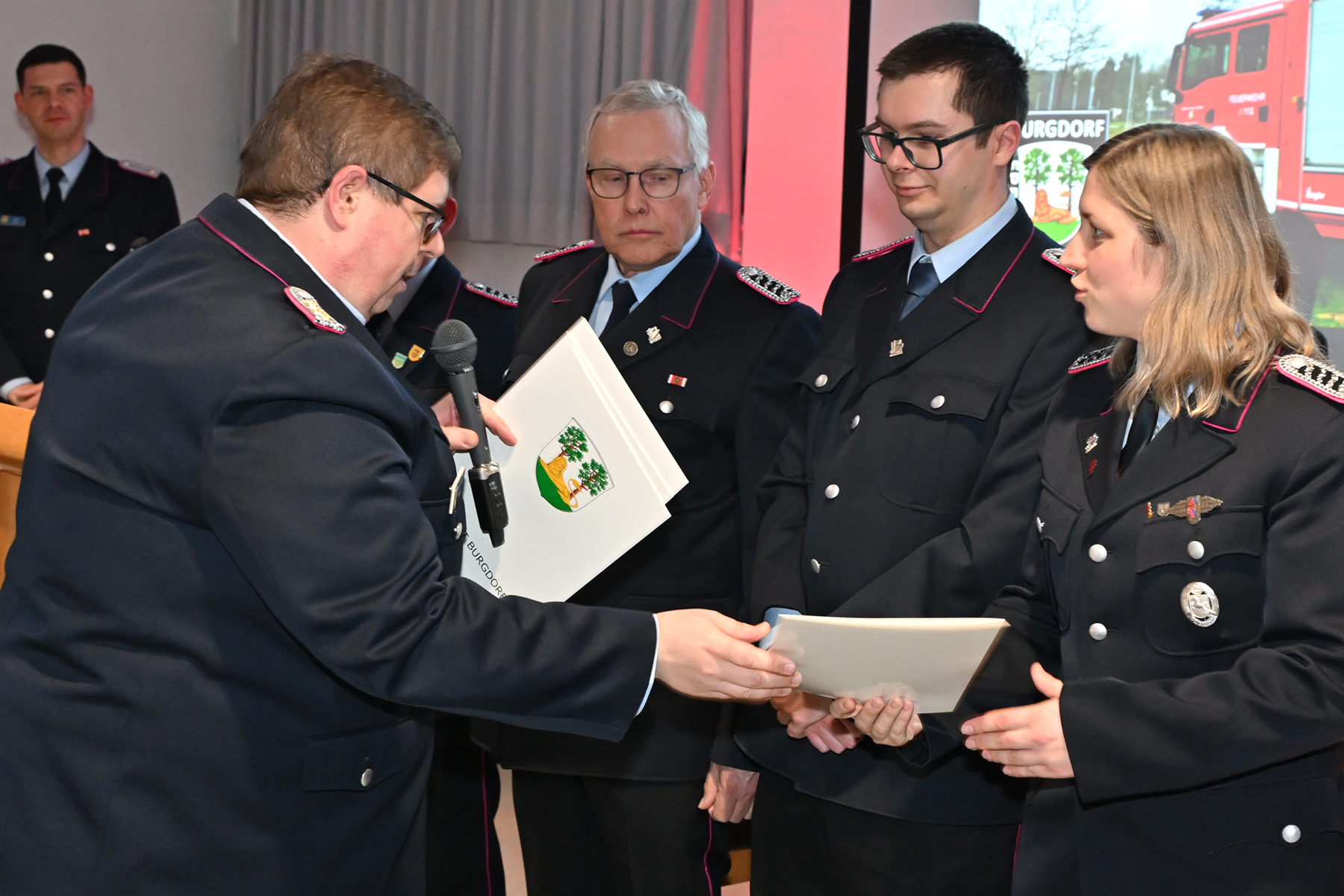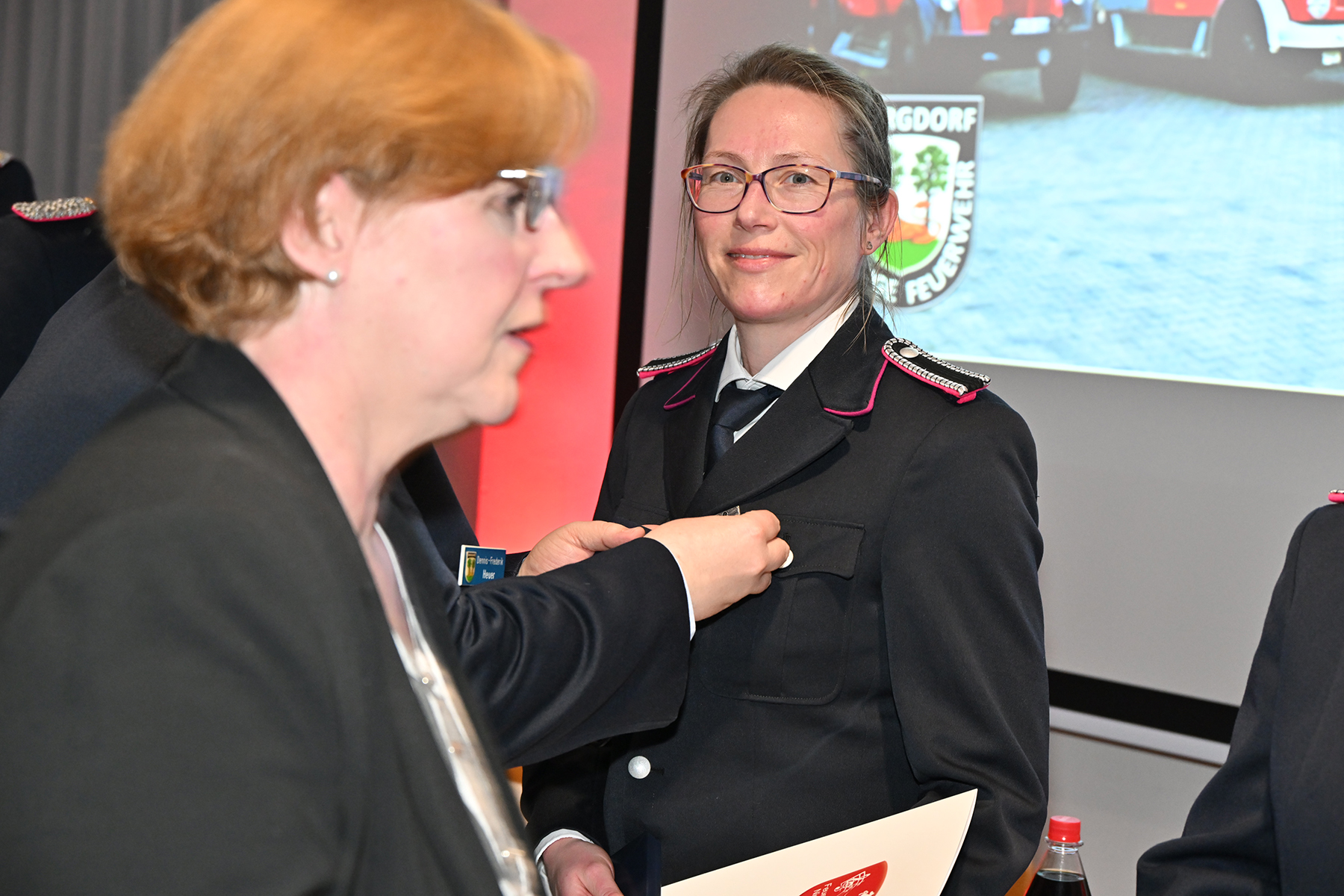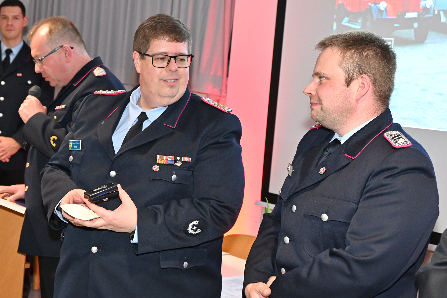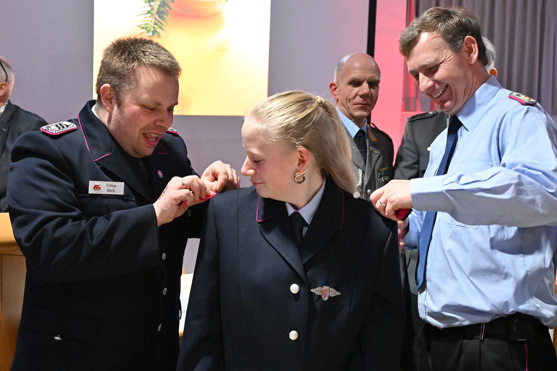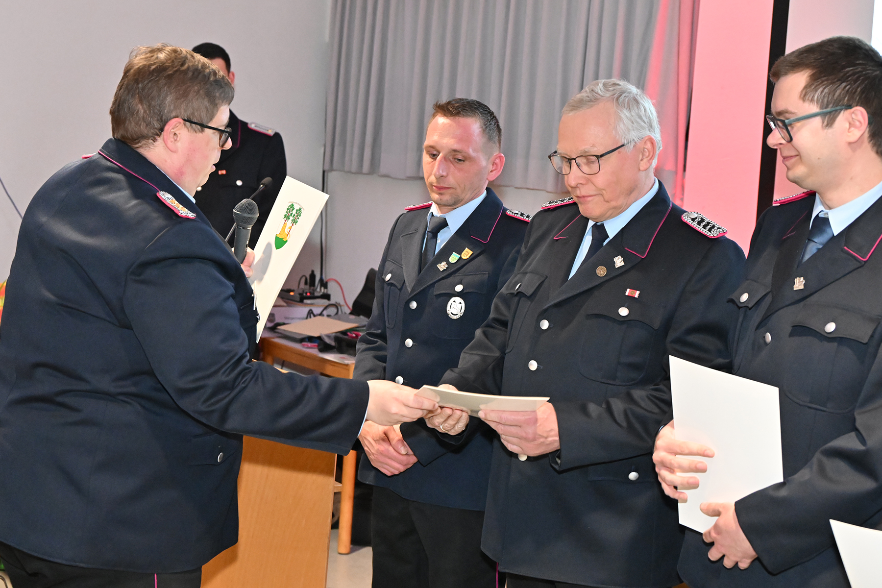 Den Abschluss bildeten Ehrungen und Ernennungen. Lucas Simon, Leah-Sophie Bähre, Henry Schmiedner, Tom Helms und Simon Kirmse wurden vor der Versammlung auf die Fahne der Ortsfeuerwehr zu Feuerwehrmännern und -frauen vereidigt. Sebastian Graf von Görtz und Justus Sparacio wurden zum Oberfeuerwehrmann ernannt, den Dienstgrad Oberlöschmeister erhielten Florian Schäfer, Dennis Fischer, Niklas Gottschalk und Ann-Christin Neef. Tobias Heck, Andre Stockmeyer und Marcel Drietchen wurde nachträglich die Hochwasserehrennadel 2023/2024 verliehen. Kai Katzberg erhielt für 25-jährige aktive Mitgliedschaft das Feuerwehrehrenzeichen des Landes Niedersachsen, Peter Rückriem für 50-jährige Mitgliedschaft. Janine Czurgelies und Melissa Belde wurden für ihre 25-jährige Zugehörigkeit im Feuerwehrmusikzug geehrt.