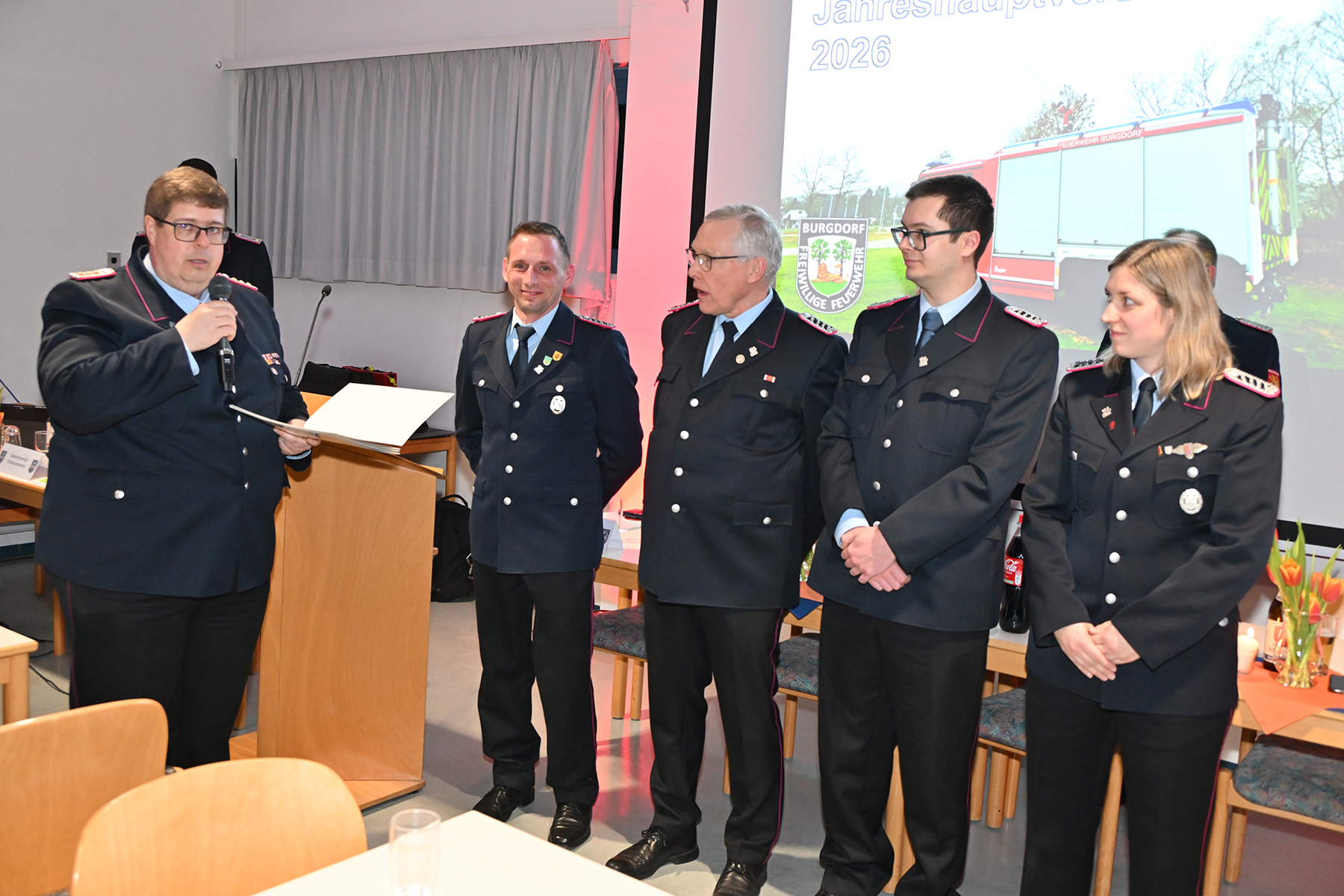 Ortsbrandmeister Florian Bethmann begrüßte zahlreiche Gäste aus Politik, Feuerwehr und befreundeten Organisationen. Für die Stadt nahmen der Erste Stadtrat Michael Kugel und die Feuerwehrausschussvorsitzende und stellvertretende Bürgermeisterin Beate Neitzel teil – Bürgermeister Armin Pollehn hatte sich kurzfristig krankheitsbedingt entschuldigt. Von der Feuerwehr waren unter anderem der stellvertretende Regionsbrandmeister Nils Wellmanns, Brandschutzabschnittsleiter Tobias Jacob, Stadtbrandmeister Dennis-Frederik Heuer, sowie Ehrenstadtbrandmeister Alfred Brönnemann anwesend. Ebenfalls begrüßt wurden die Ortsbrandmeister der umliegenden Wehren: Reinhard Nicks (Heeßel), Timo Scheffler (Schillerslage), Jan Bertke (Otze), Meik Zieseniß (Immensen), Alexander Heiduck (Hänigsen) und Martin Voß (Röddensen). Aus den befreundeten Organisationen waren Rüdiger Nijenhof (DRK), Lukas Czeszak (THW), Jörg Hoppe (Schützengesellschaft), Thomas Lüer (VVV) sowie der Superintendent Burgwedel-Isernhagen, Dirk Jonas, gekommen.