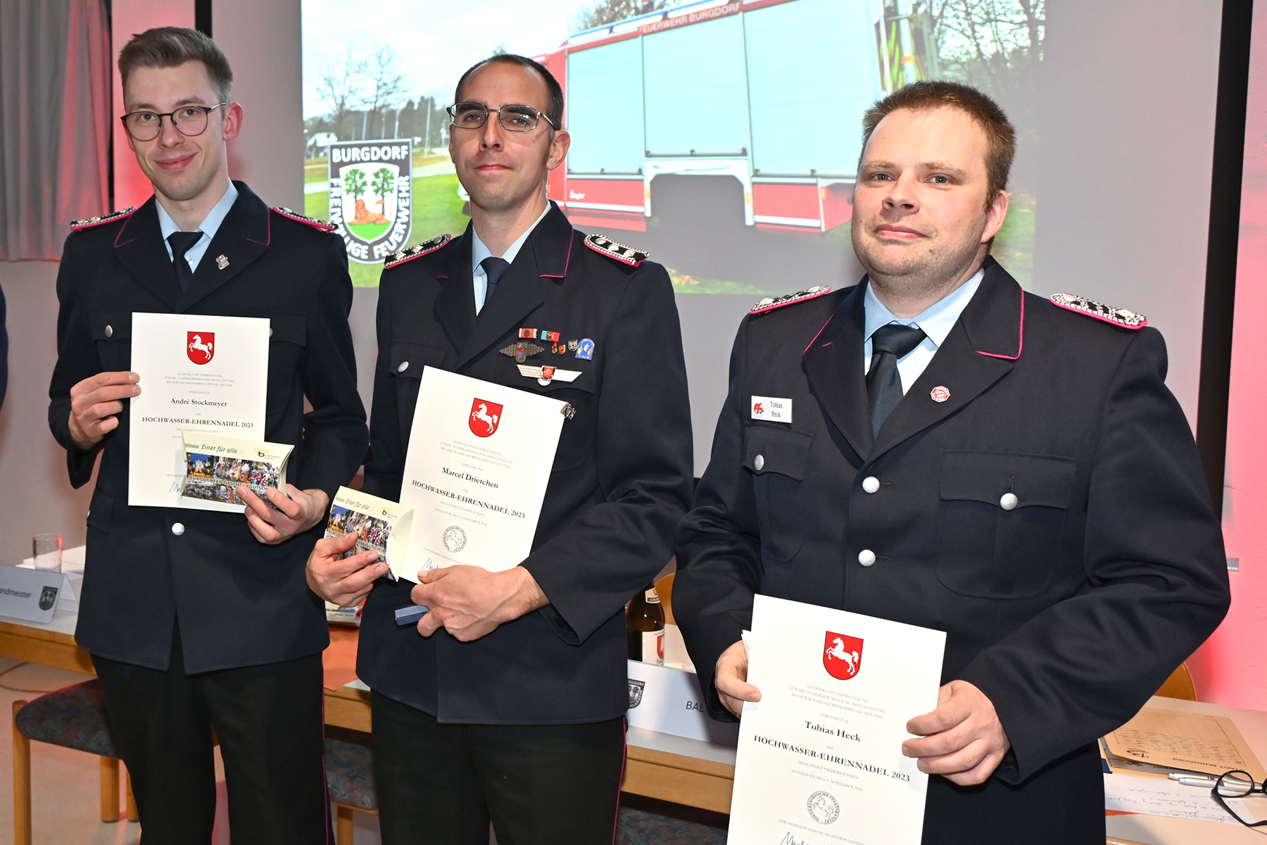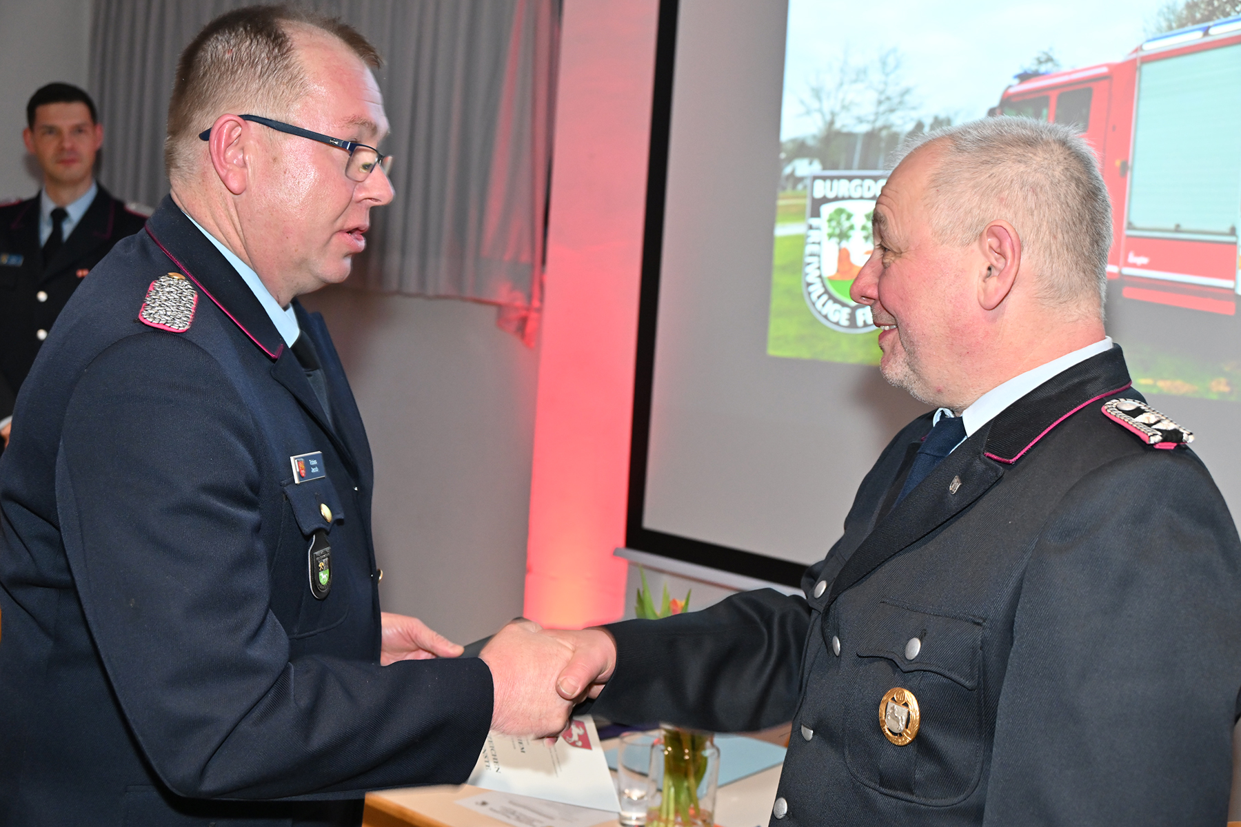 Einen großen Teil seines Berichts widmete Bethmann dem Netzwerk, auf das die Feuerwehr Burgdorf bauen kann. Die Zusammenarbeit der acht Ortsfeuerwehren sei so gut wie seit 20 Jahren nicht mehr. Besonders hob er auch die Feuerwehr Immensen hervor, die mit ihrem Tanklöschfahrzeug so manche Situation gerettet habe, sowie die Feuerwehr Hänigsen mit ihrem Gerätewagen Messtechnik, der zehnmal im Jahr in Burgdorf im Einsatz war – meist bei ungewöhnlichen Einsätzen mit gefährlichen Stoffen. Die Zusammenarbeit mit beiden solle weiter intensiviert werden. Dank gehe auch über die Stadtgrenzen hinaus: An die gesamte Stadtfeuerwehr Lehrte und Burgwedel mit ihren Drehleitern, die Regions-Drohnengruppe aus Ahlten, und „wenn gar nichts mehr geht“, unterstütze die Feuerwehr Röddensen bei der Tierrettung.
