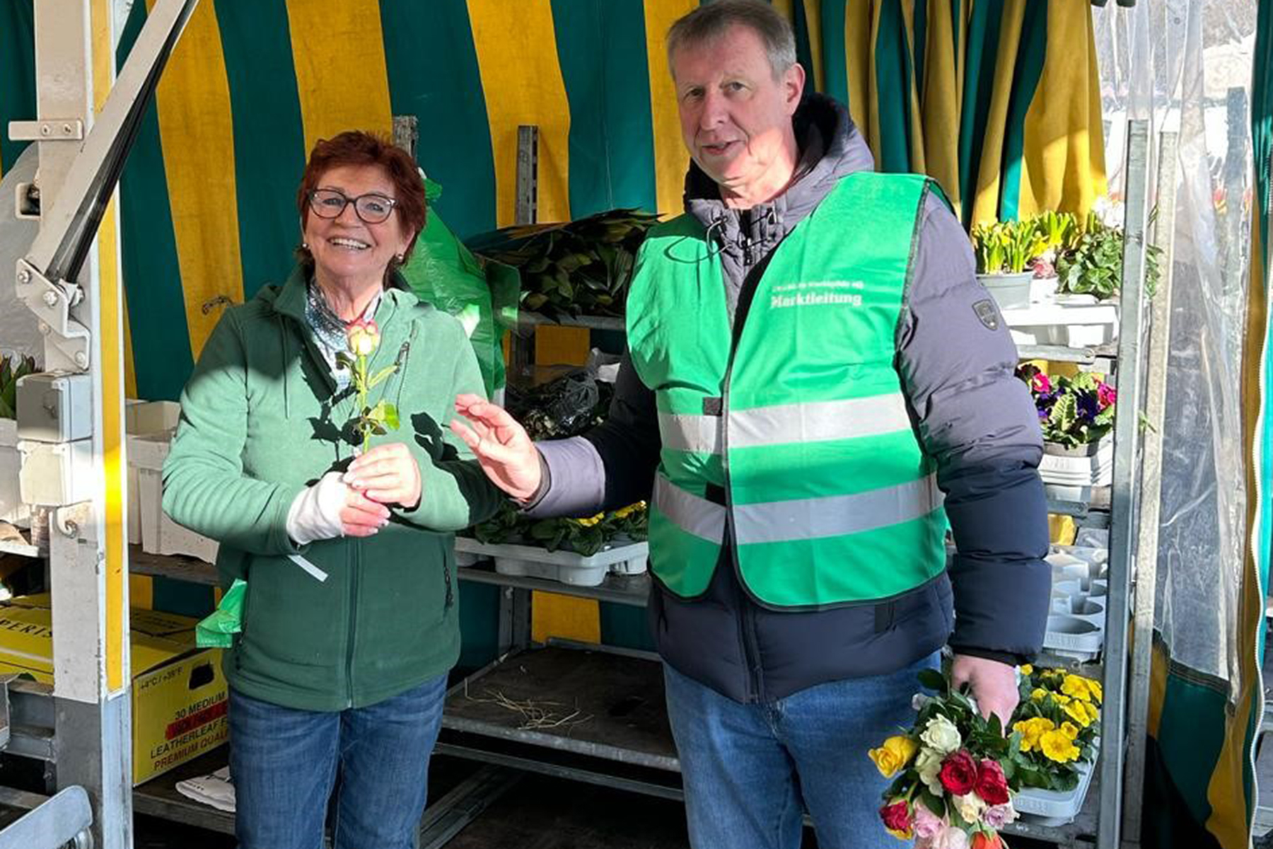 Blumengruß zum Weltfrauentag auf dem Burgdorfer Wochenmarkt