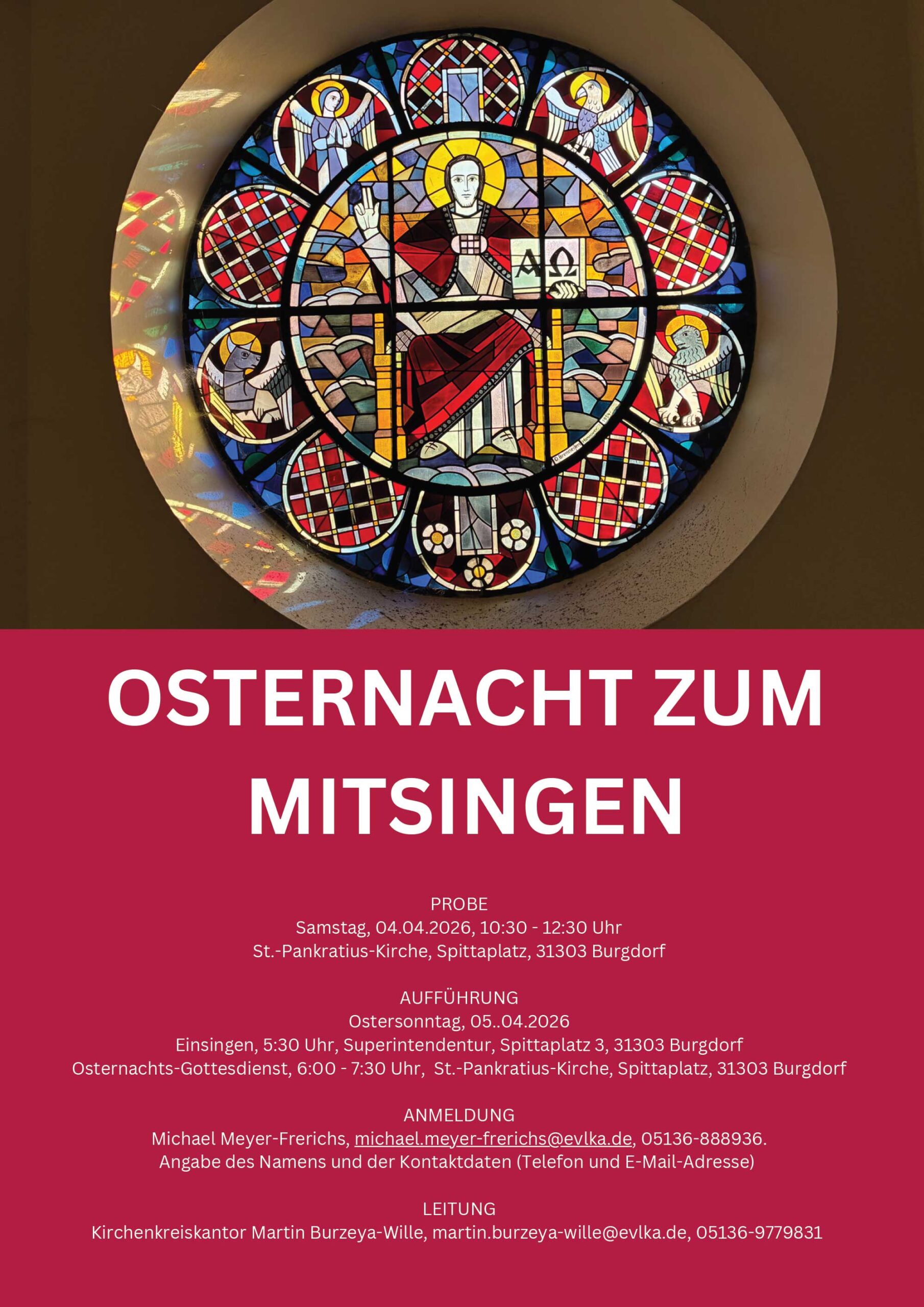 Die Probe findet am Sonnabend, 4. April 2026, 10:30 bis 12:30 Uhr, in der St.-Pankratius-Kirche am Spittaplatz in Burgdorf statt. Zur Aufführung treffen sich alle Projekt-Teilnehmenden am Ostersonntag, 05.04.2026, zum Einsingen um 5:30 Uhr in der Superintendentur am Spittaplatz 3 in Burgdorf und zum Osternachts-Gottesdienst von 6:00 bis 7:30 Uhr in der St.-Pankratius-Kirche.