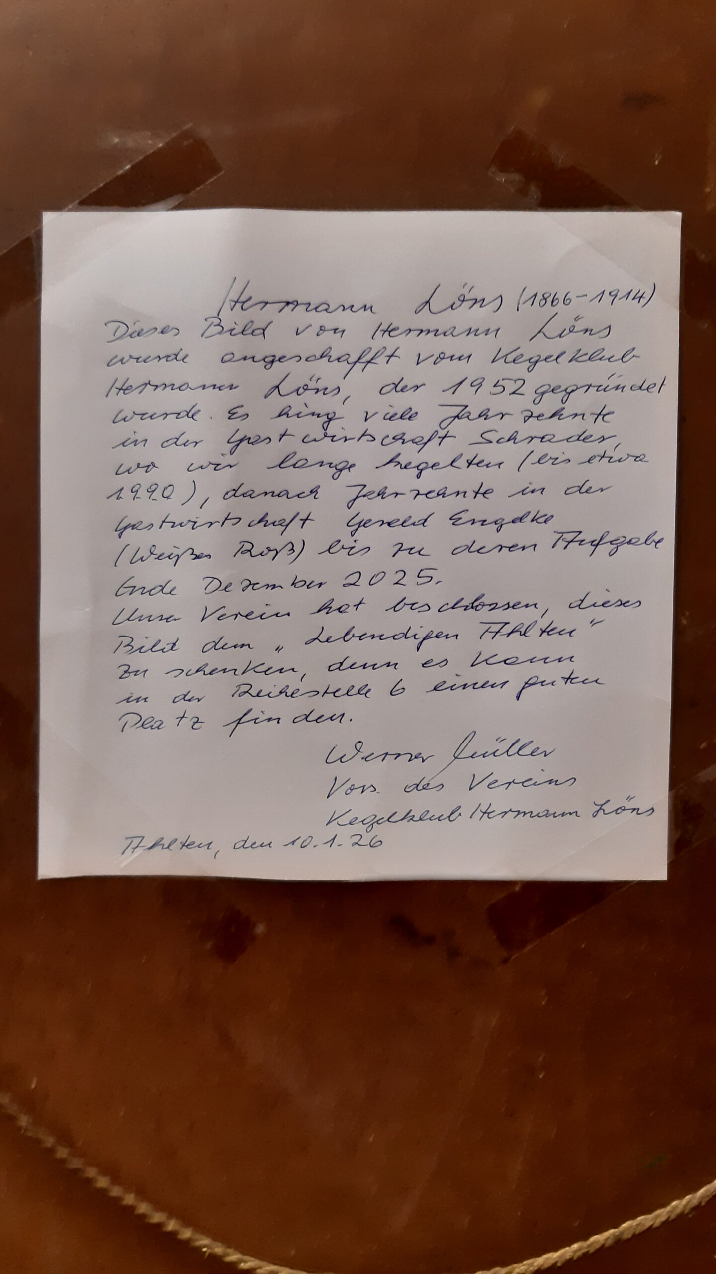 Einige der Anwesenden erkannten das Bild sofort wieder. Über viele Jahre hatte es in Clubzimmern verschiedener Ahltener Gaststätten gehangen. Die Geschichte des Gemäldes hatte Werner Müller, der Vorsitzende des Kegelclubs Hermann Löns, zuvor aufgeschrieben. Darin heißt es: „Dieses Bild von Hermann Löns (1866 – 1914) wurde angeschafft vom Kegelclub Hermann Löns, der 1952 gegründet wurde. Es hing viele Jahrzehnte in der Gastwirtschaft Schrader, wo wir lange kegelten (bis etwa 1990), danach Jahrzehnte in der Gastwirtschaft Engelke bis zu deren Aufgabe Ende Dezember 2025. Unser Verein hat beschlossen, dieses Bild dem „Lebendigen Ahlten“ zu schenken, denn es kann in der Reihestelle 6 einen guten Platz finden.“