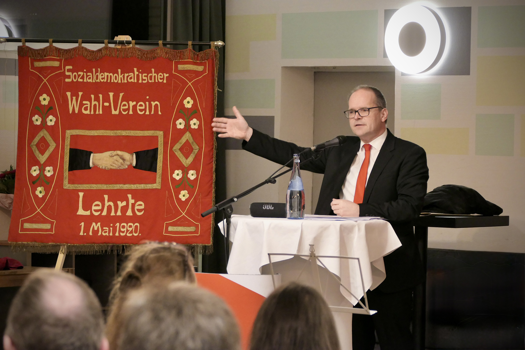 Reent Stade, Vorsitzender der SPD-Abteilung Lehrte-Kernstadt, enthüllte zu Beginn seiner Rede ein historisches Parteibanner von 1920. Sozialdemokraten hatten es während der NS-Zeit versteckt und so gerettet. Das Banner erinnert an die Anfänge der sozialdemokratischen Arbeiterbewegung in Lehrte.