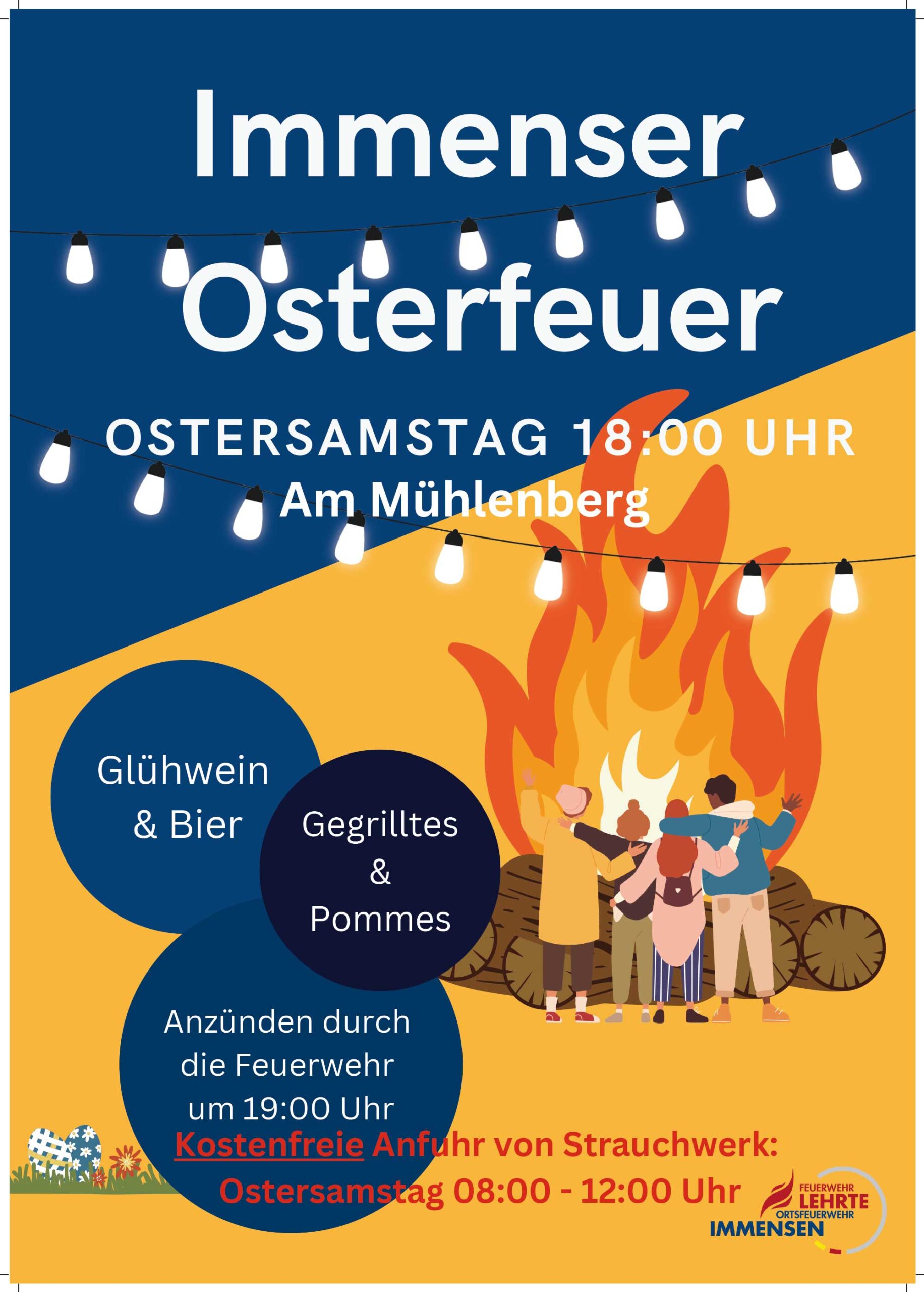 In Immensen findet am Sonnabend, 4. April 2026, das traditionelle Osterfeuer statt. Beginn ist um 18 Uhr am Mühlenberg.
