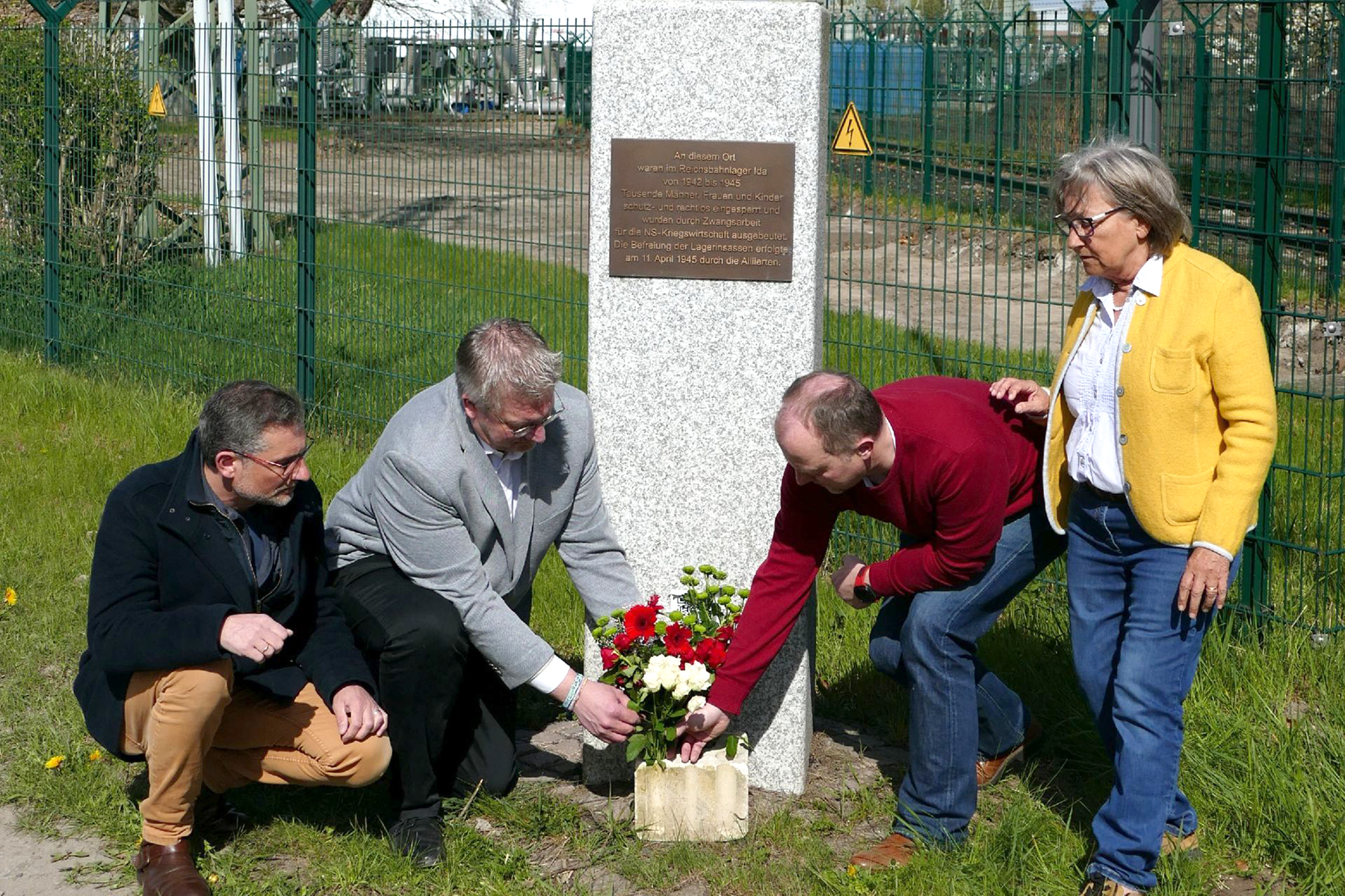 Ehrung der Zwangsarbeiterinnen und Zwangsarbeiter (von links): Reent Stade, Michael Clement, Timo Bönig und Helga Laube-Hoffmann.