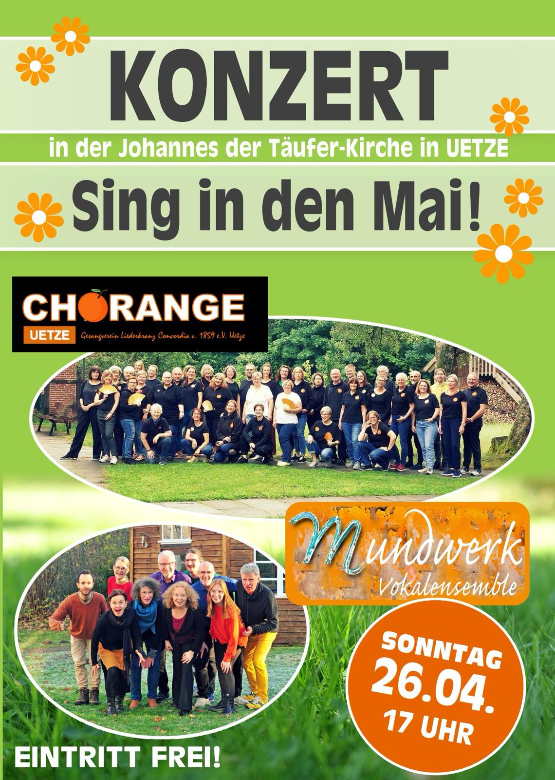 Die beiden Uetzer Chöre Chorange und das Vokalensemble Mundwerk laden am Sonntag, 26. April 2026, um 17 Uhr zu ihrem ersten gemeinsamen Konzert ein. Unter dem Titel „Sing in den Mai!“ präsentieren sie in der Johannes-der-Täufer-Kirche in Uetze ein breit gefächertes A-cappella-Programm. Der Eintritt ist frei.
