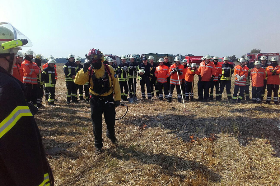 Am Vormittag gab es im Feuerwehrgerätehaus in Wettmar die theoretischen Grundlagen, danach ging es aus dem Ort hinaus zu einem echten Brand. Die Freiwilligen der Ortswehren mussten ihr neues Wissen das erste Mal bei einem Stoppelfeldbrand anwenden: Harken, Spaten und Feuerpatschen gehörten zu den primären Arbeitsgeräten, die im Normalfall nicht so häufig benutzt werden.