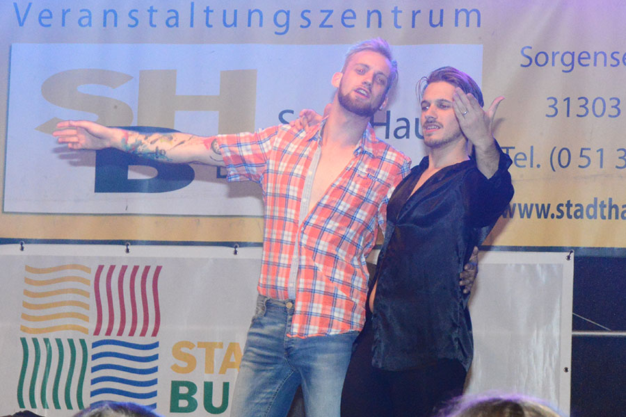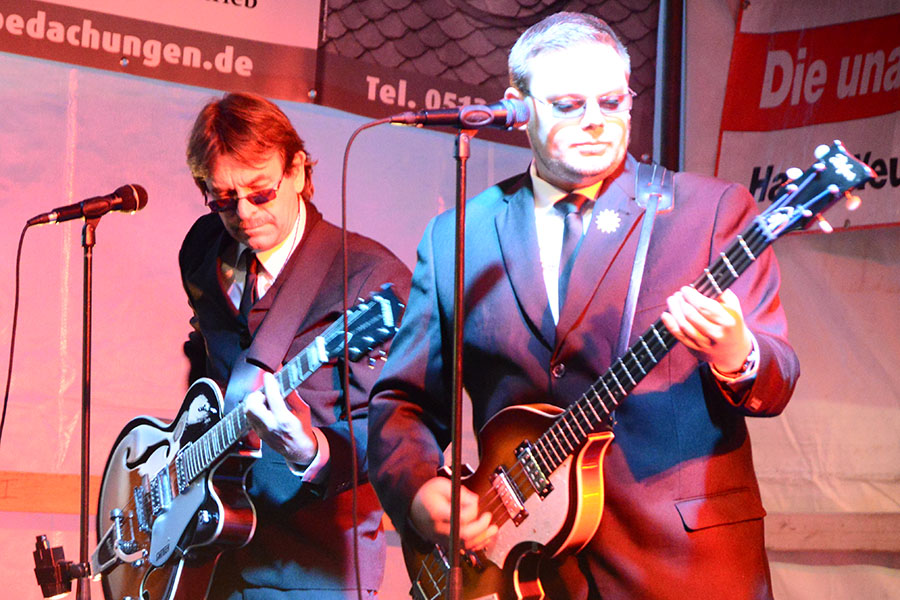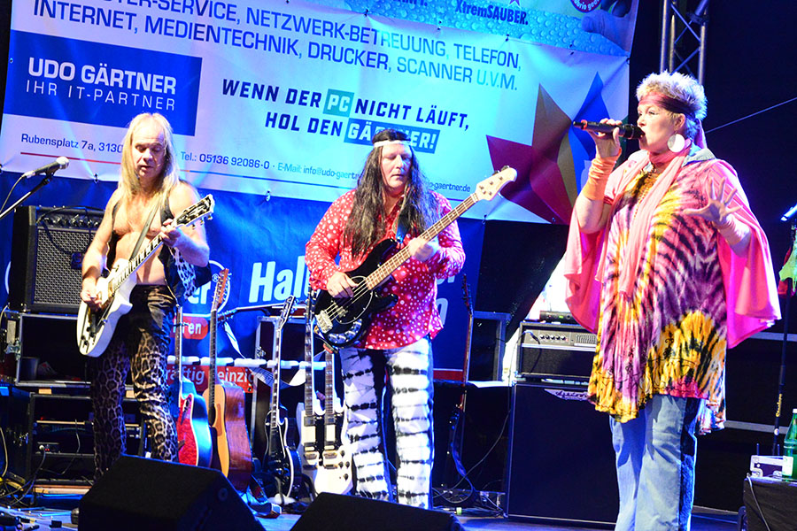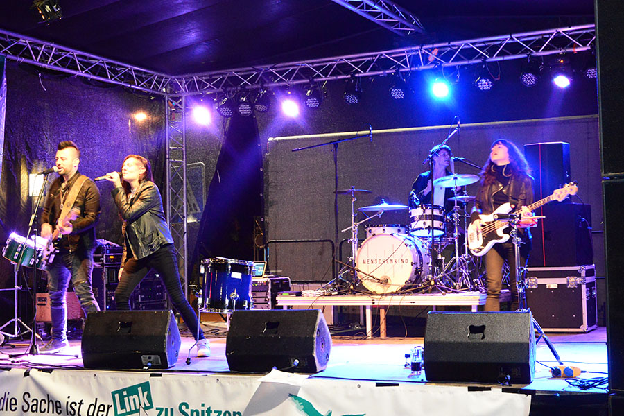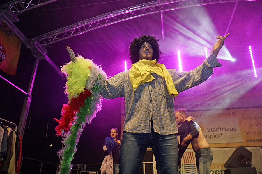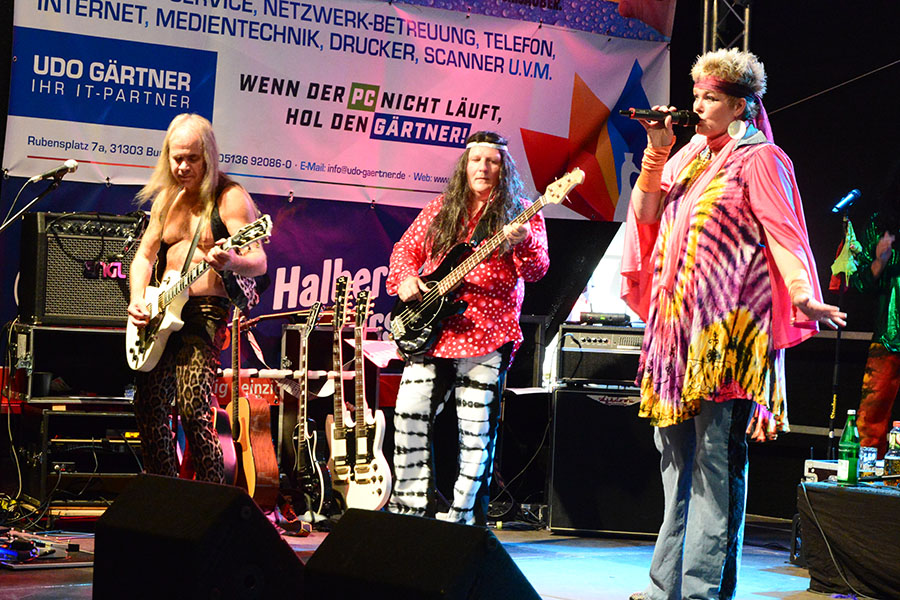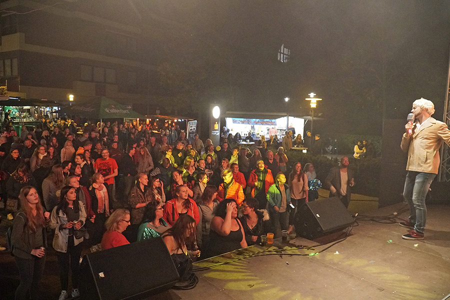 So konnte Rock mit TUSH auf der Bühne an der Poststraße genossen werden, Rock’n’Roll mit den Sidekicks bei den Junggesellen, deren Bühne hinter der Stadtsparkasse wieder ein Hotspot war, oder Menschenkind auf der Bühne am Kreisel. An der Post hatte das Studio B5 zur "ultimativen Show" eingeladen: In entsprechenden Outfits standen da mal Karel Gott, Udo Lindenberg oder Drafi Deutscher auf der Bühne und nach kurzer Zeit wurde zum nächsten Lied gewechselt. "Da kommen über den Abend rund 350 Lieder zusammen", so Berko Meyer vom Studio B5, der erstmals hierbei nicht selbst auf der Bühne stand sondern den Musik-Marathon als Zuschauer genoss.