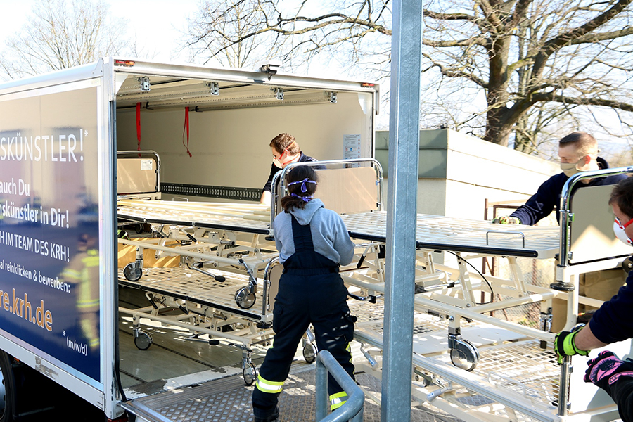 Corona-Virus: Feuerwehrkräfte transportieren rund 500 Betten zum Messegelände