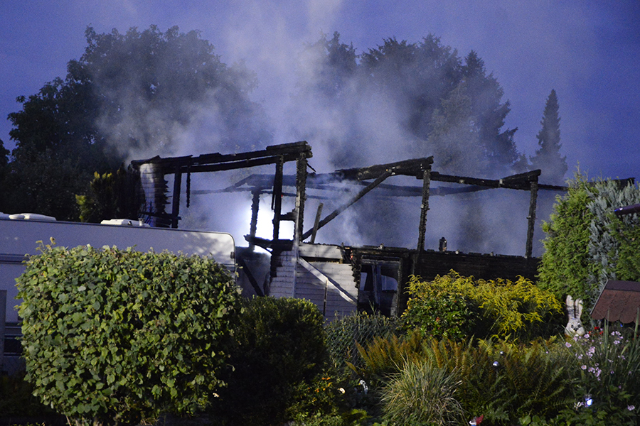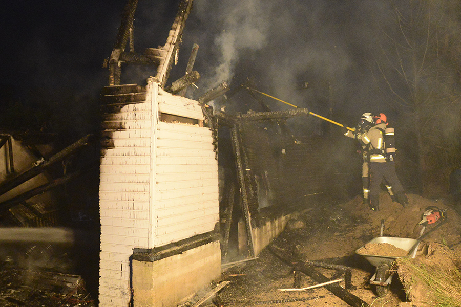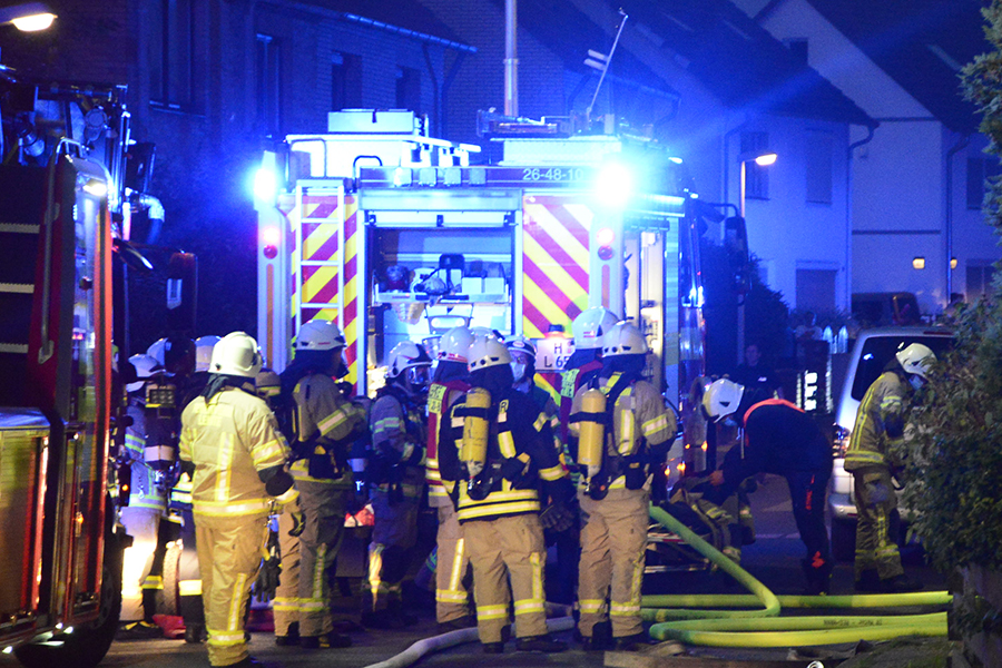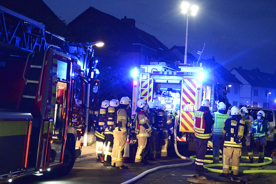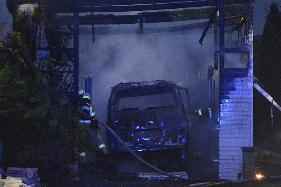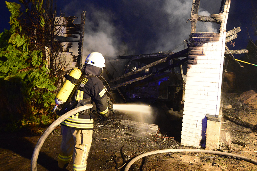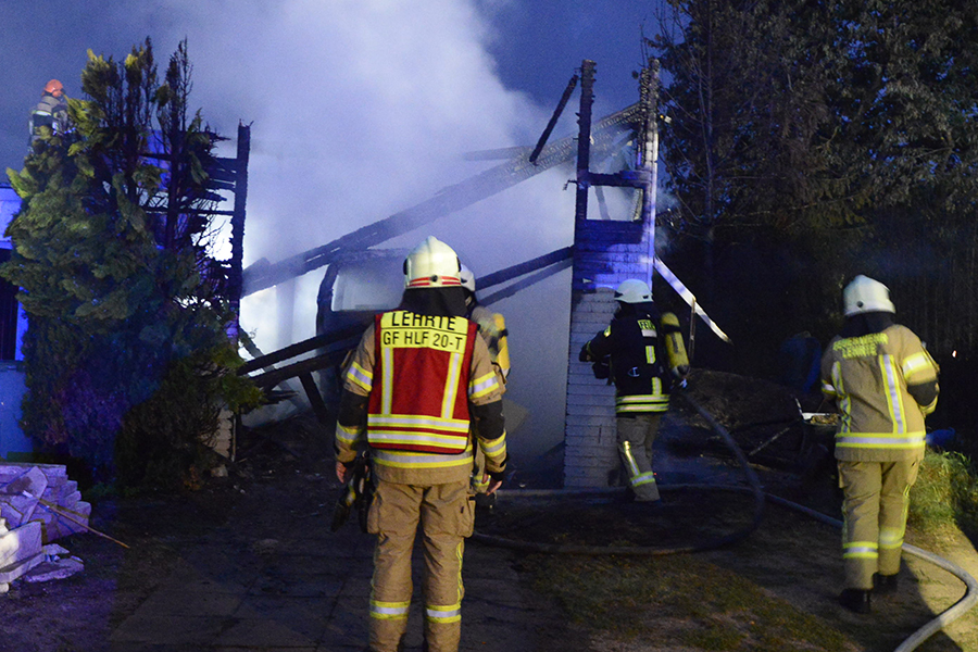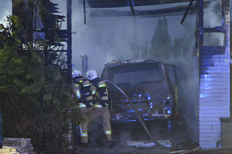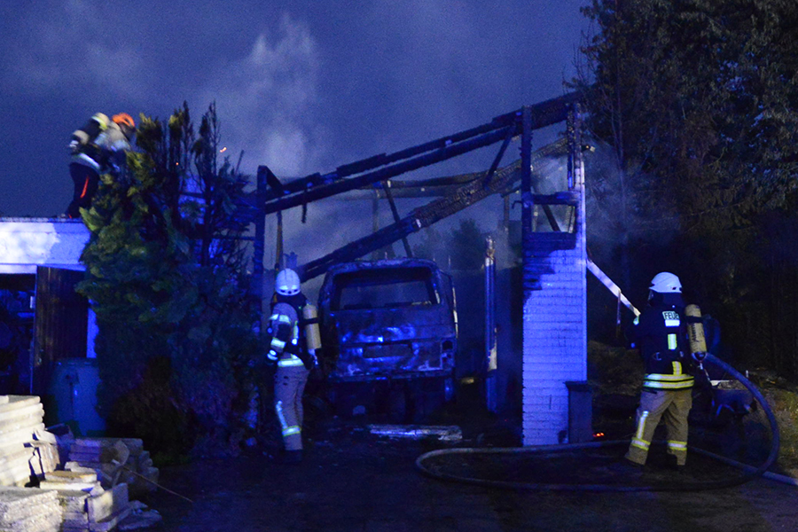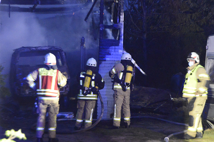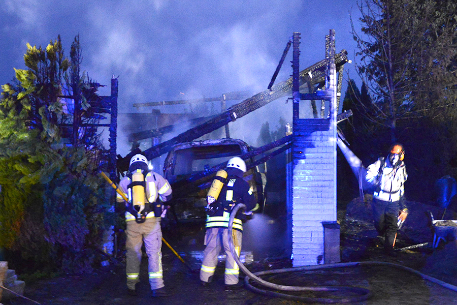 Der stellvertretende Ortsbrandmeister Marco Beimes, der auch den Einsatz leitete, fand bei seiner Ankunft mit dem ersten Löschfahrzeug allerdings keine gewöhnliche Garage vor. Ein etwa vier Meter hohes und rund 3×6 Meter großes Gebäude stand in Vollbrand und die Flammen waren bereits in Begriff, auf das angrenzende Wohngebäude überzugreifen.