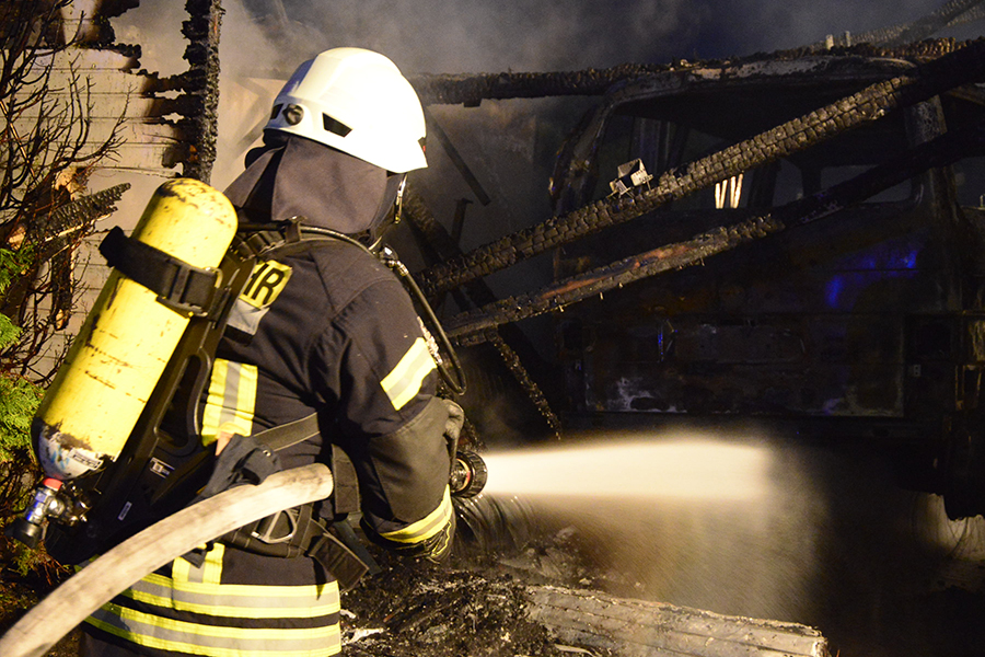 Er ließ zwei Trupps unter Atemschutz mit zwei C-Rohren vorgehen, die zunächst das Wohngebäude vor den Flammen schützten und die Flammen zurückschlugen. Bereits um 20:46 Uhr konnte an die Regionsleitstelle gemeldet werden, dass das Feuer unter Kontrolle ist. Das vollständige Abbrennen der Garage konnten die ehrenamtlichen Brandbekämpfer allerdings nicht mehr verhindern. Auch der in der Garage befindliche VW Transporter wurde bei dem Feuer komplett zerstört.