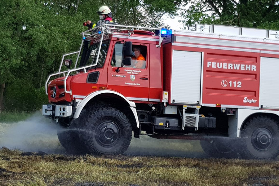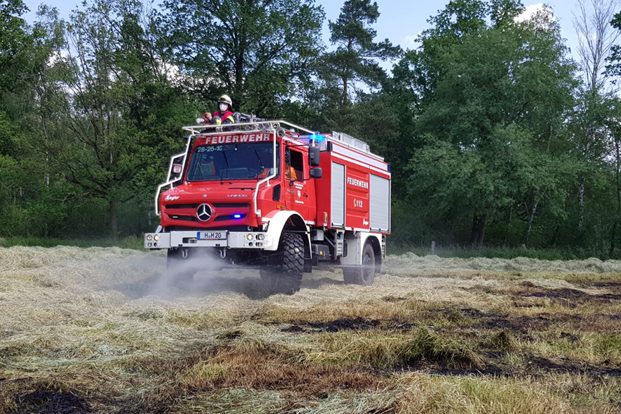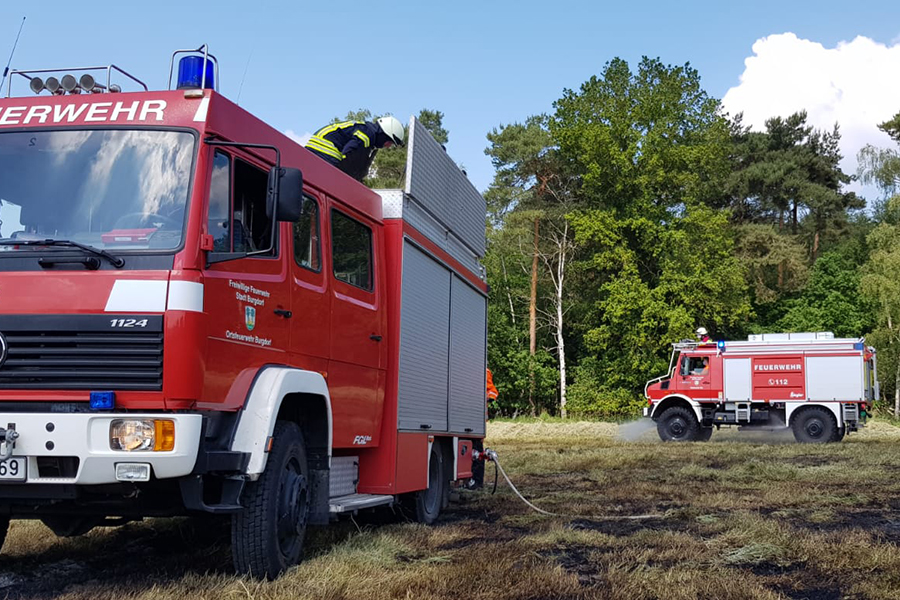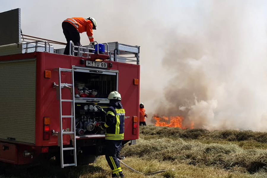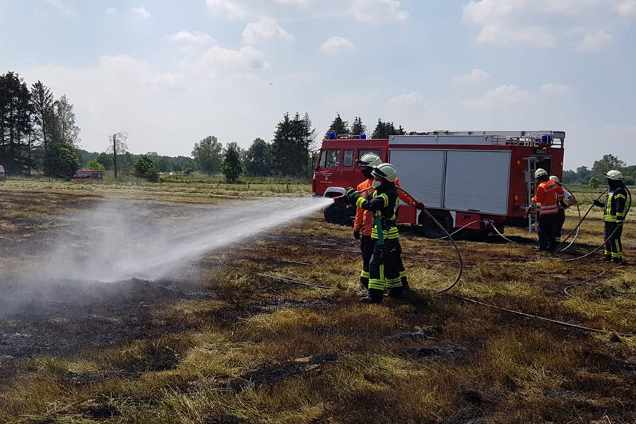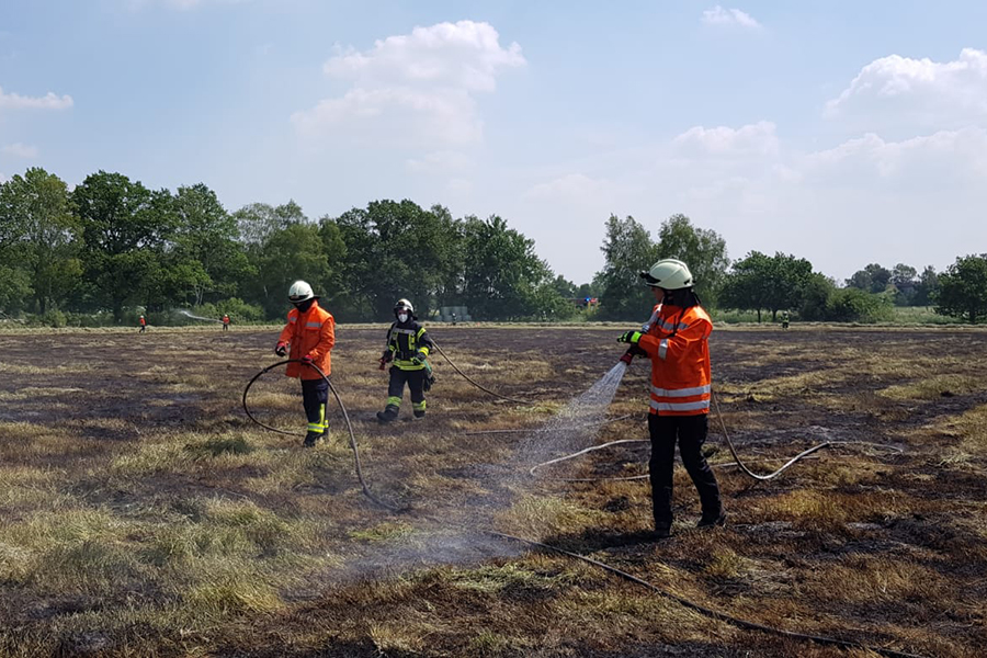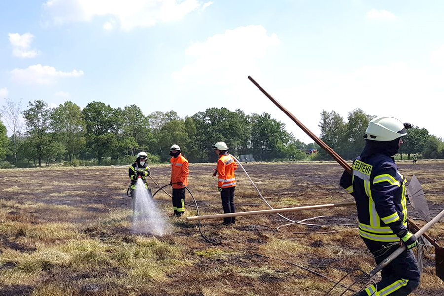 Die sehr warmen Temperaturen sowie die abgelegene Einsatzstelle führten zu einer besonderen Belastung der ehrenamtlichen Feuerwehrkräfte, die nicht nur mit Wasser, sondern auch beispielsweise mit Feuerpatschen vorgingen.