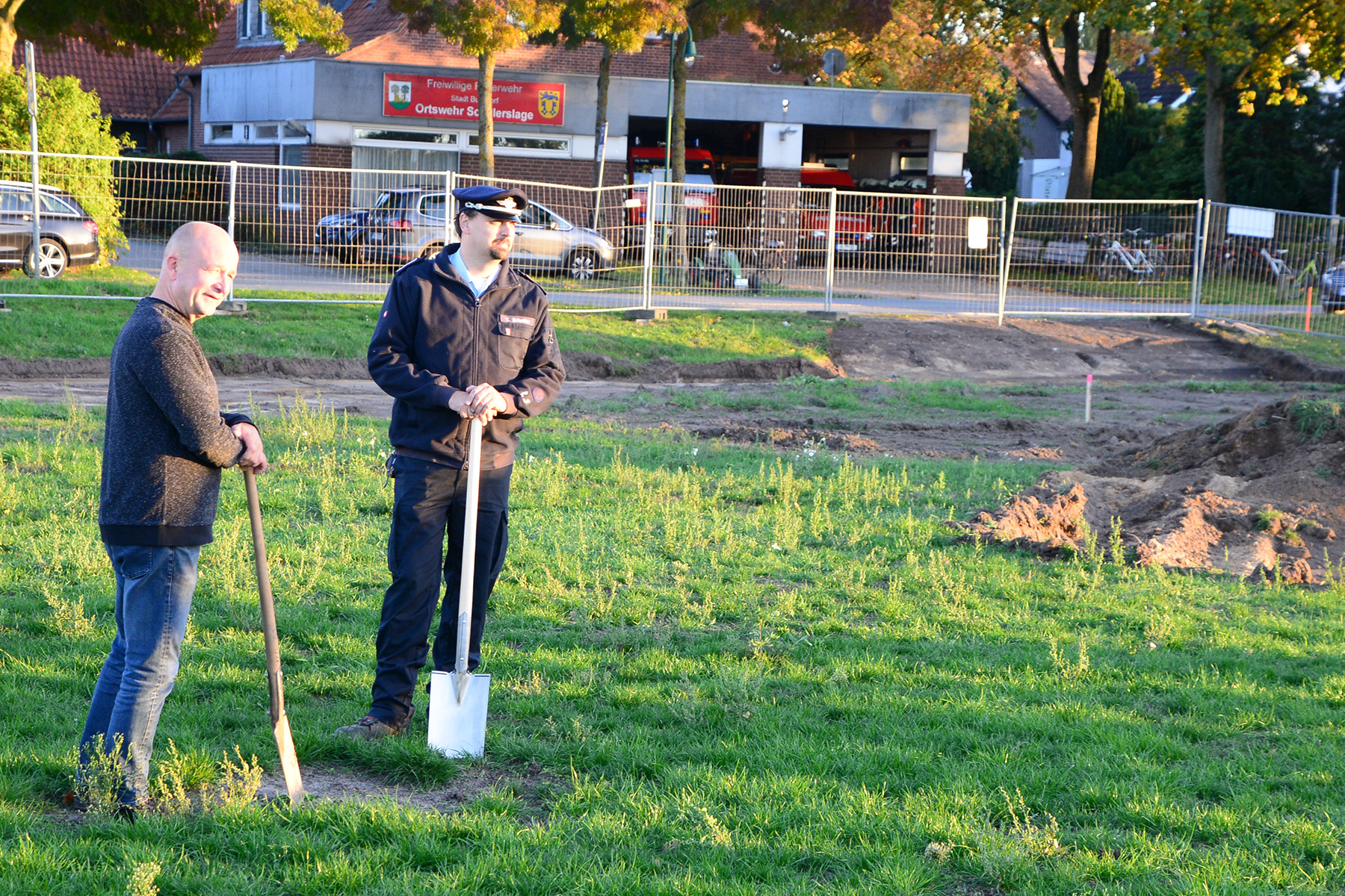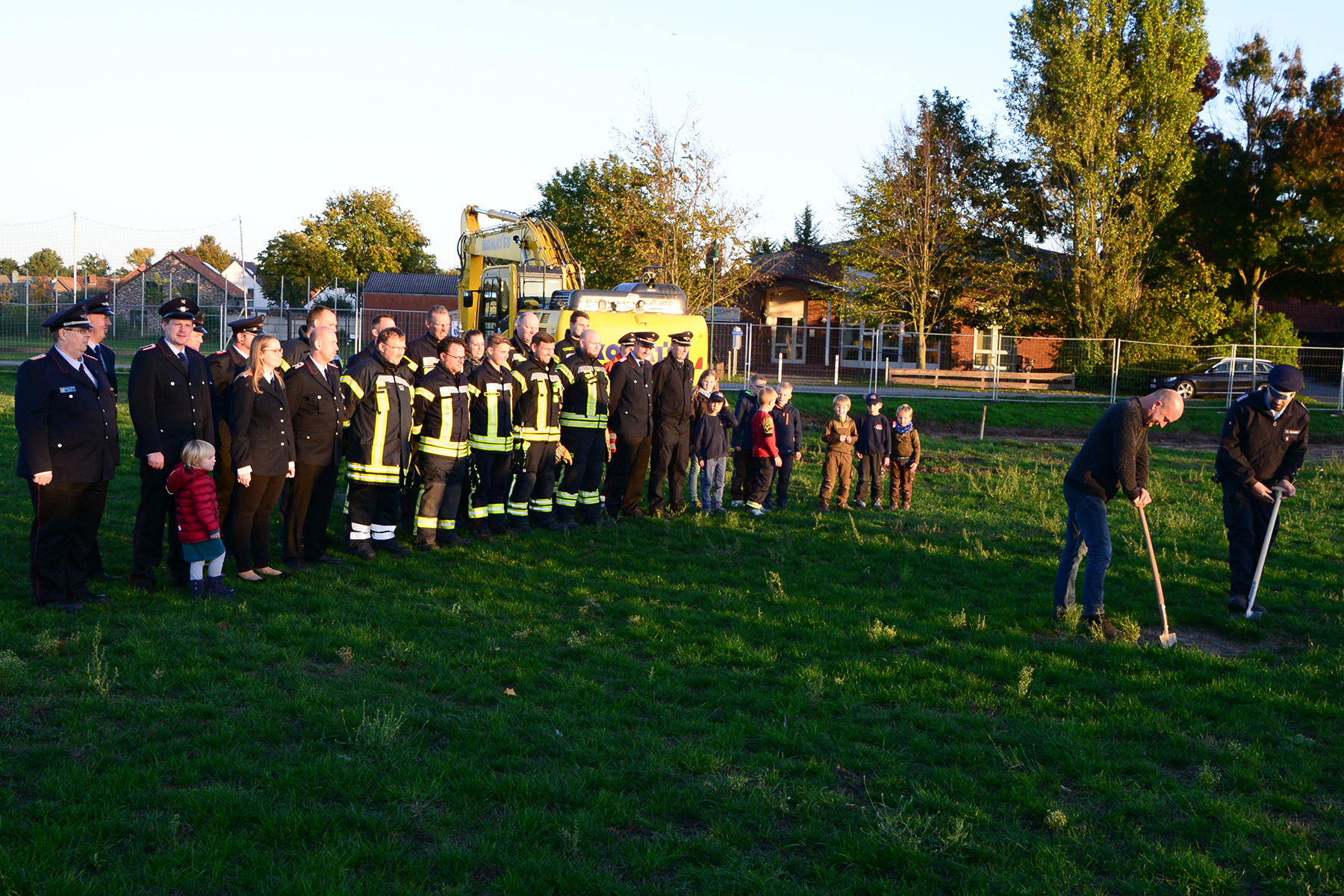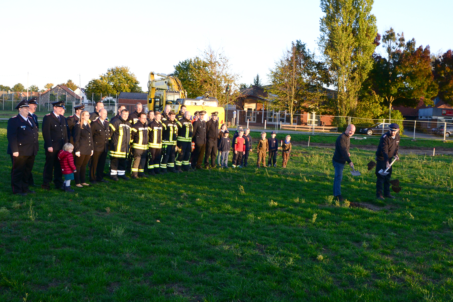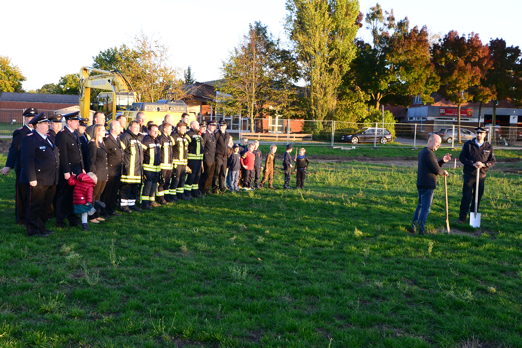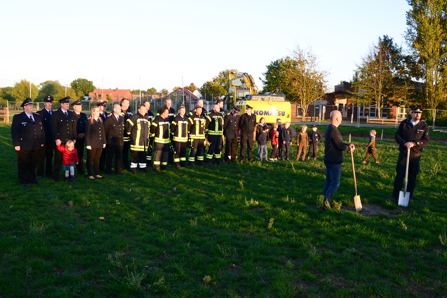 Da die Baustelle schon eingerichtet worden war, blieb es beim inoffiziellen Spatenstich, vorrangig durch Ortsfeuerwehr und Ortsrat initiiert. Doch auch wenn es keinen offiziellen Rahmen gab, applaudierten die rund 50 Anwesenden zur ersten Schippe auf dem neuen Gelände.