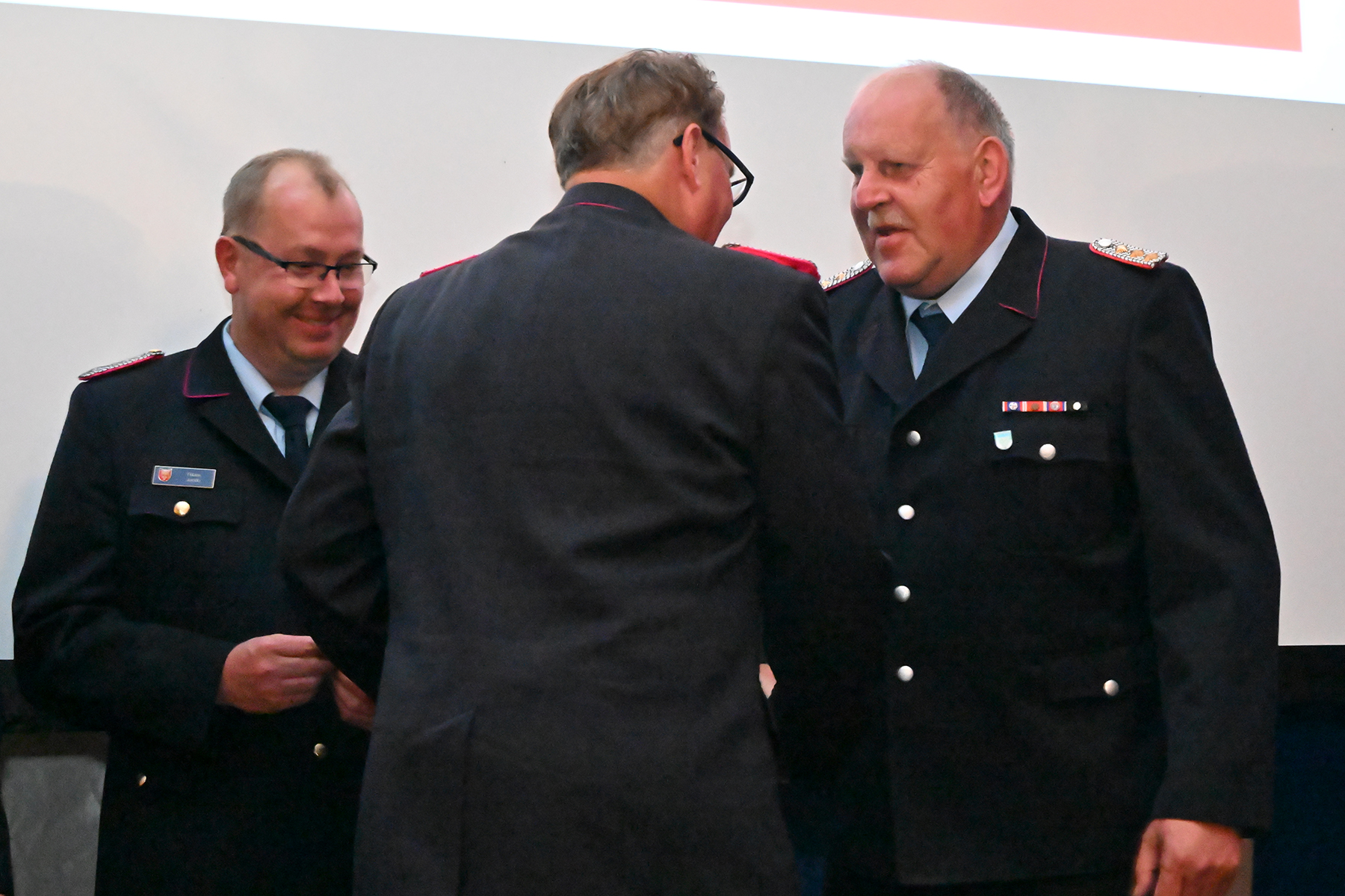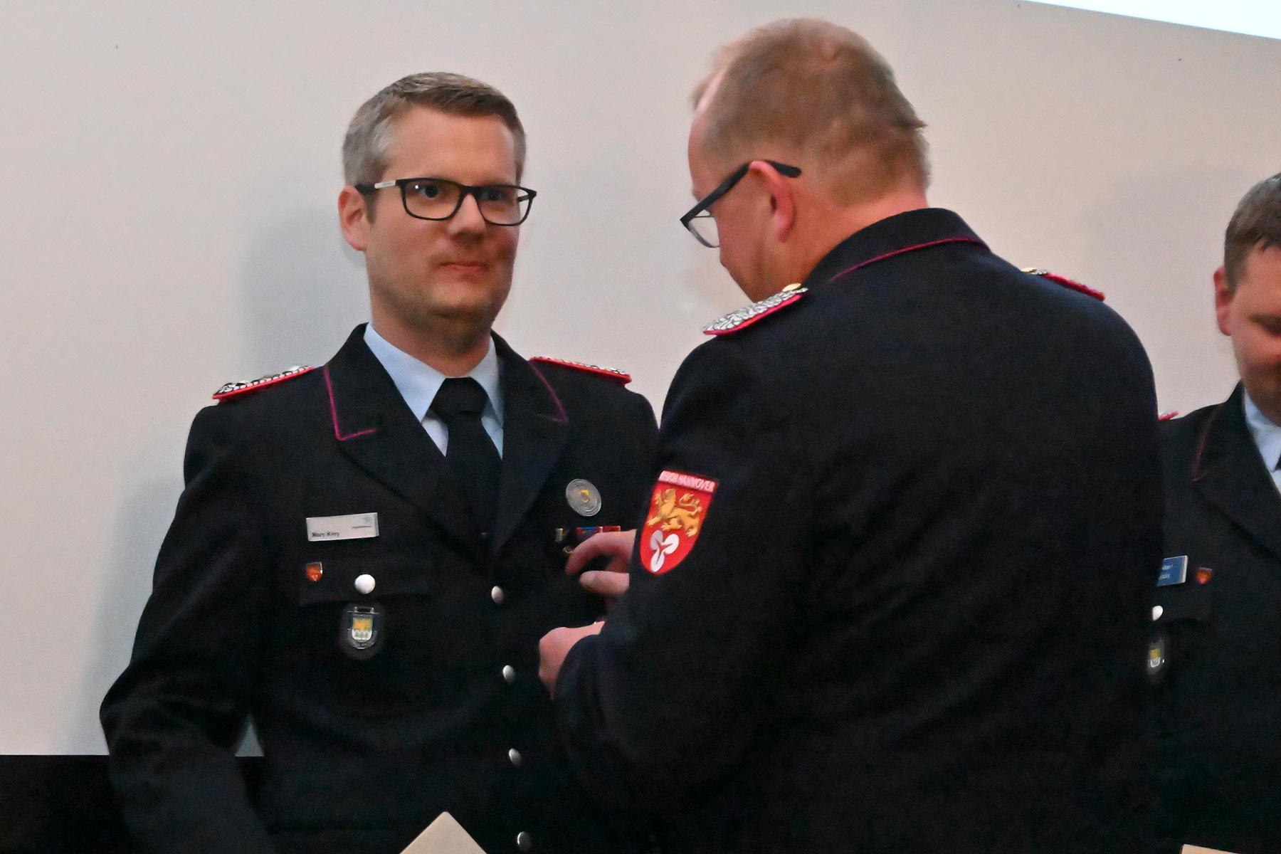 Regionsbrandmeister Mensing konnte zudem drei Ehrungen vornehmen. Reinhard Nicks erhielt in Anerkennung besonderer Verdienste das Silberne Feuerwehrehrenzeichen am Bande des Landes Niedersachsen. Mit dem Feuerwehrehrenzeichen am Bande, ebenfalls durch das Land Niedersachsen verliehen, wurde Marc-Robert Krey ausgezeichnet. Zudem erhielt Peter Nicks das Ehrenzeichen des Landesfeuerwehrverbandes für 50-jährige Mitgliedschaft in der Feuerwehr.