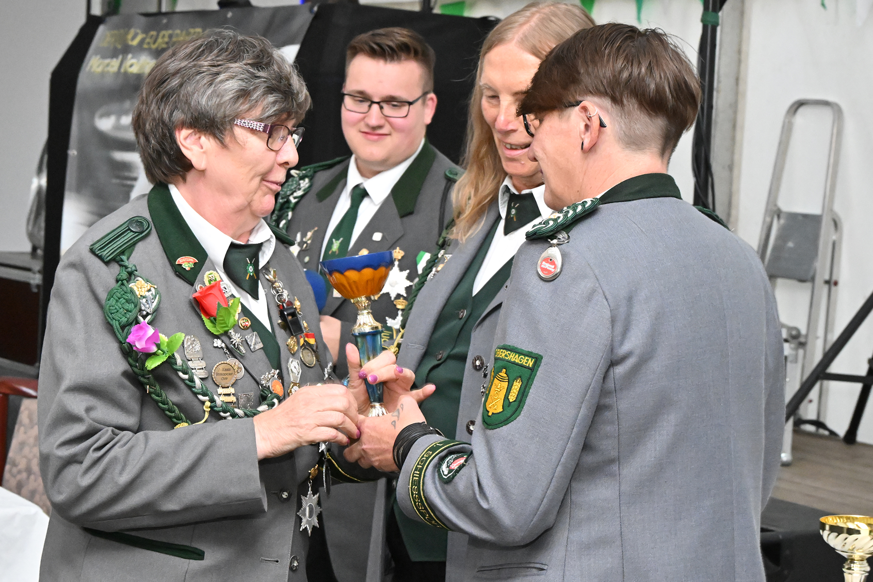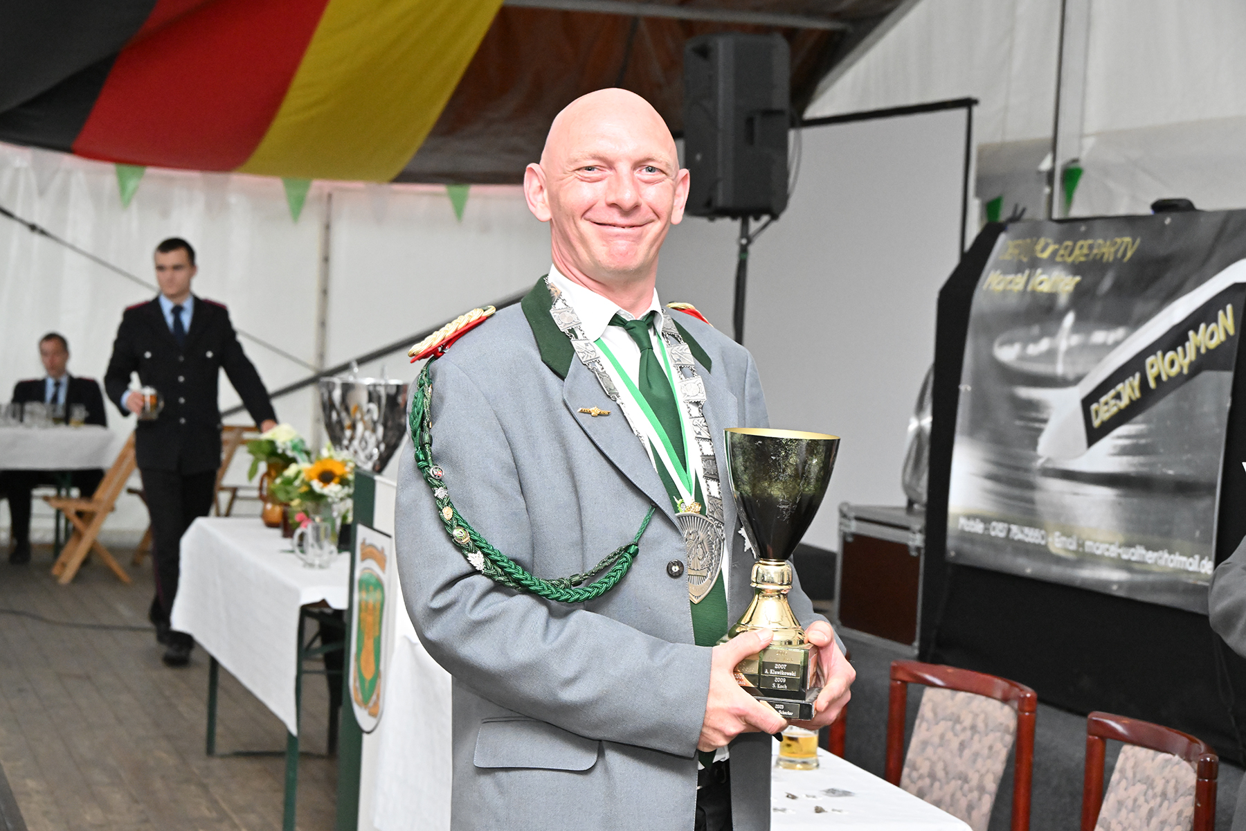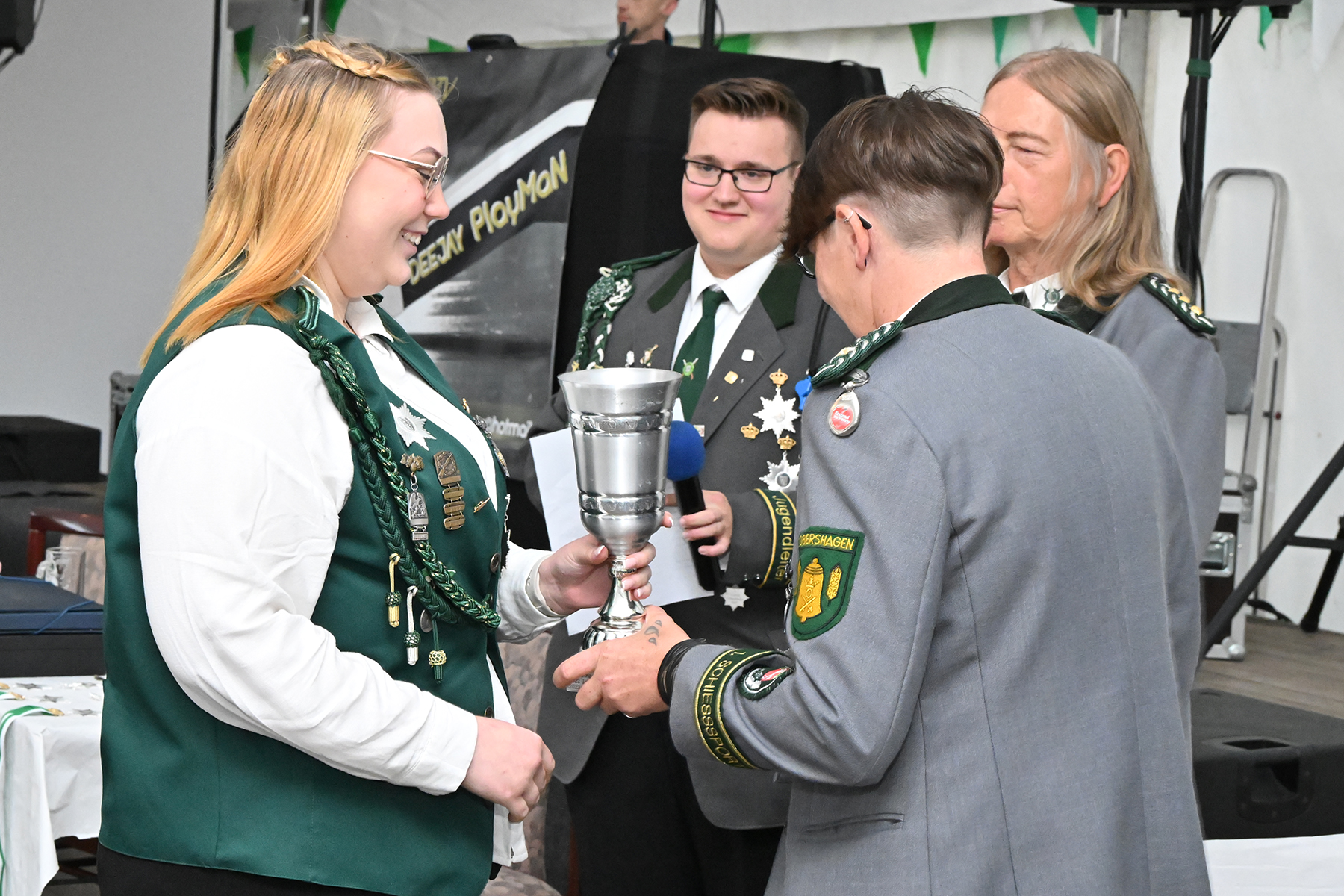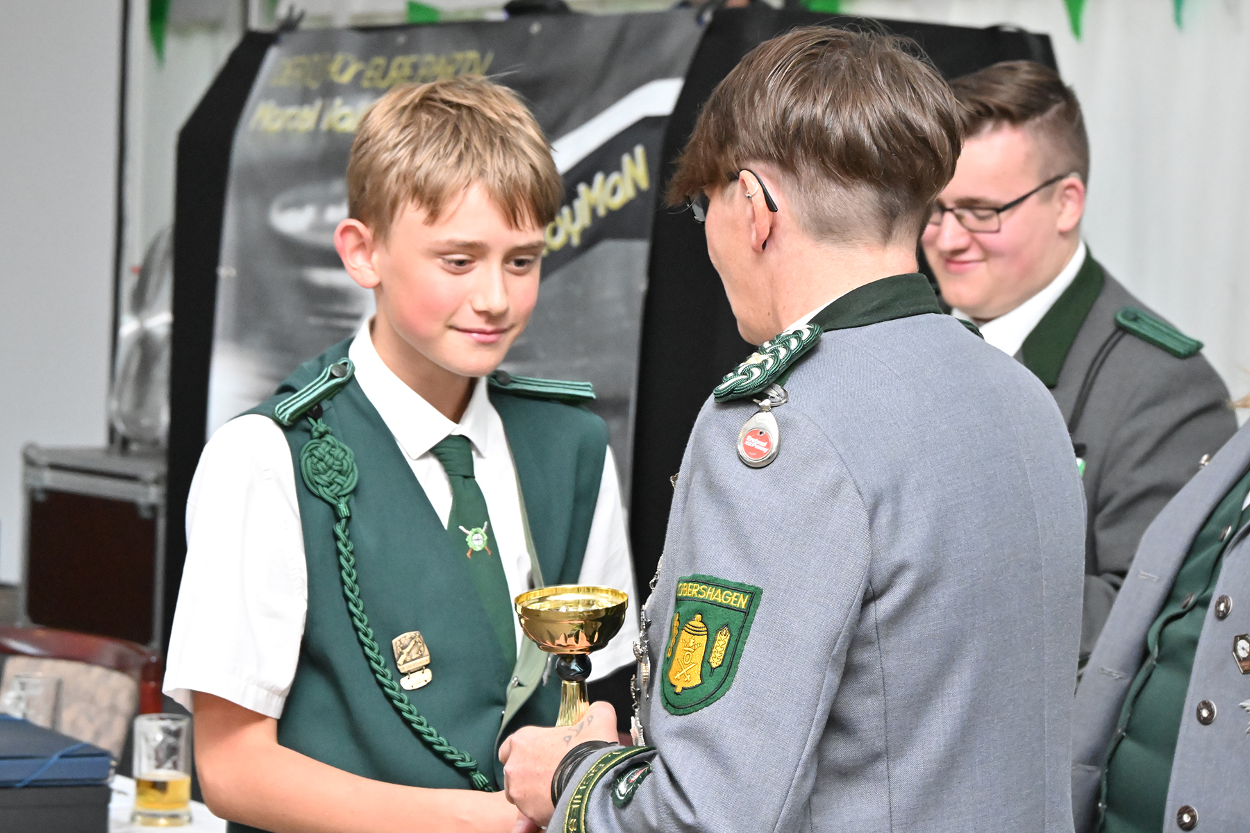 Ehe jedoch die neuen Majestäten bekannt gegeben wurden, standen die Preisverleihungen der Pokale auf dem Programm. Hier wurde schon ersichtlich, welche Namen beim Königsschießen ebenfalls eine große Rolle spielen könnten: Tobias Oskar Hoffmann, der sich den 21-Ring-Pokal, den 30-Ring-Pokal der Kinder, den 333-Teiler-Pokal und den Rote-Laterne-Pokal holte, ebenso wie sein Bruder Christopher Robin Hoffmann, der den Oppermann Kinder-Pokal gewann. Alicia Kohlmeyer sicherte sich den Nachwuchs-Pokal Jugend und den Jugend Wander-Pokal. Der Oppermann Jugend-Pokal ging an Marlon Kuschick und den Auenixen-Pokal holte sich Marie-Ann Beinsen. Plaketten gewannen Christopher Robin Hoffmann, Marlon Kuschick und Nadin Hoppe-Bukoll.