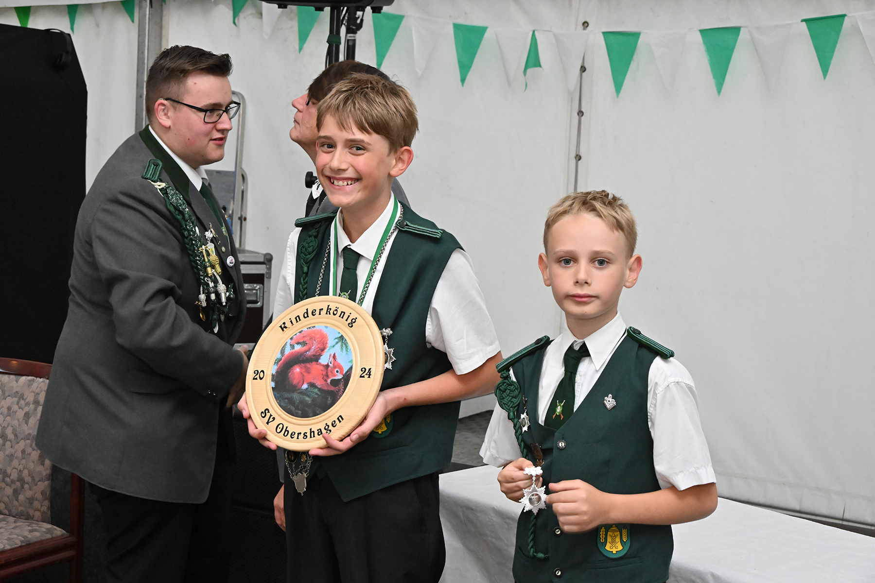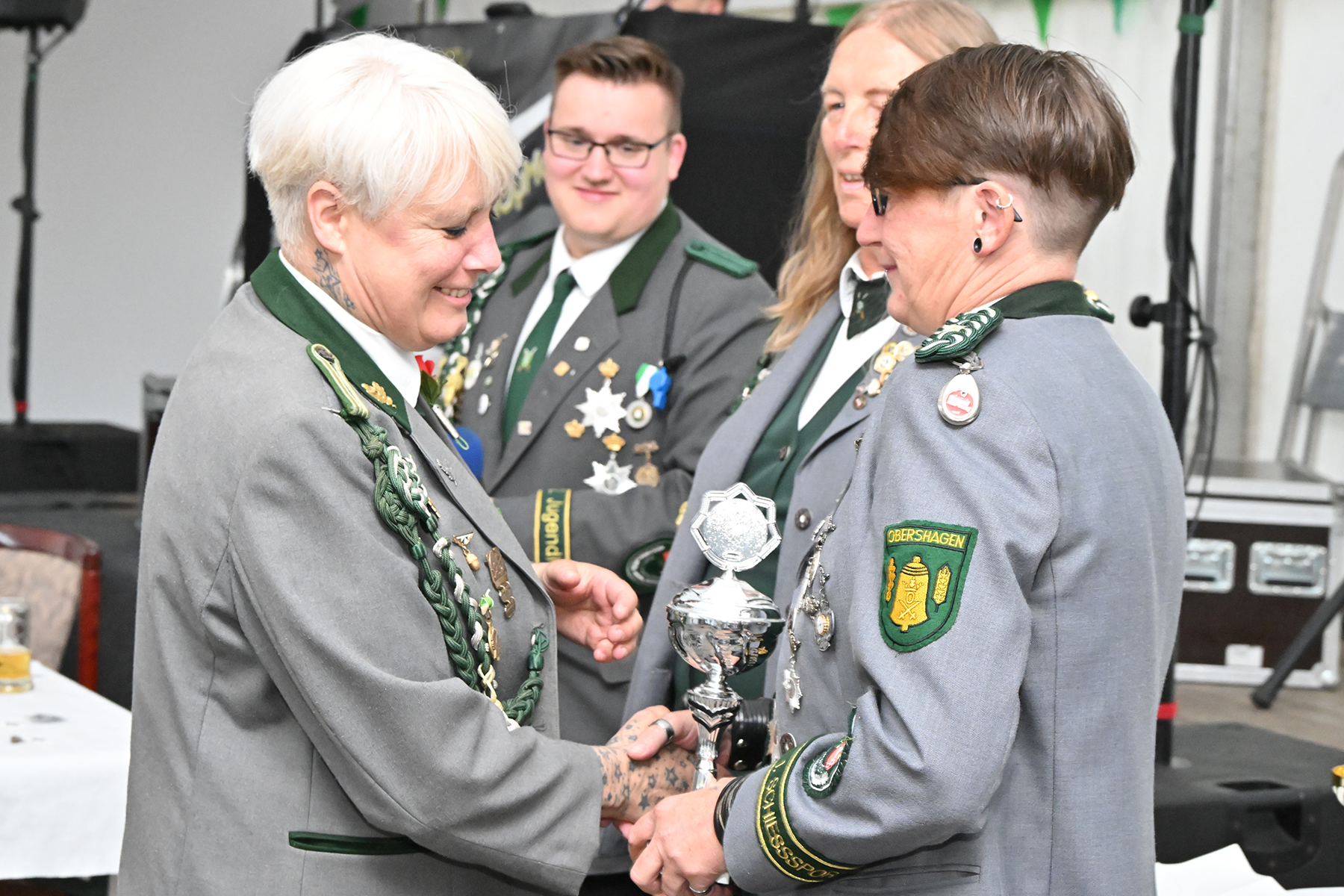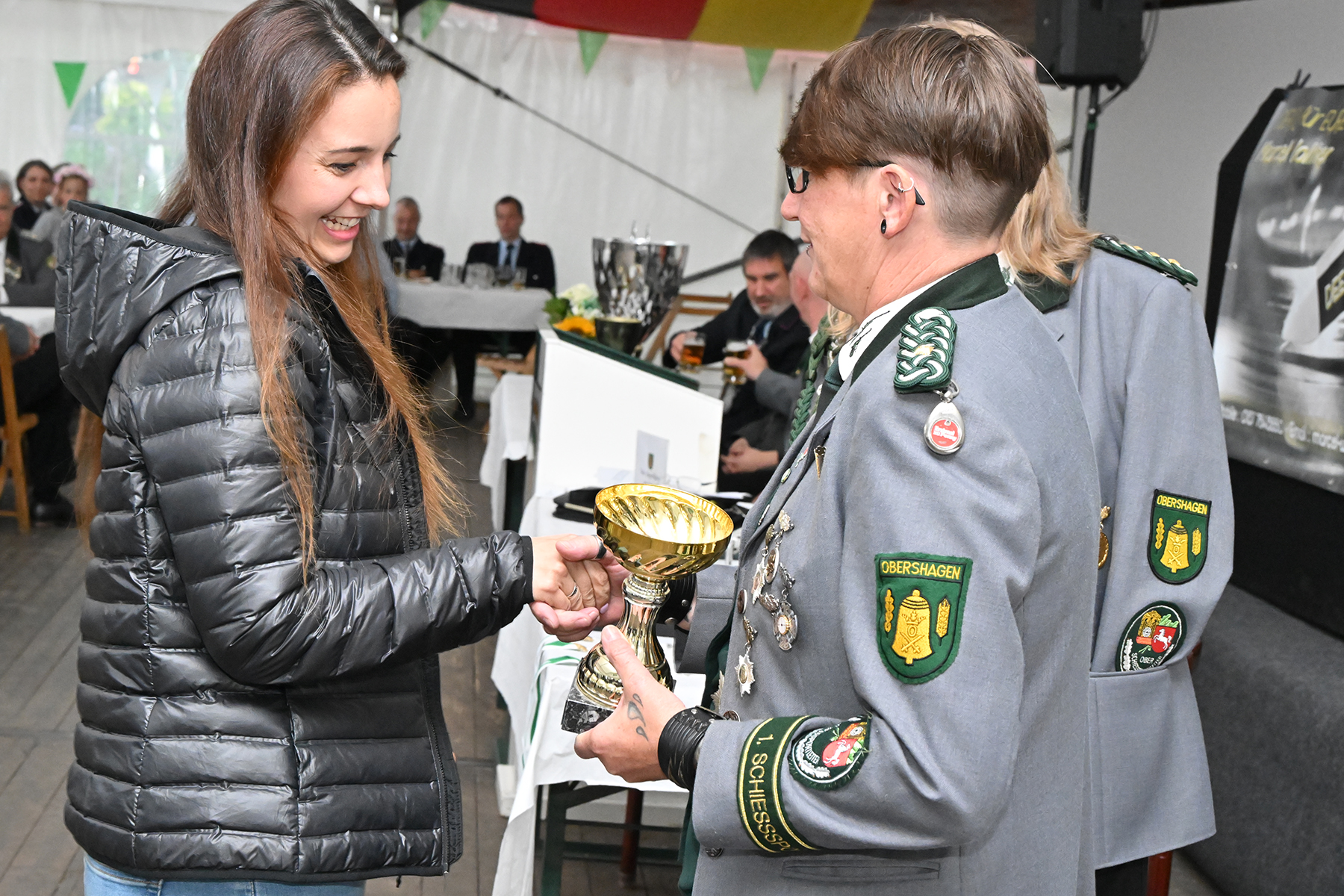 Ehe jedoch die neuen Majestäten bekannt gegeben wurden, standen die Preisverleihungen der Pokale auf dem Programm. Hier wurde schon ersichtlich, welche Namen beim Königsschießen ebenfalls eine große Rolle spielen könnten: Tobias Oskar Hoffmann, der sich den 21-Ring-Pokal, den 30-Ring-Pokal der Kinder, den 333-Teiler-Pokal und den Rote-Laterne-Pokal holte, ebenso wie sein Bruder Christopher Robin Hoffmann, der den Oppermann Kinder-Pokal gewann. Alicia Kohlmeyer sicherte sich den Nachwuchs-Pokal Jugend und den Jugend Wander-Pokal. Der Oppermann Jugend-Pokal ging an Marlon Kuschick und den Auenixen-Pokal holte sich Marie-Ann Beinsen. Plaketten gewannen Christopher Robin Hoffmann, Marlon Kuschick und Nadin Hoppe-Bukoll.