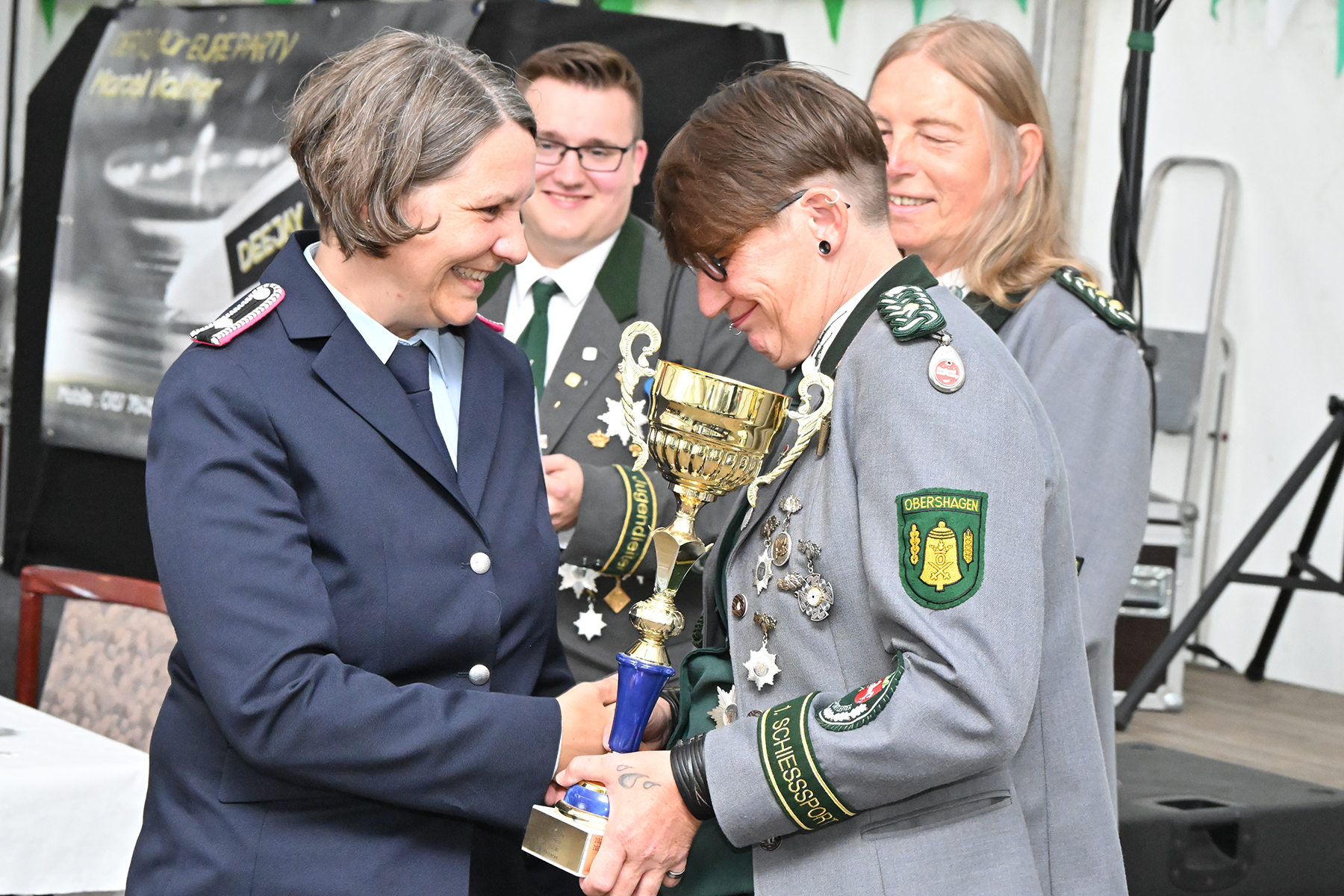 Gejubelt wurde auch beim TSV Eintracht Obershagen und bei der Feuerwehr, die jeweils auch eigene Pokale ausgeschossen hatten. Den Feuerwehr-Pokal holte sich Nadin Hoppe-Bukoll und der Pokal des Sportvereins ging an Noah Kahle. "Wenn ihr guten Fußball sehen wollt, müsst ihr nach Oberhagen kommen", so der Vorsitzende Tim Schreiber bezugnehmend auf das Viertelfinal-EM-Aus der deutschen Nationalmannschaft. "Nach dem Doppelaufstieg um vergangenem Jahr und dem weiteren Aufstieg der 1. Herrenmannschaft spielt diese nun in der Kreisliga", betonte er.