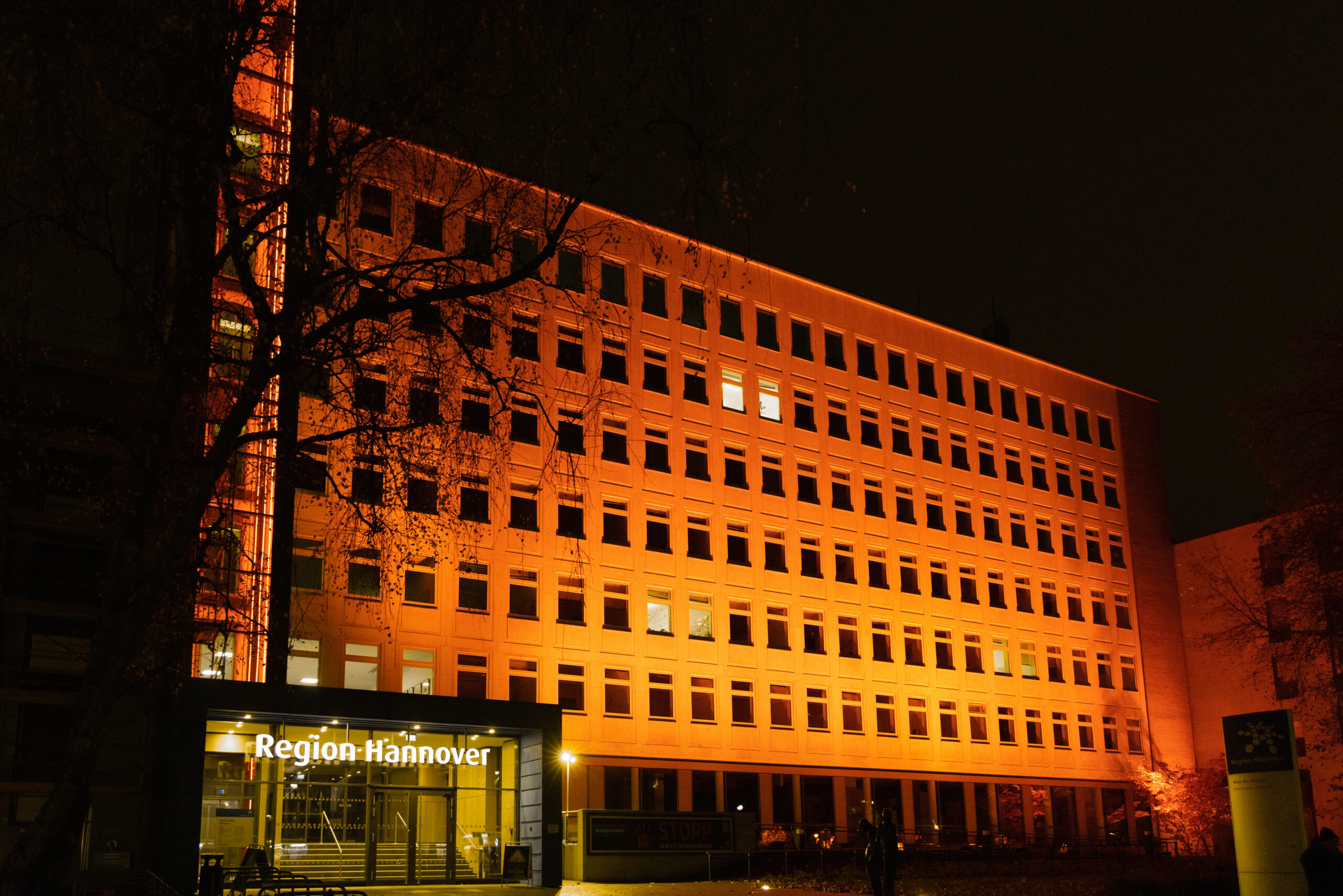 Das Regionshaus leuchtet, um ein Zeichen gegen Gewalt an Mädchen und Frauen zu setzen
